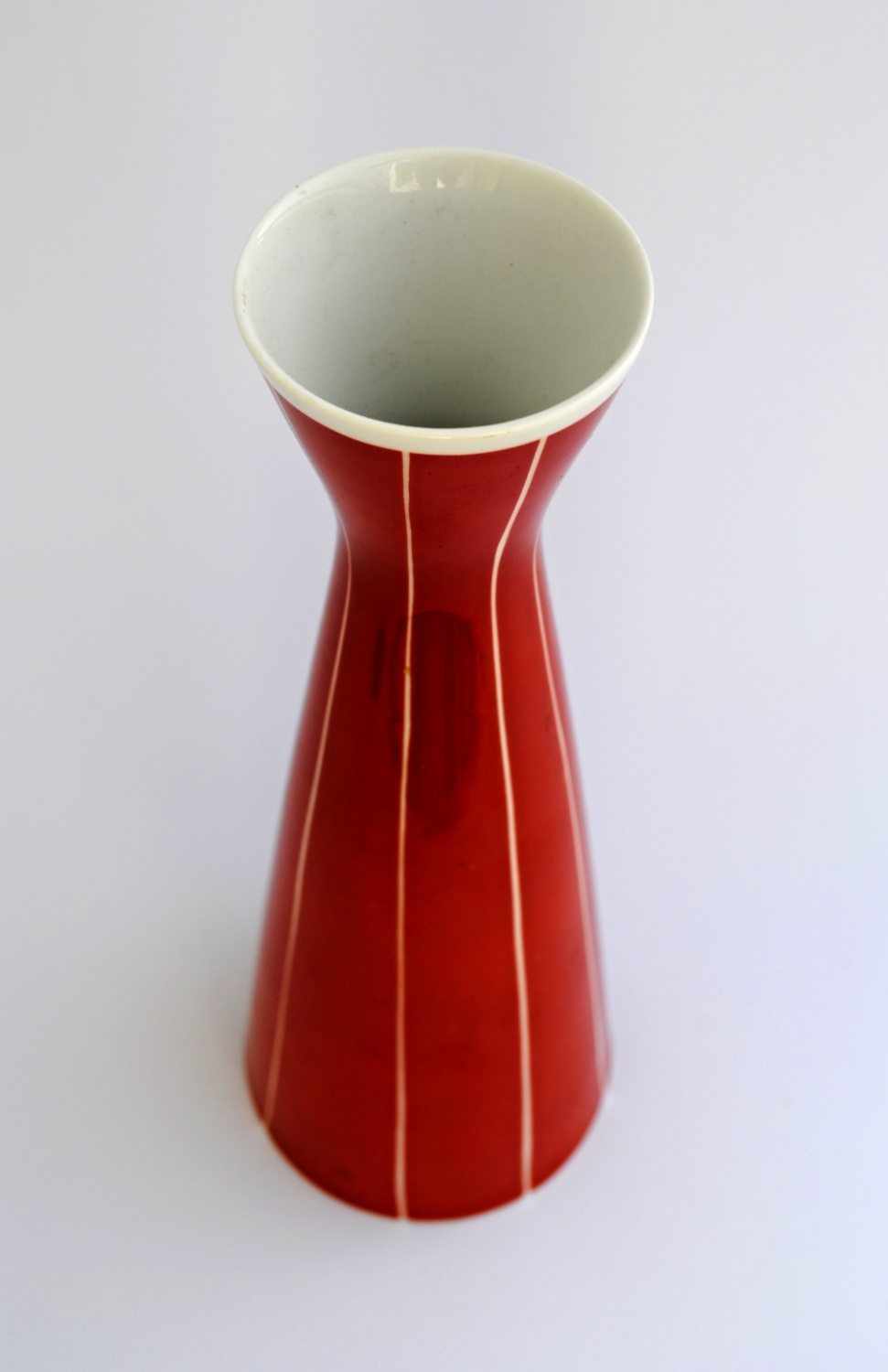 Porcelánová váza s červenobílými pruhy, s úzkým hrdlem, 60. léta 20. století; výška 26,5 cm