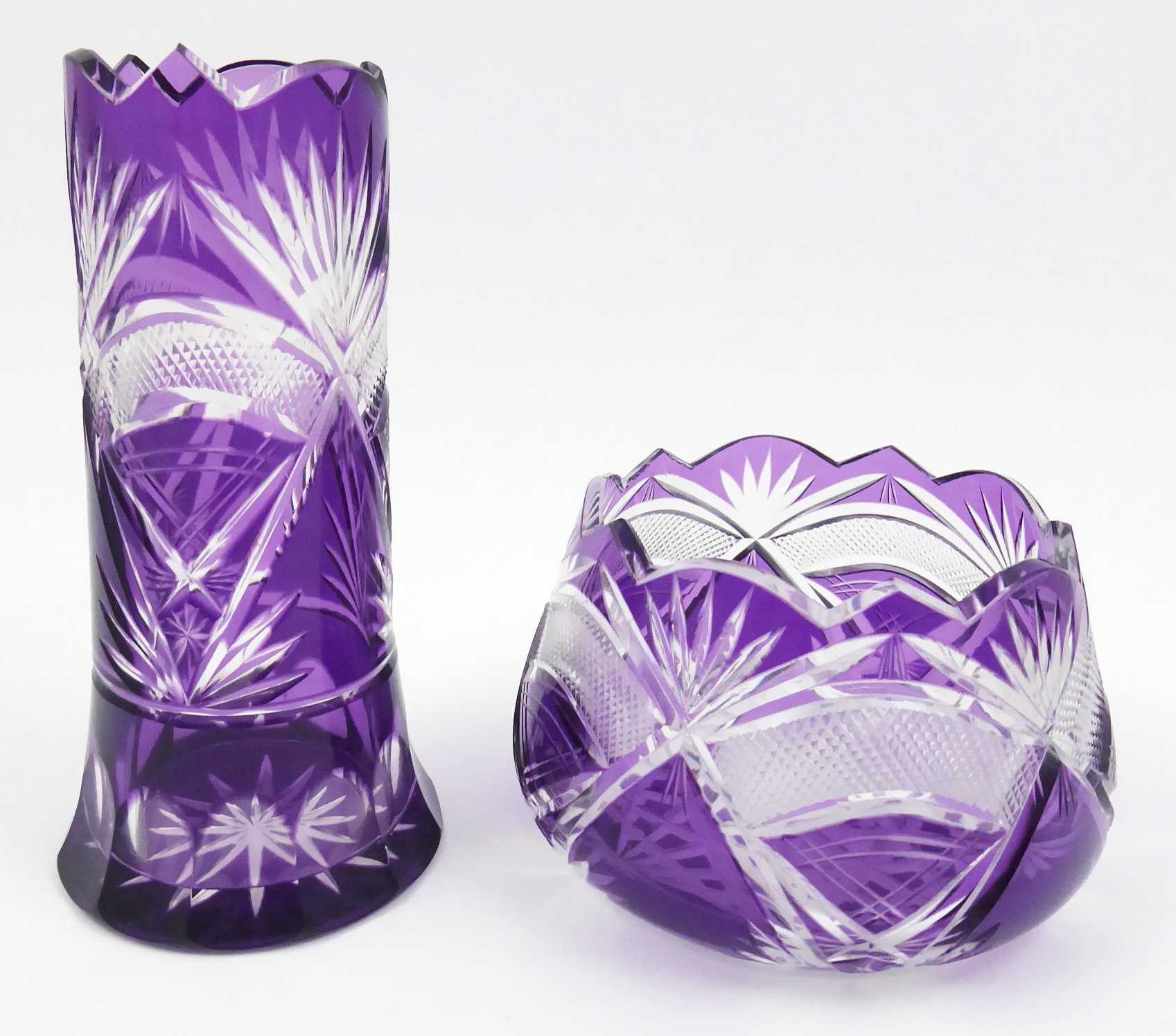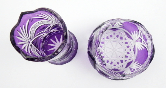 Křišťálové a fialové ručně broušené sklo. Ve stylu art deco. Set vázičky a misky z bezbarvého skla přejímaného ametystovou lazurou zdobené křížovým a klínovým brusem. Na spodní části vázičky navíc broušené fazety s horním obloukovitým zakončením. Na dvou neviditelných místech uvnitř malé poškození. Československo 1925 – 1950. Výška vázičky 18 cm , výška misky 8,5 cm, průměr misky 14 cm.
