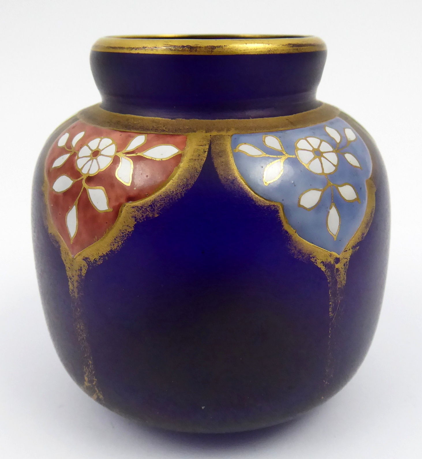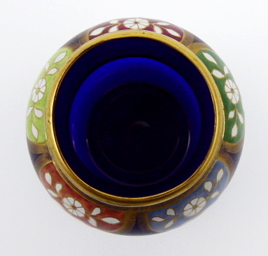 Kobaltové irizované sklo, ruční malba barevným emailem, ruční zlacení. Ve stylu proslulého Fritze Heckerta. Velmi zajímavá vázička z kobaltového irizovaného skla soudkovitého tvaru se zúženým hrdlem. Horní polovina vázičky je zdobená orientálním dekorativním ornamentem s florálními motivy (tzv. arabeska). Každé pole je ručně malované jinou emailovou barvou a ohraničené zlacením. Jednotlivé barevné segmenty zdobí drobná bílá kvítka s lístečky a zlatými úponky. Zlacené linky. Zlacení je zejména ve spodní části místy setřelé. Střední Evropa 1880 – 1900. Výška 7,5 cm.