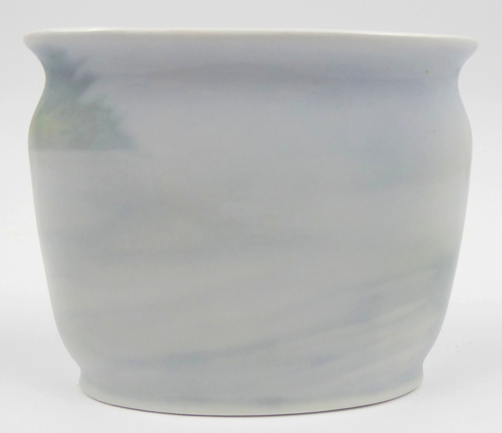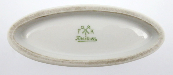Bílý a barevný porcelán. Porcelánová manufaktura Friedrich Kästner (1855-1924) založená roku 1883 v Oberhohndorfu v Sasku. Porcelánová vázička atypického tvaru, viz rozměry, dekorovaná kachnou s káčaty plujícími na zčeřelé vodní hladině lemované v popředí rákosím a vzrostlými stromy v pozadí. Ve vynikajícím stavu. Značeno zespodu: značka výrobce a písmena O Z znamenající Oberhohndorf bei Zwickau. Německo, Oberhohndorf bei Zwickau 1920 – 1930. Výška 10 cm, šířka 12 cm, hloubka 4,5 cm.