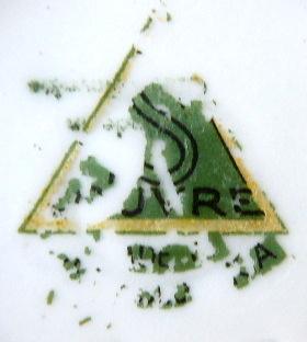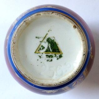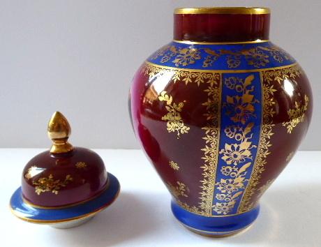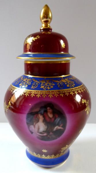 Bílý, malovaný a zlacený porcelán. Zdobená v horní části, zlaceným ornamentem ( pásem ). Střední část s dvěma medailony, s tištěným galantním motivem. Zlacené linky. Odklopné, klenuté víčko se zlaceným úchytem. Značená zespodu nečitelně. Evropa 1910 – 1940. Výška 17 cm.