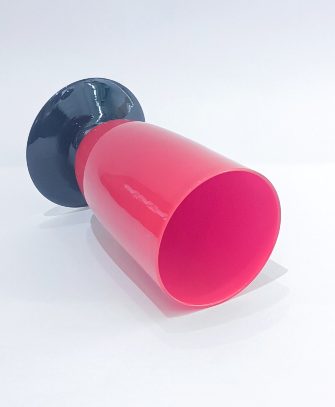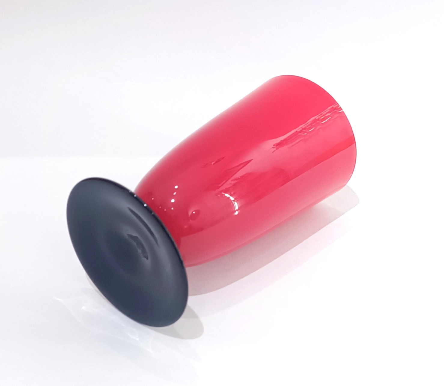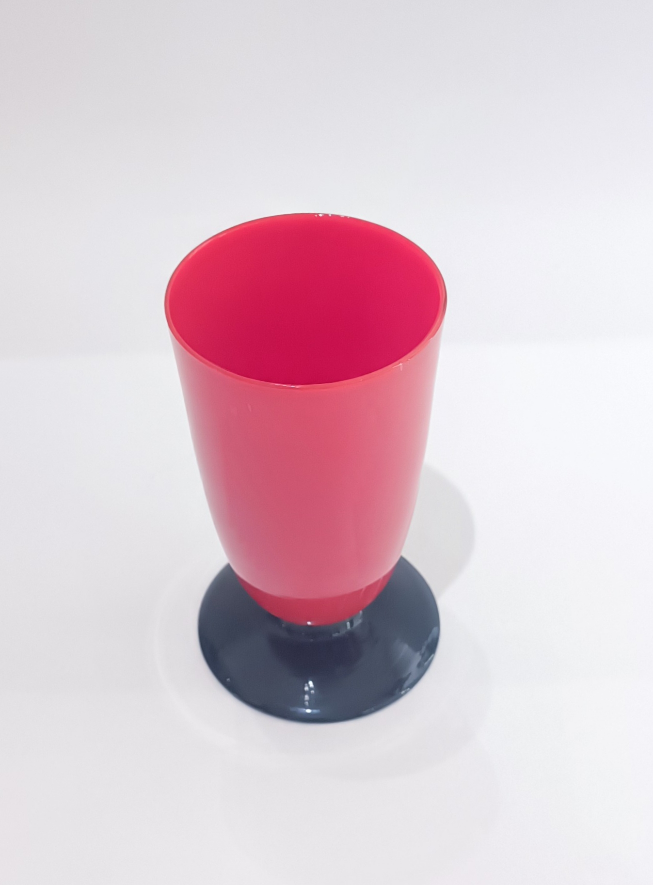 Skleněná vázička, červeno černé opakní sklo, model tzv. Tango, sklárna Riedl – Polubný, 30. léta 20. století; výška 14 cm, průměr vrchní části 4,3 cm