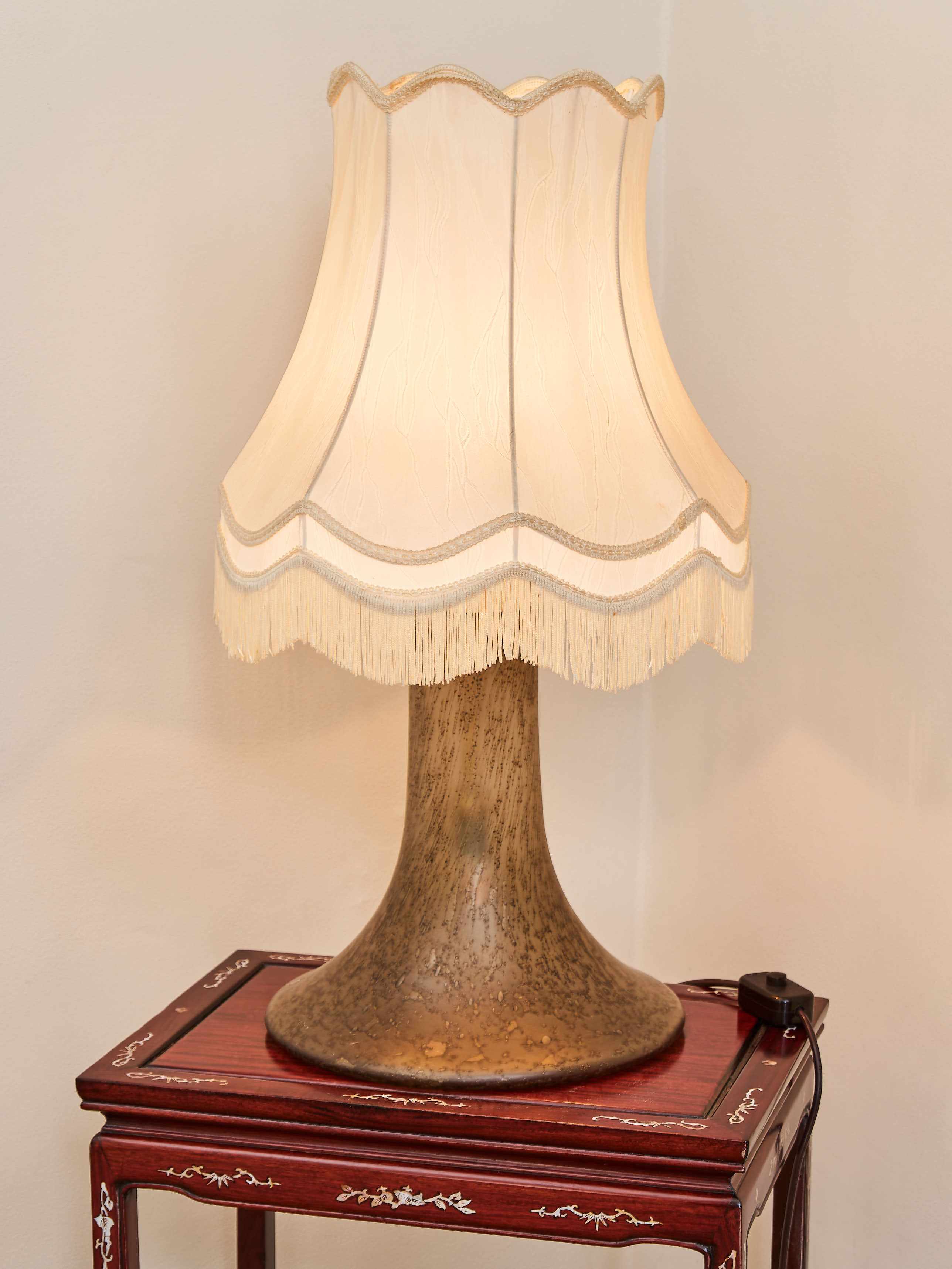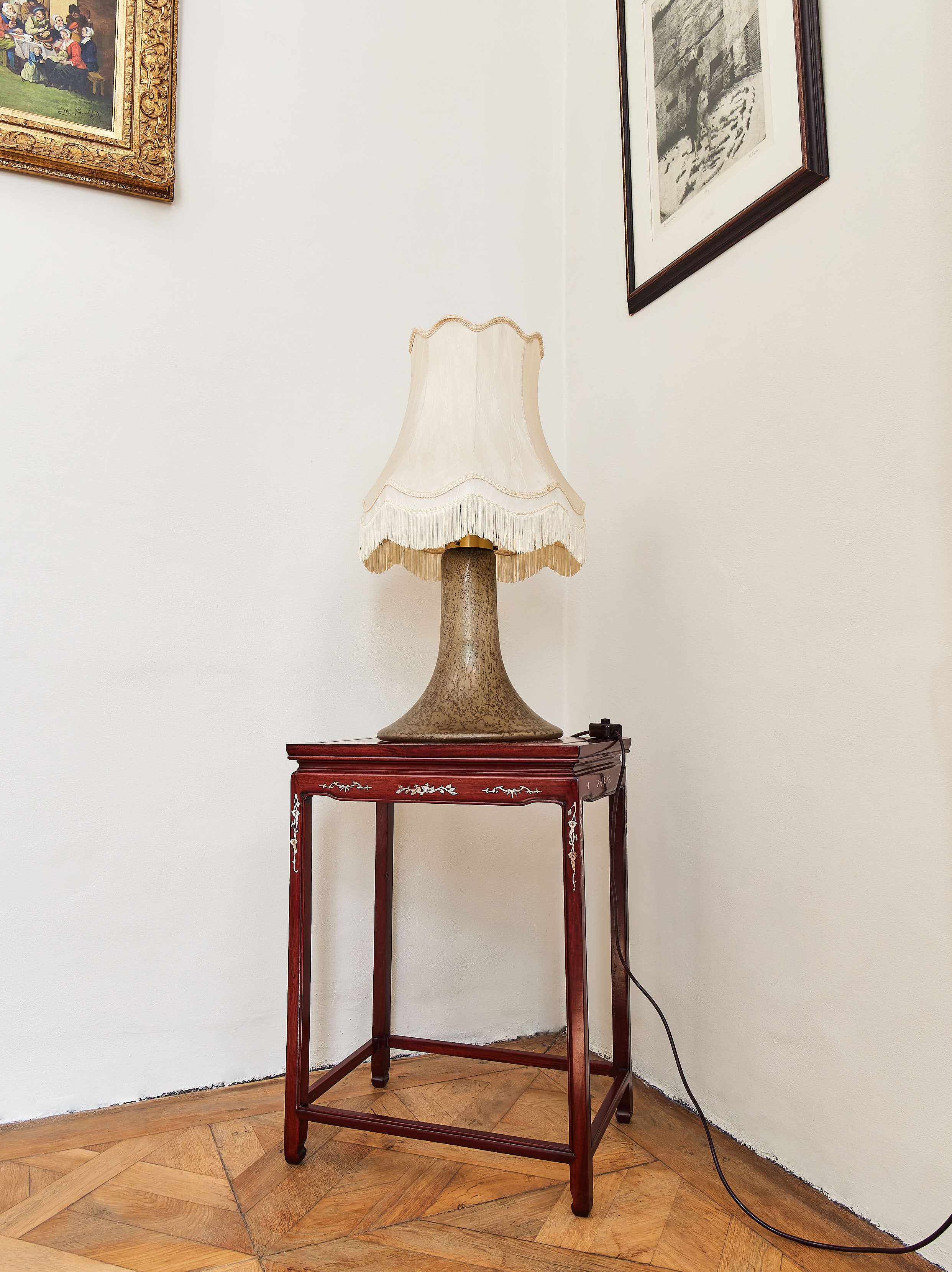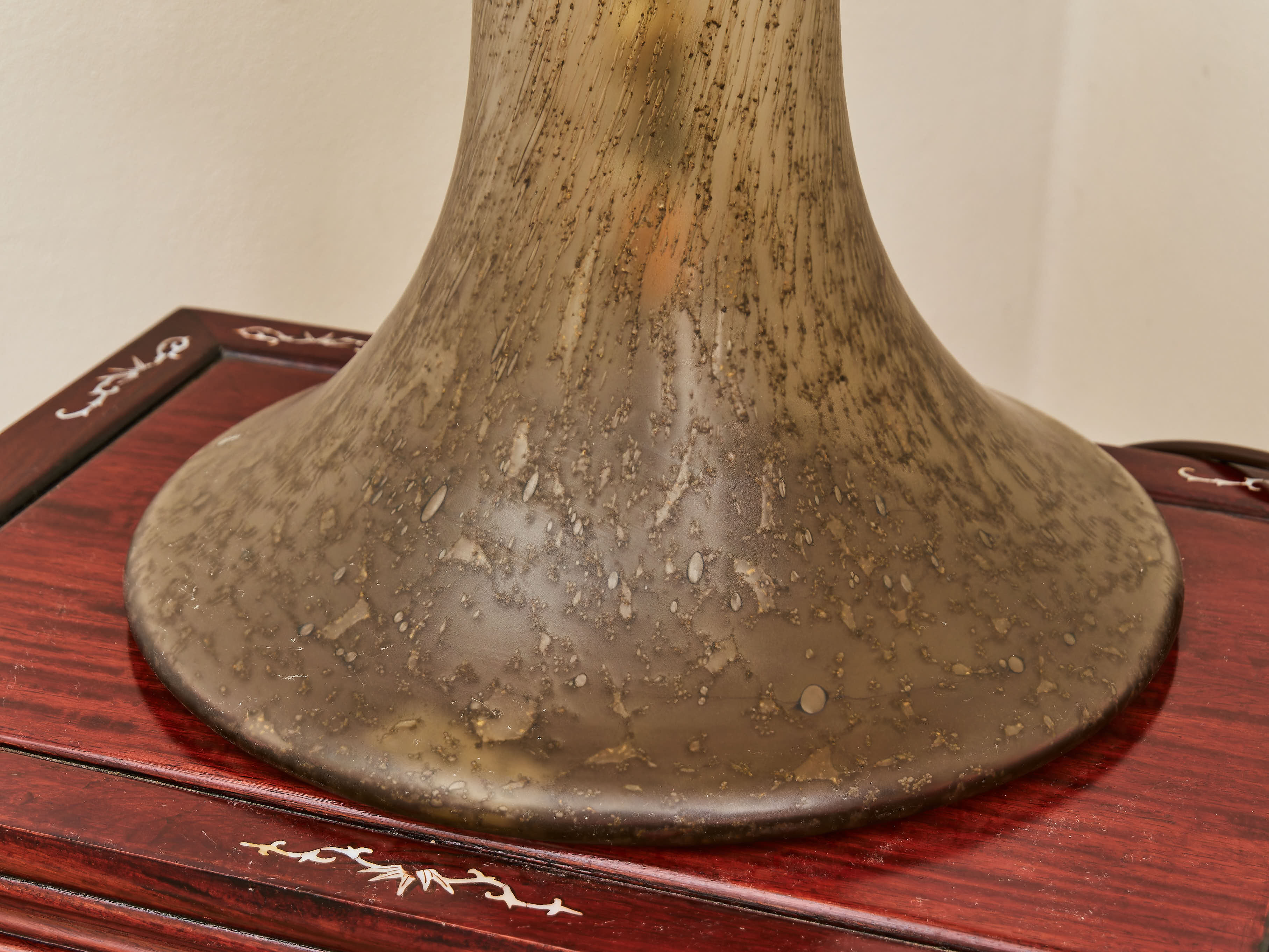 Velká stolní lampa s variabilním svícením – možno svítit žárovkou v noze, vrchní žárovkou pod stínidlem nebo oběma najednou. Designové sklo.