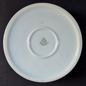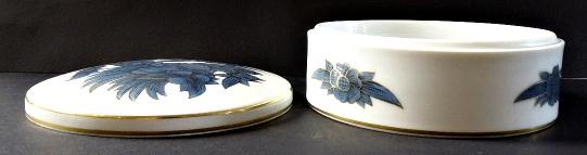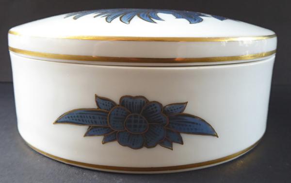 Bílý, modrý a zlacený porcelán. Období a styl art deko. Kulatého tvaru. Ploché, mírně klenuté víčko. Zdobené stylizovaným modrým lvem, s hřívou, křídly, květinami a zlacenými konturami. Spodní část dózy zdobená po obvodu květinami s listy. Zlacené linky. Rosenthal, Německo 1921 – 1922. Průměr 14 cm. Výška 6 cm.