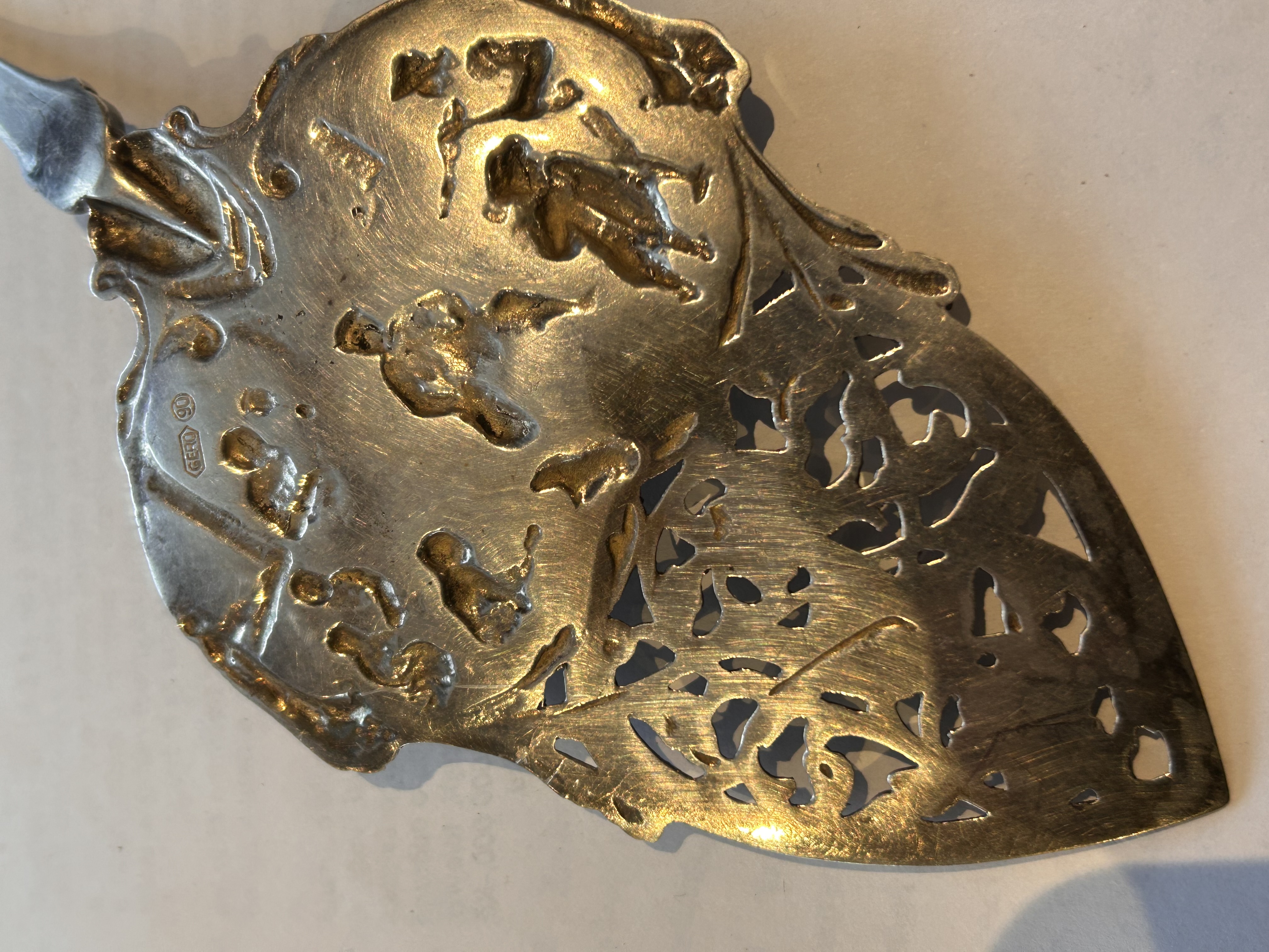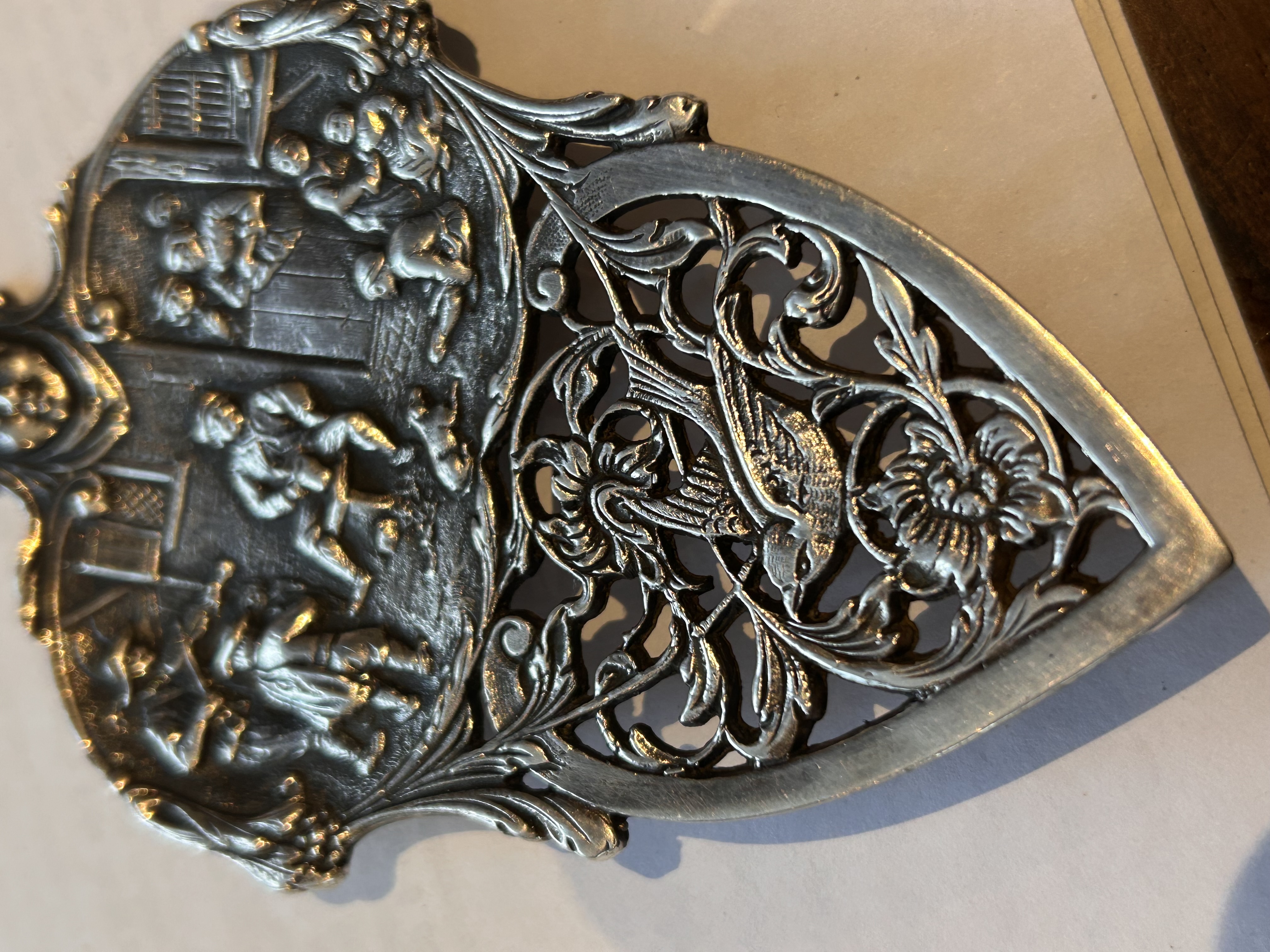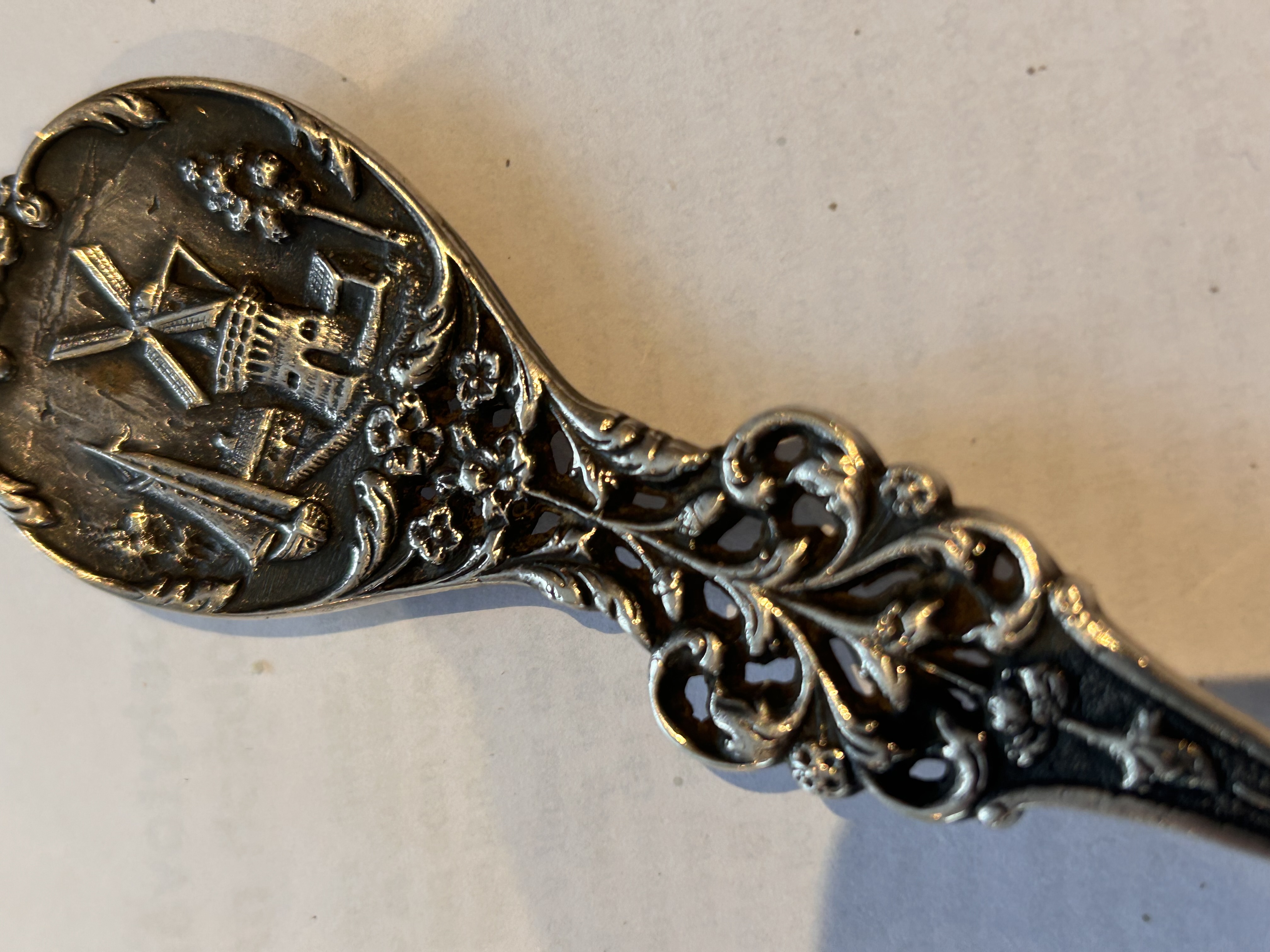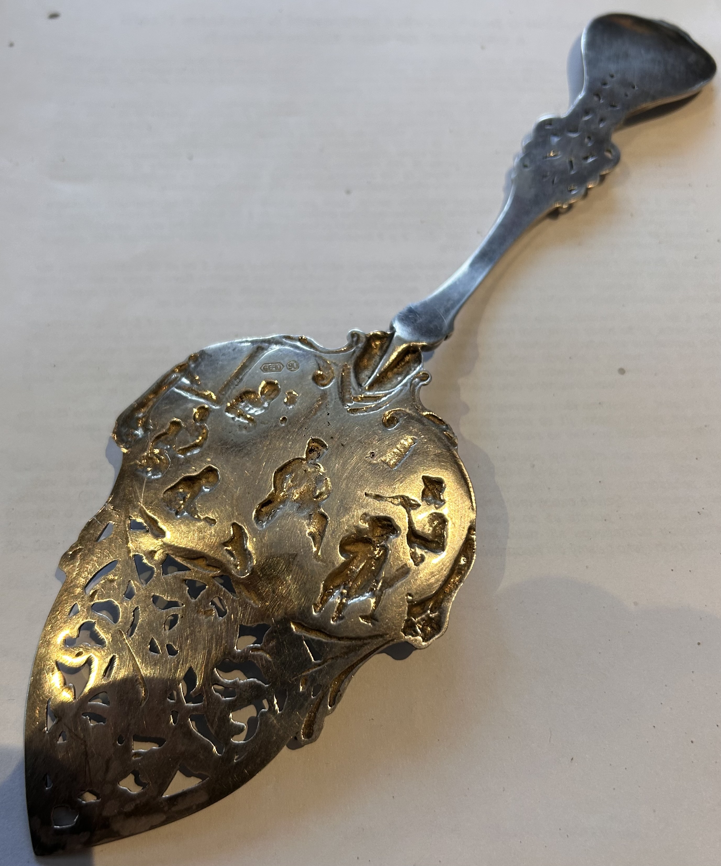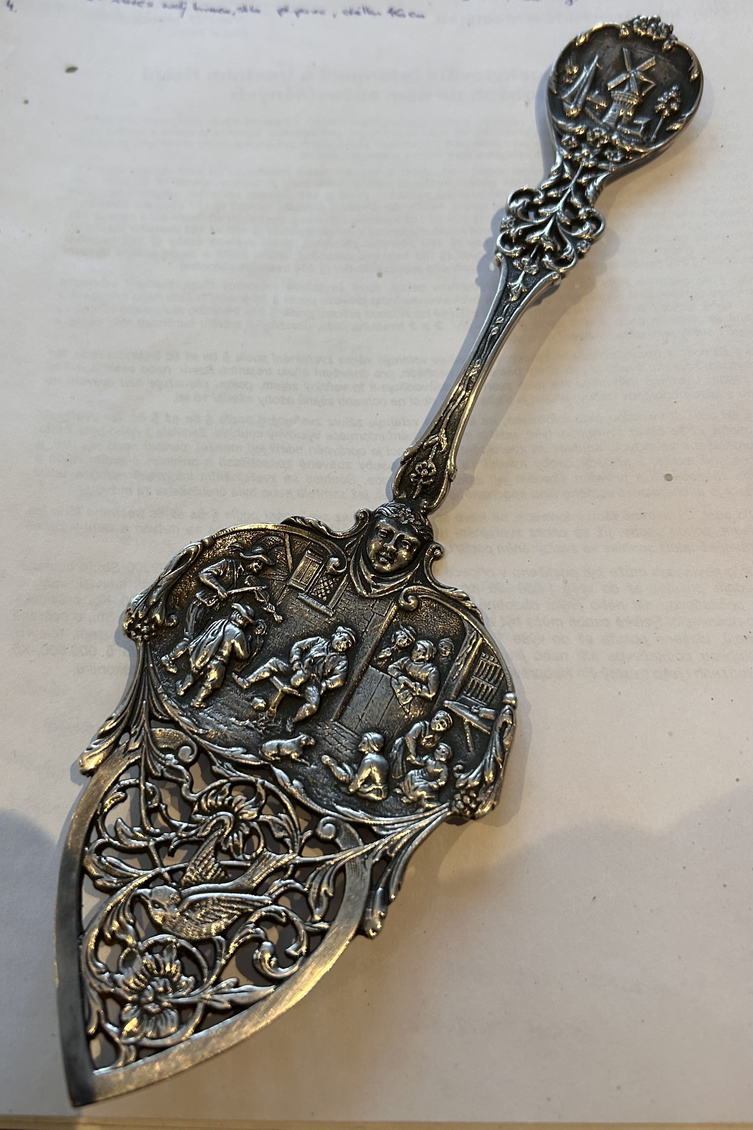 Velká desertní lopatka,prořezávaný dekor ,na lžíci pijácká scéna a na držadle holandský mlýn s plachetnicí,vynikající stav,značeno GERO 90