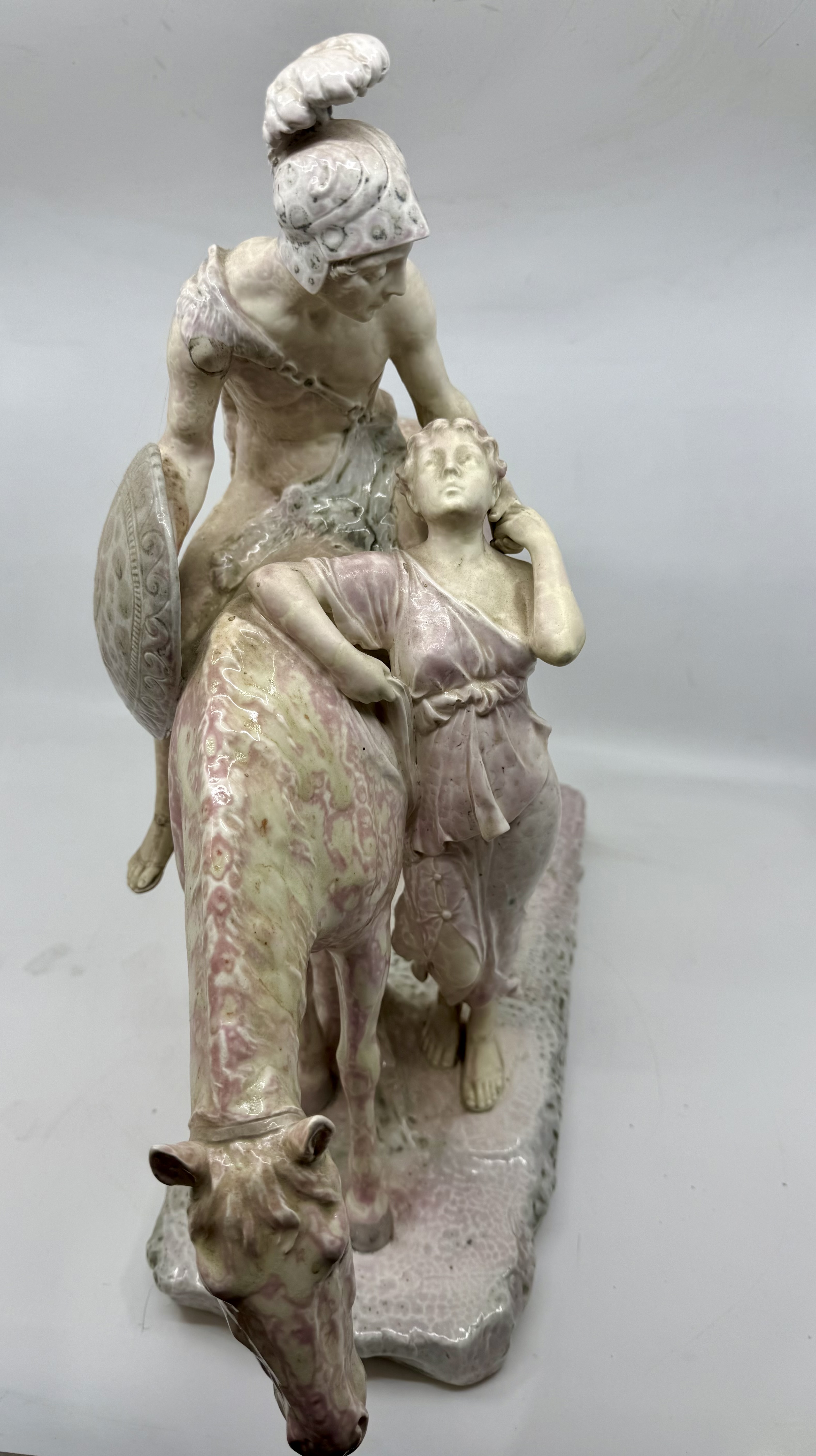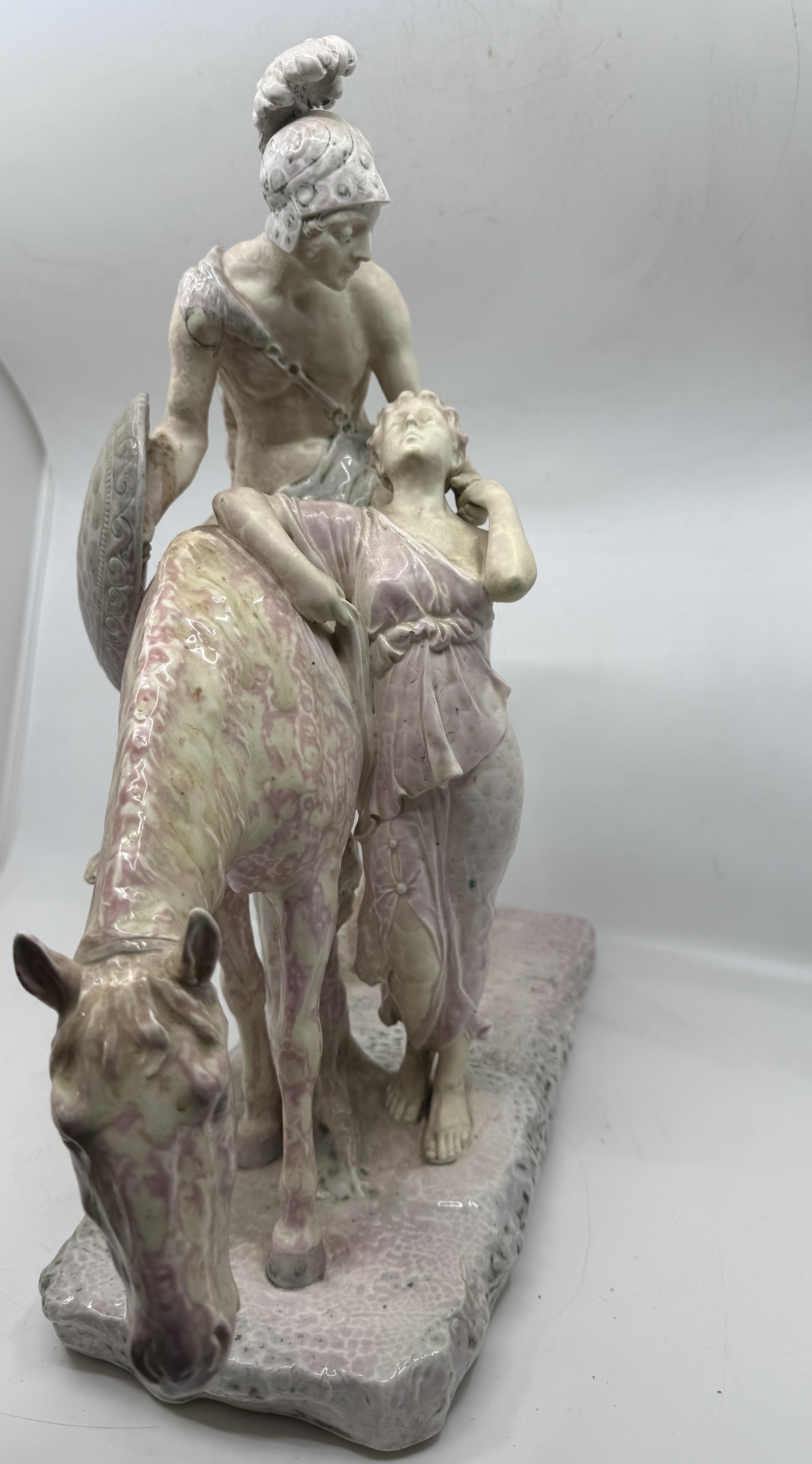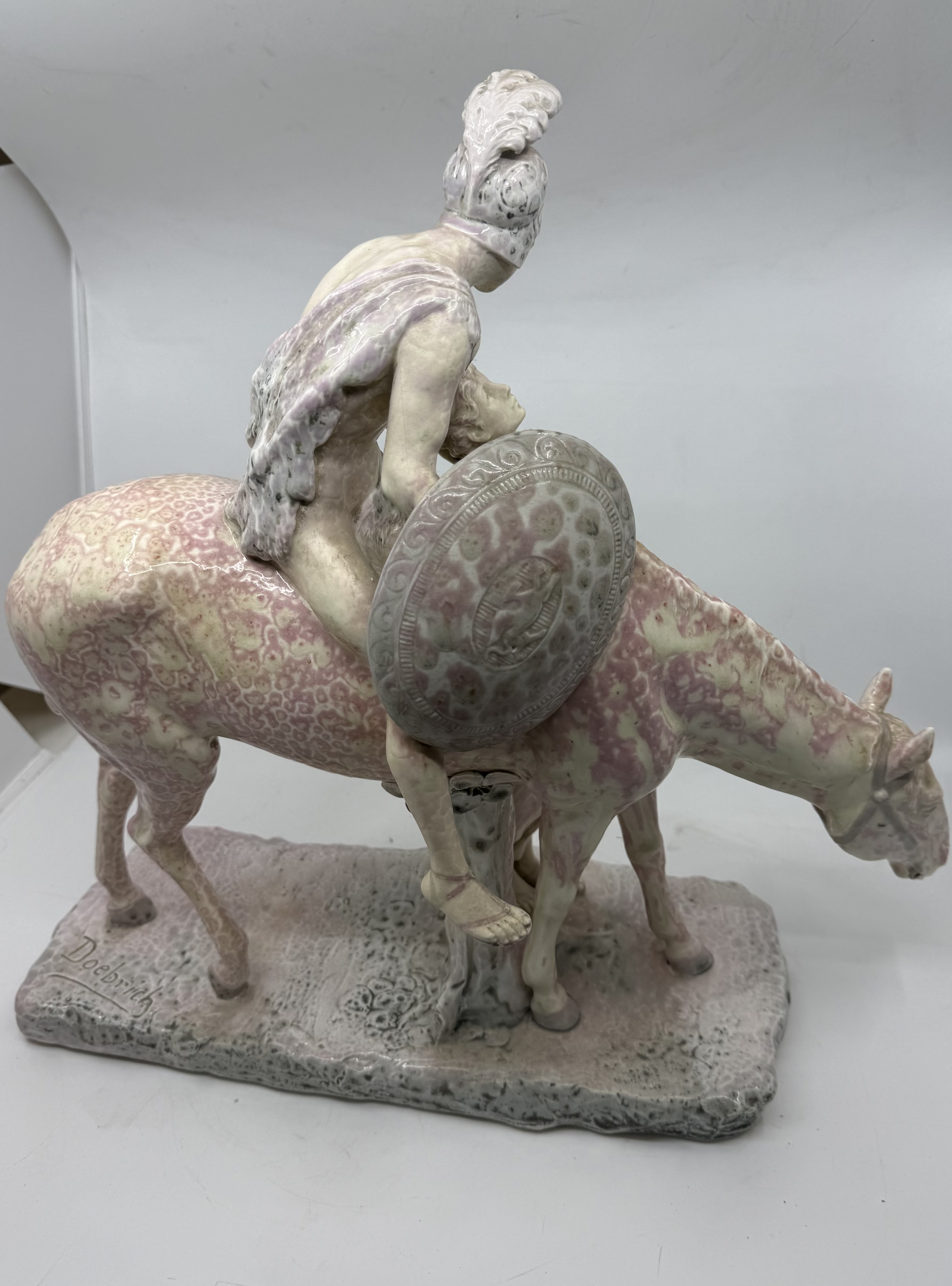 Zajímavé velké sousoší , signováno Doebrich, značeno vídeňskou značkou. Antický bojovník na koni s dívkou. Vzácná glazura “ Raku” , vytváří krakelovanou glazuru.