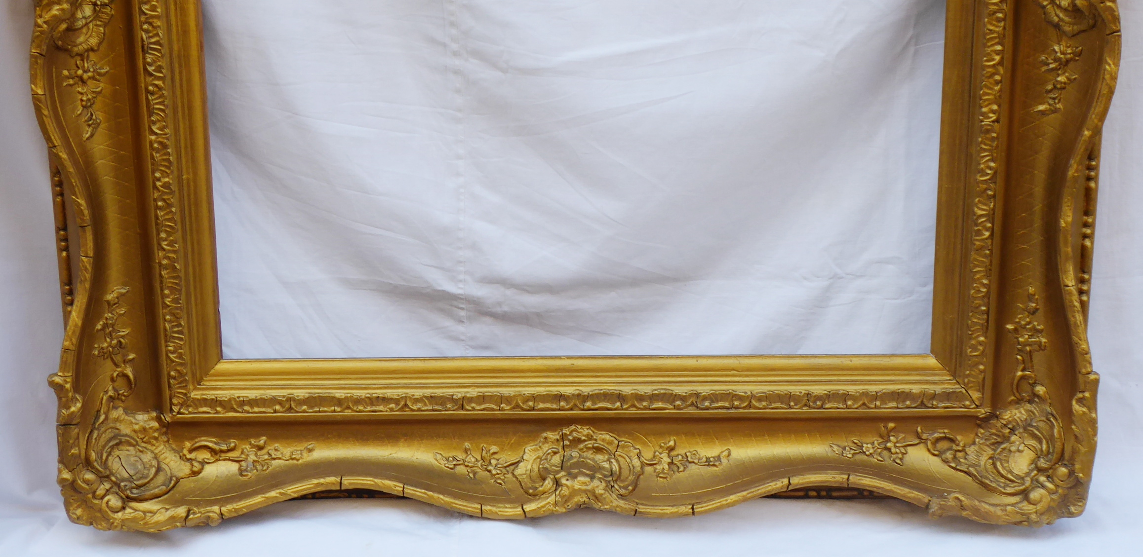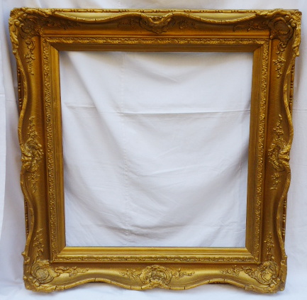 Dřevo se zlatavě bronzovou patinou. Světlost 75 cm x 70 cm. Luxusní rám francouzského typu blondel s klenutou obloukovitě tvarovanou čelní stranou zdobenou velkými reliéfními ornamenty. Vnitřní odstupňovaná lišta zdobená ornamentem mušle. Evropa 1880 – 1910. Celkový rozměr 106 cm x 100 cm.