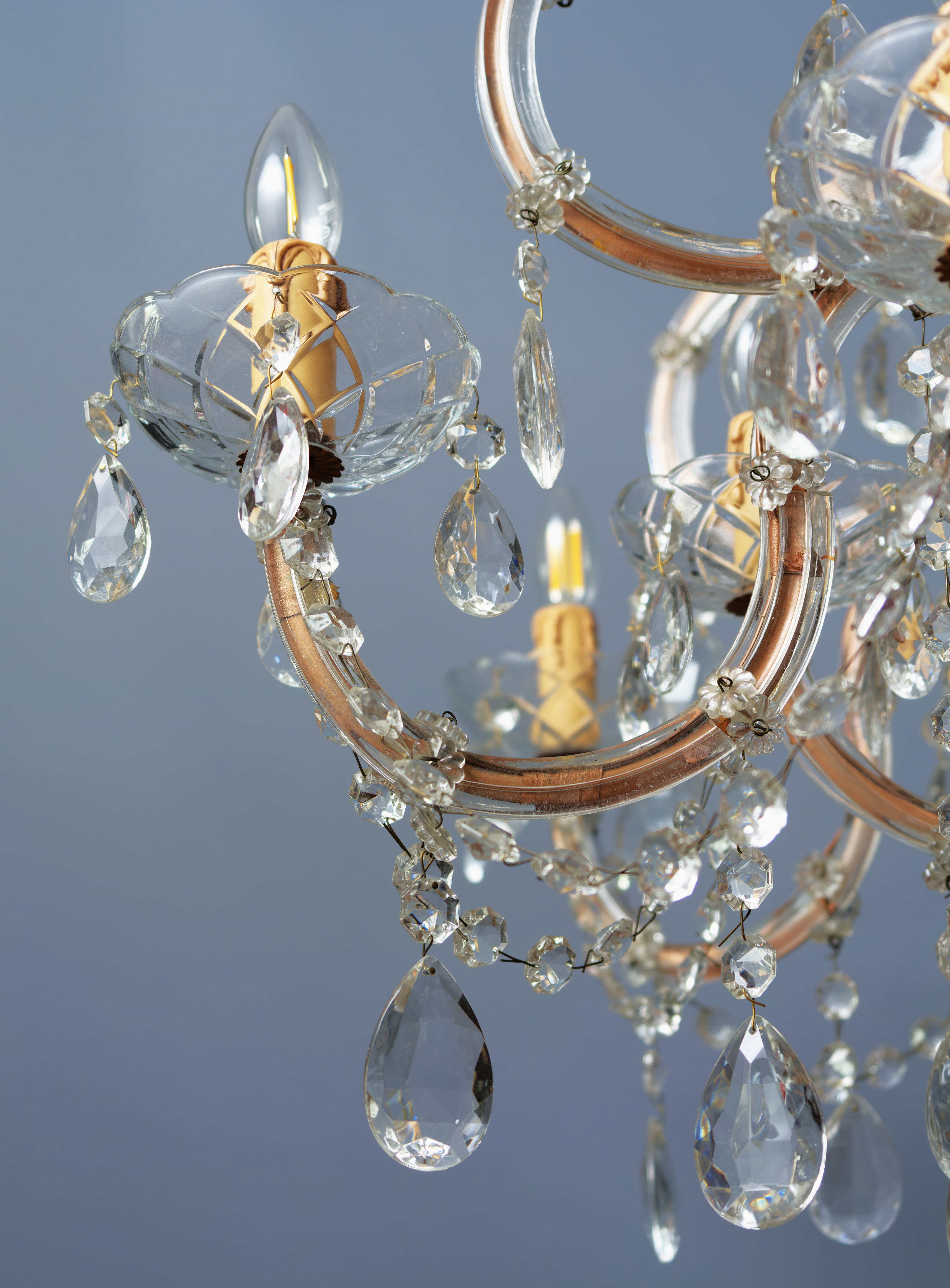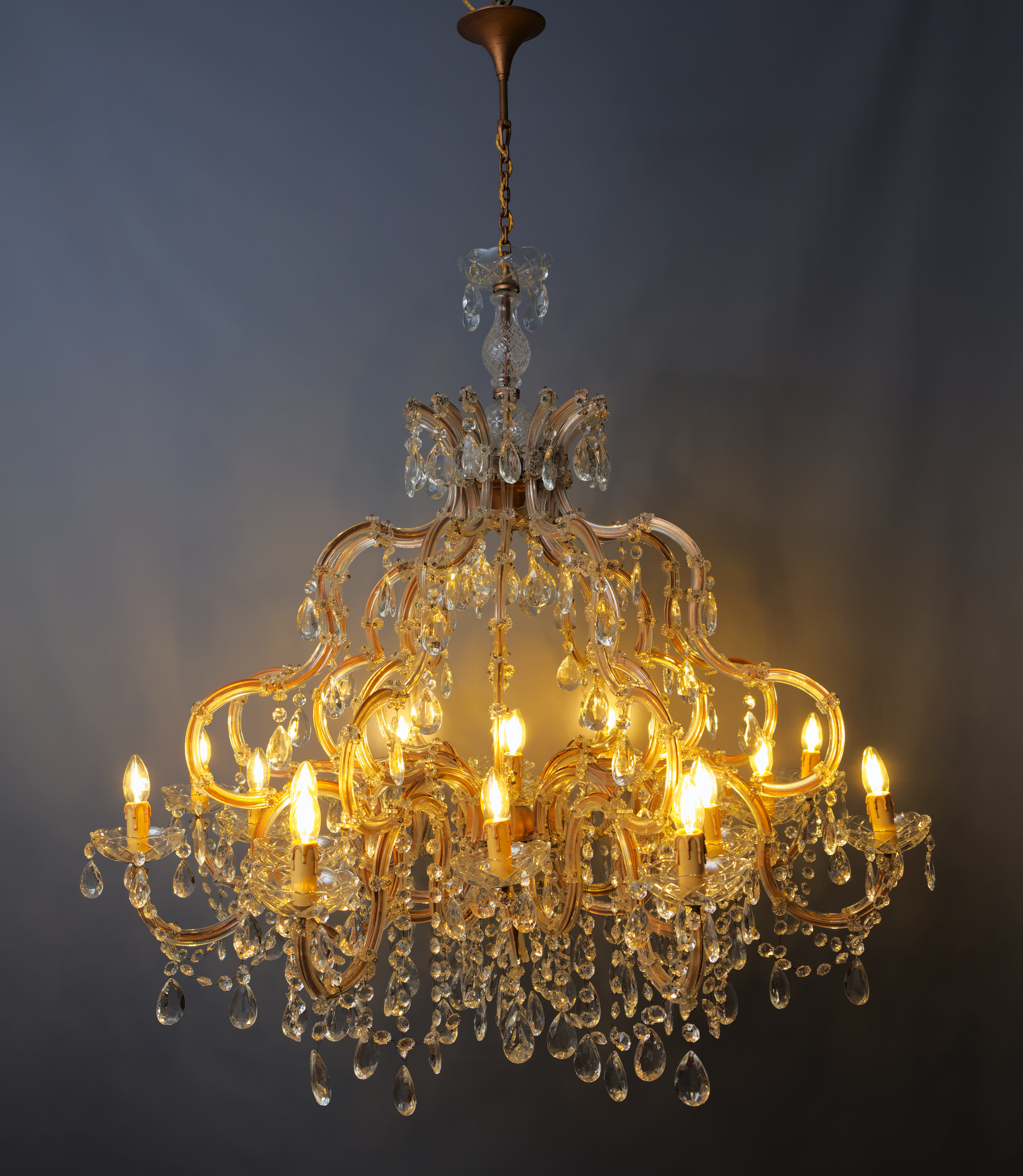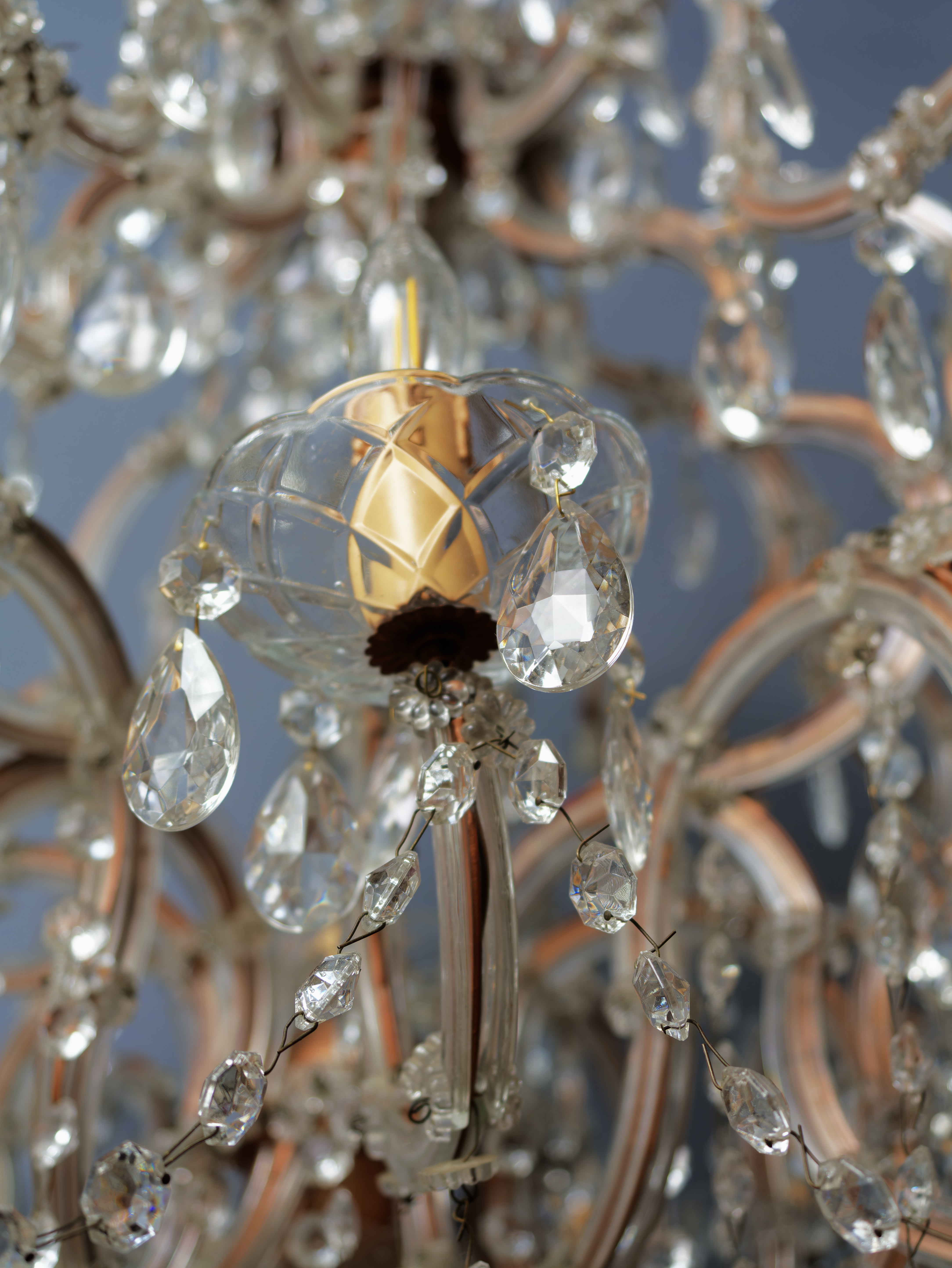 Honosný křišťálový lustr Marie Terezie na 17 žárovek do 40W. Ručně broušené a leštěné ověsy s vysokým barevným odleskem rozzáří interiér mnoha barvami. Tělo lustru je vyrobeno z kovu v bronzovém odstínu, na lustru jsou použity kabely v bronzové barvě. Misky jsou broušené s očky pro zavěšení ověsů. Lustr je vhodný do klasického i moderního interiéru jako solitérní kus. Lustr je na 17 žárovek s paticí E14 (normální svíčkové) – vhodné jsou normální, halogenové i led žárovky – nejsou součástí, ale po dohodě mohu dodat s žárovkami dle přání. Stav: lustr je nově elektrifikovaný do mědi, nový přívodní kabel s látkovým opletem 3 linka s uzemněním, jsou doplněné ověsy, nové objímky žárovek a nové šešule – v perfektním stavu. Datace: 20. století. Provenience: Čechy.