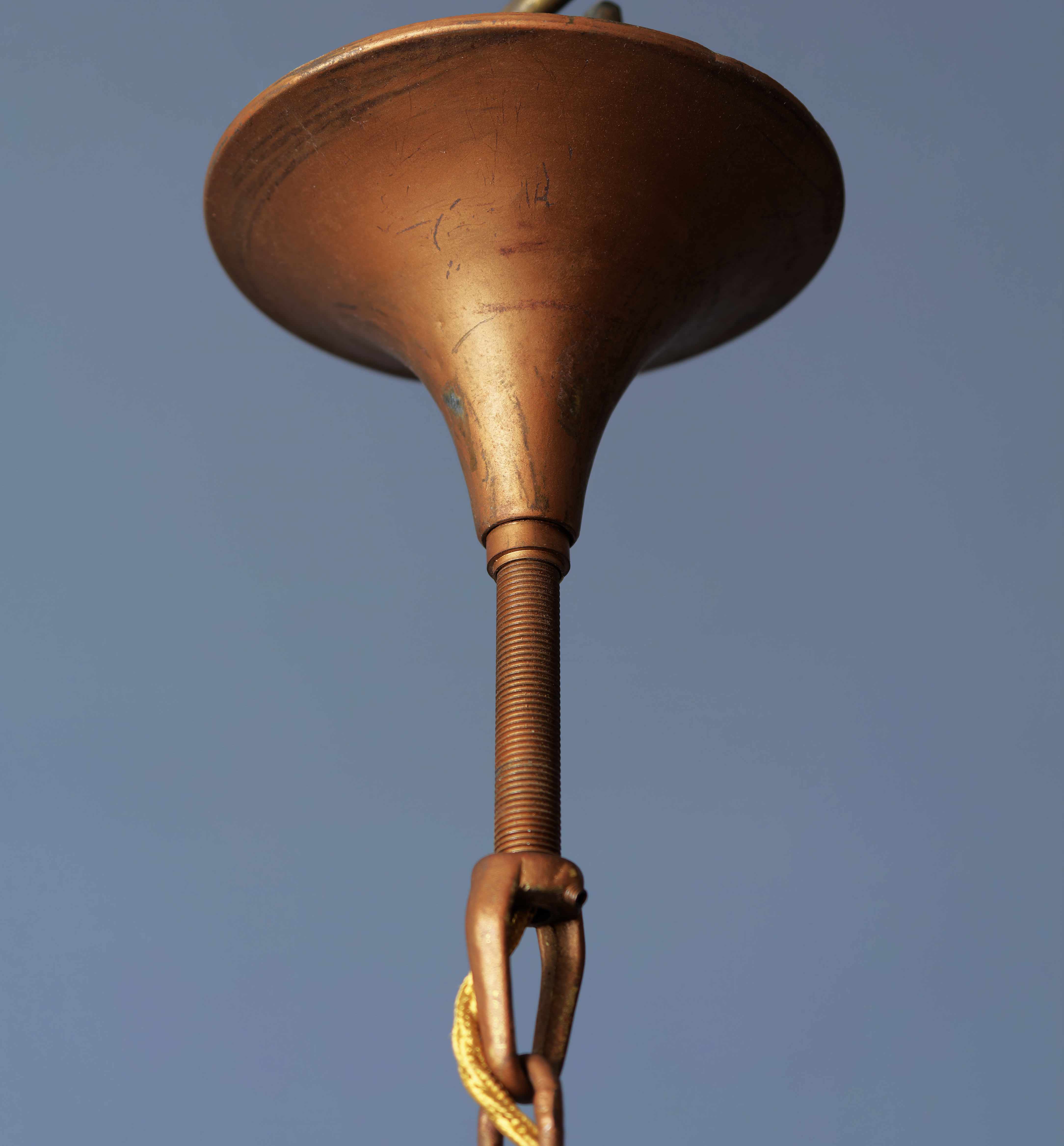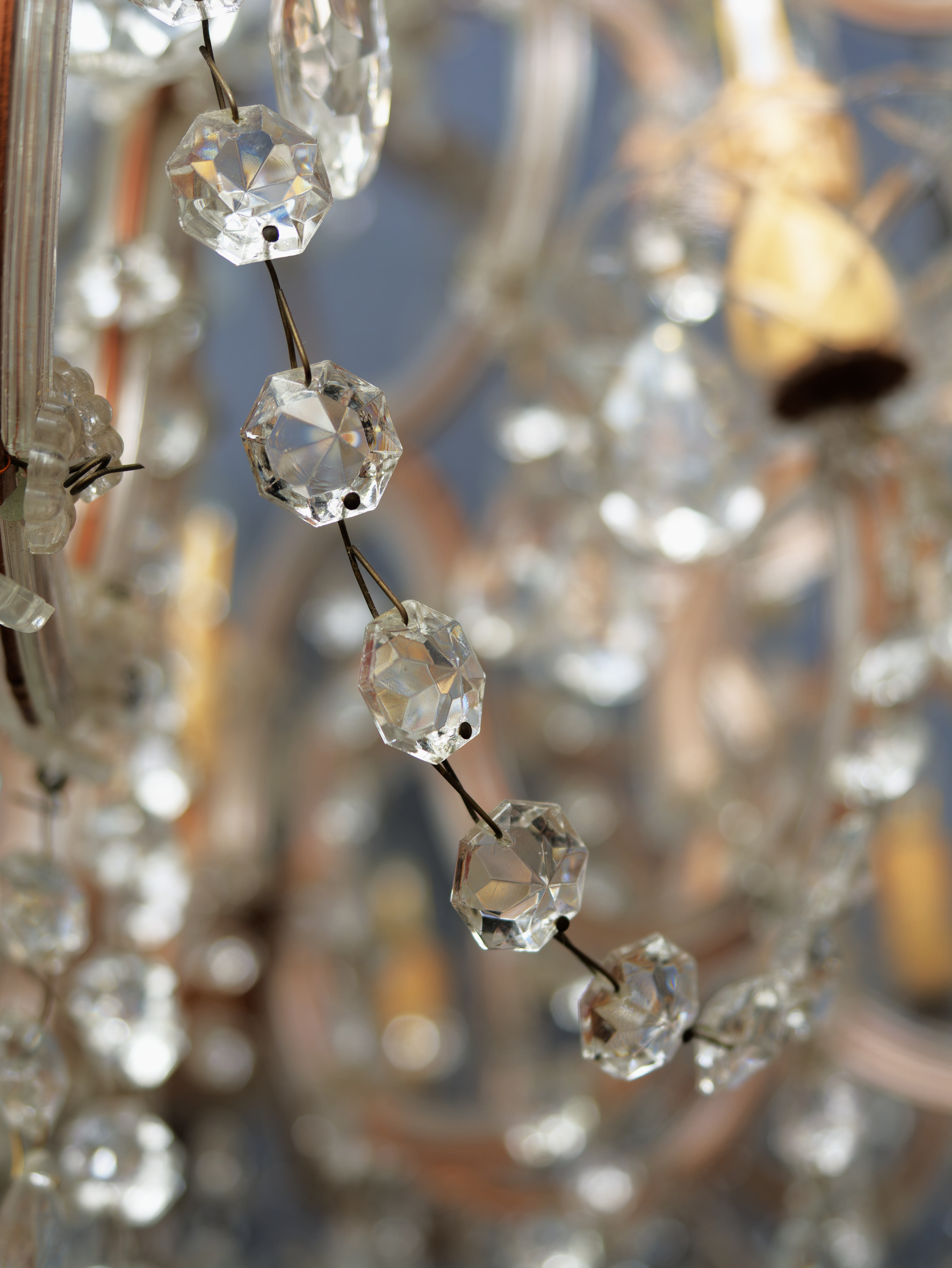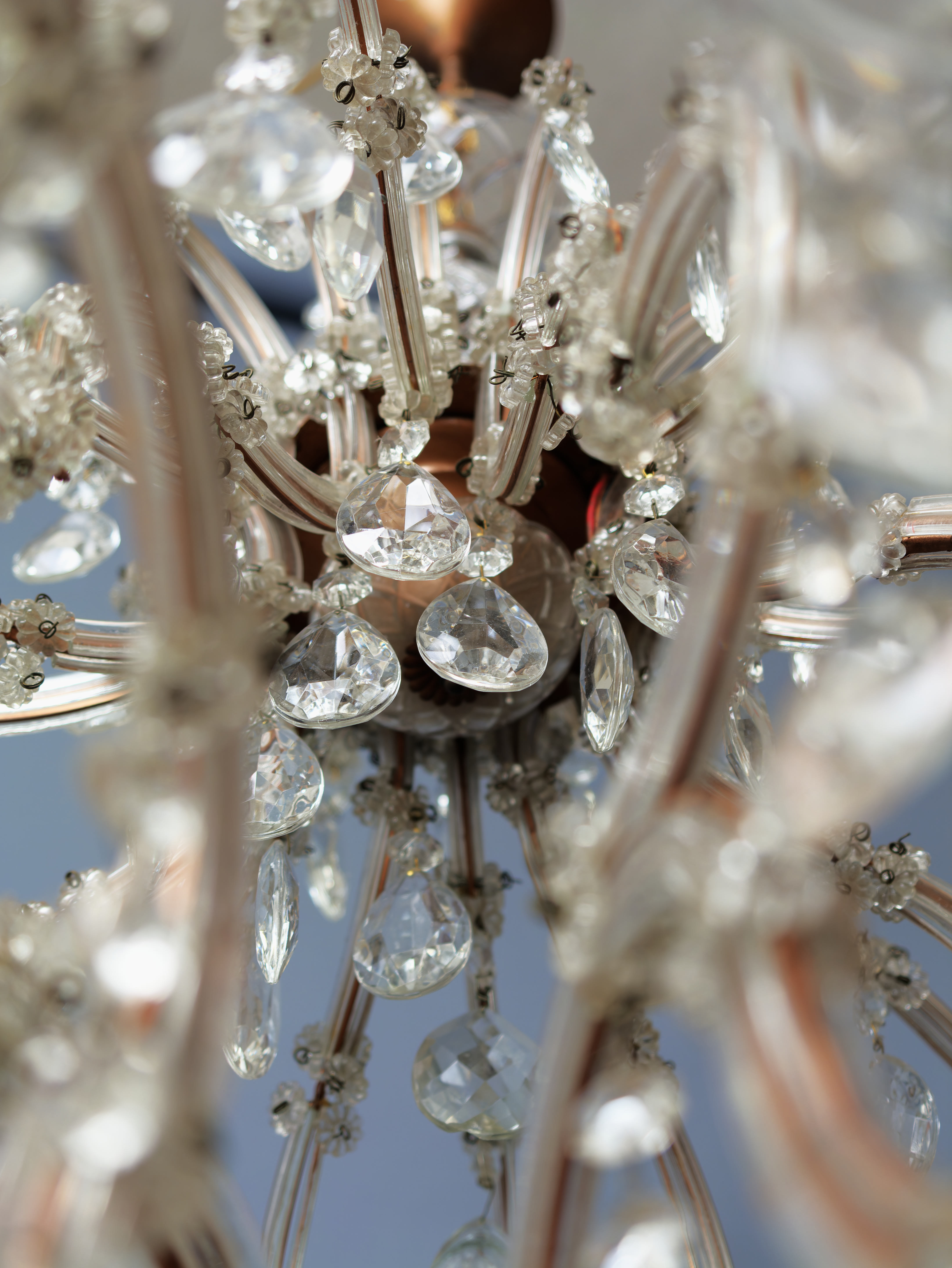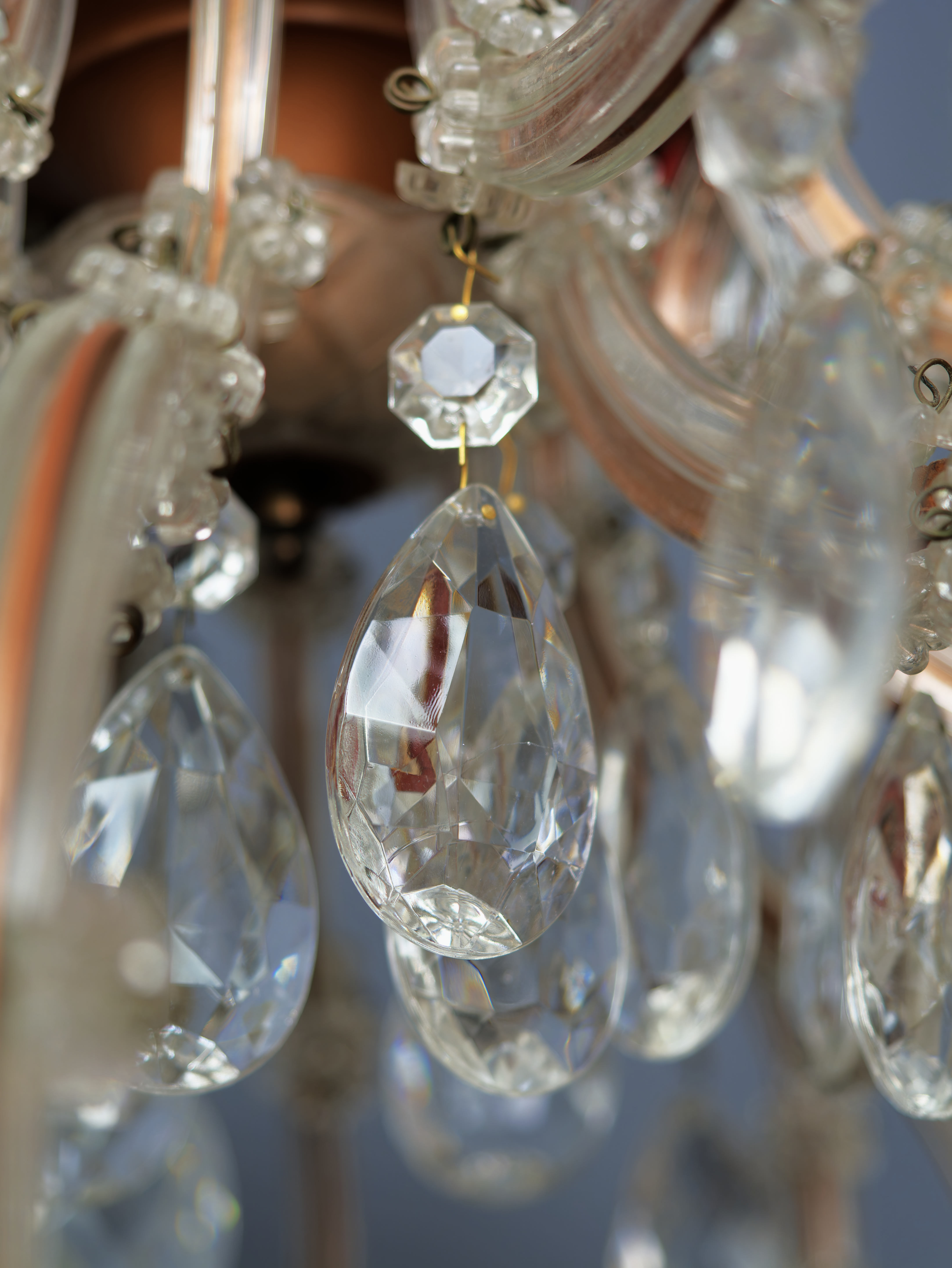 Honosný křišťálový lustr Marie Terezie na 17 žárovek do 40W. Ručně broušené a leštěné ověsy s vysokým barevným odleskem rozzáří interiér mnoha barvami. Tělo lustru je vyrobeno z kovu v bronzovém odstínu, na lustru jsou použity kabely v bronzové barvě. Misky jsou broušené s očky pro zavěšení ověsů. Lustr je vhodný do klasického i moderního interiéru jako solitérní kus. Lustr je na 17 žárovek s paticí E14 (normální svíčkové) – vhodné jsou normální, halogenové i led žárovky – nejsou součástí, ale po dohodě mohu dodat s žárovkami dle přání. Stav: lustr je nově elektrifikovaný do mědi, nový přívodní kabel s látkovým opletem 3 linka s uzemněním, jsou doplněné ověsy, nové objímky žárovek a nové šešule – v perfektním stavu. Datace: 20. století. Provenience: Čechy.