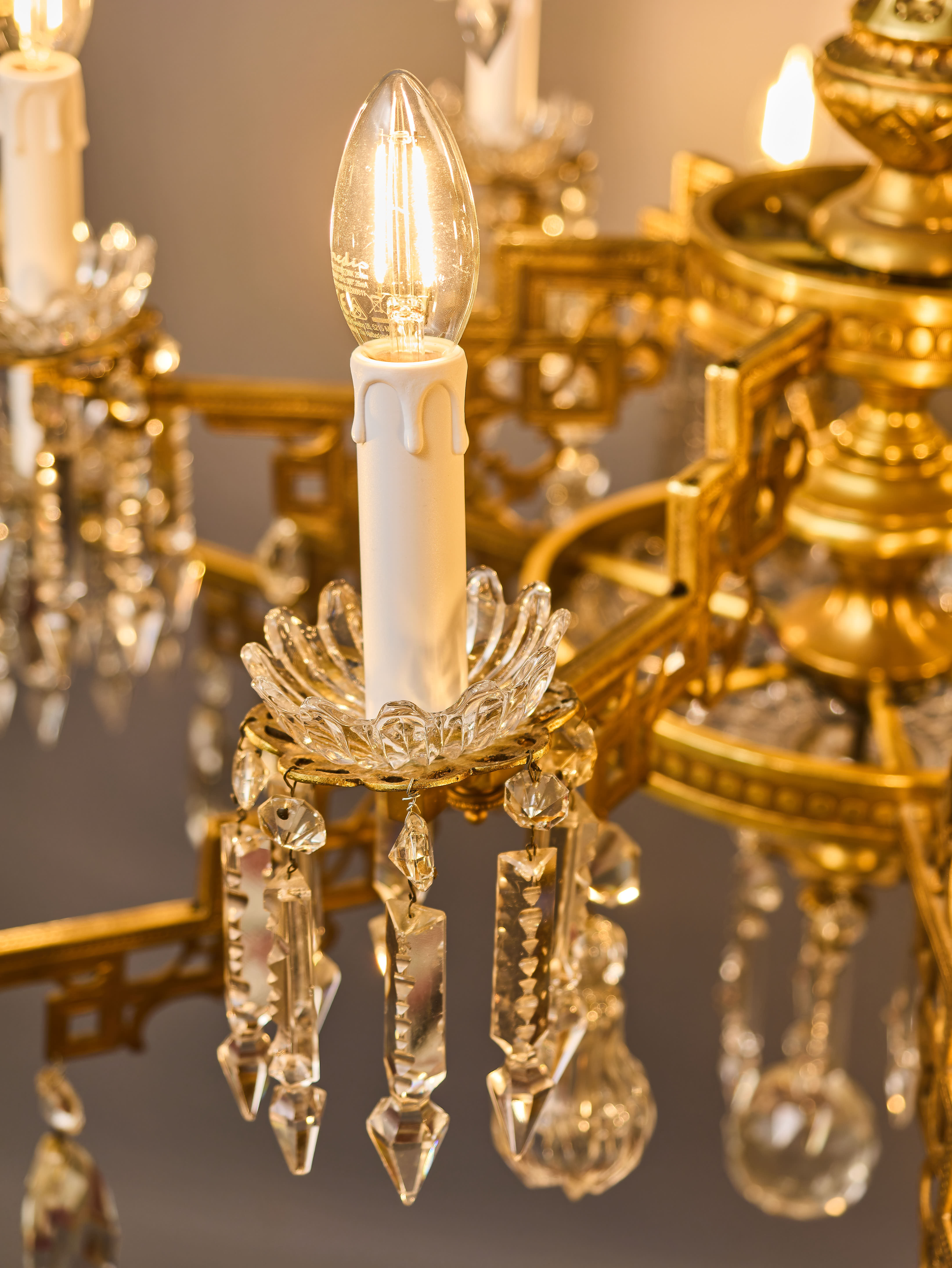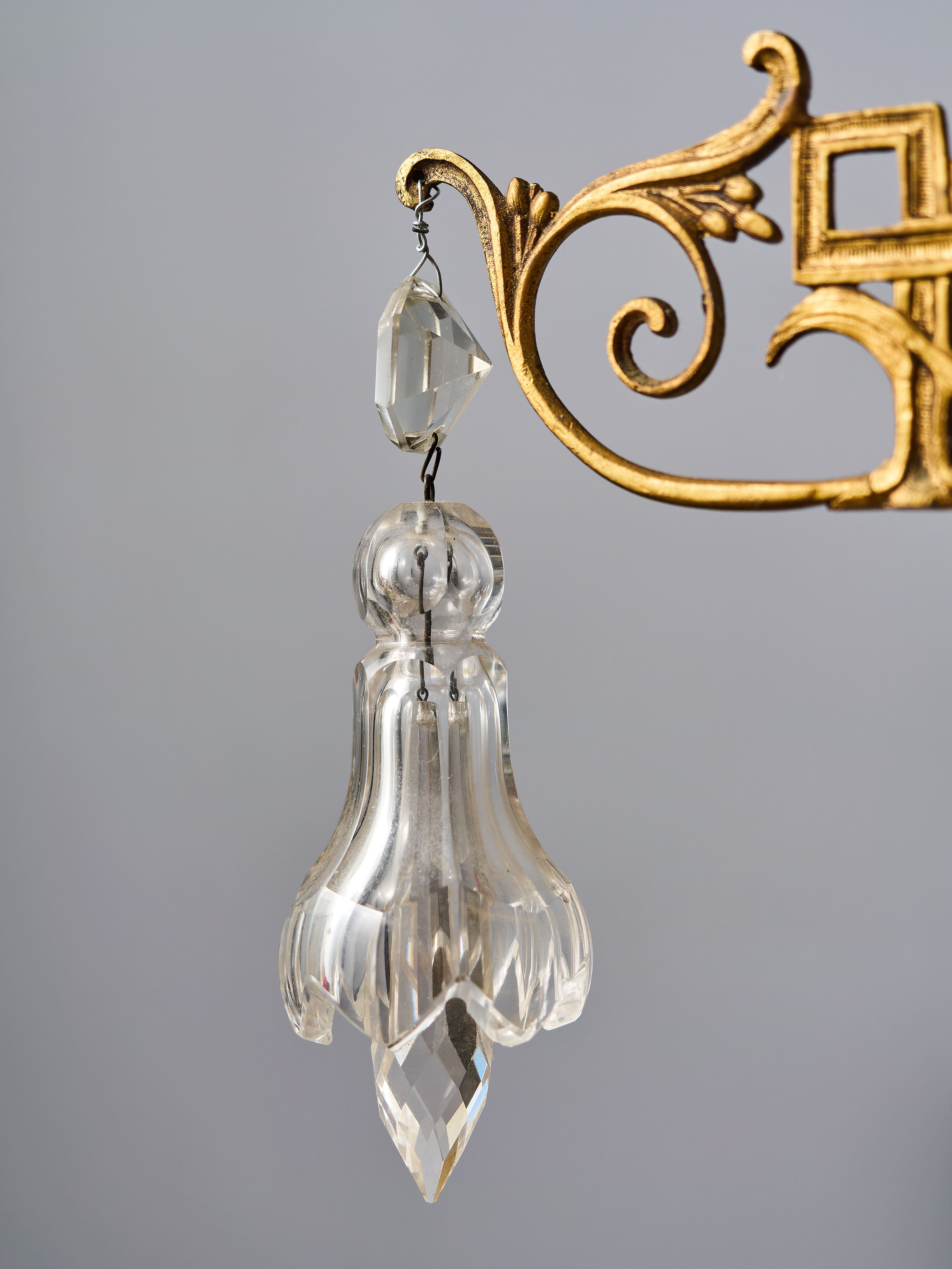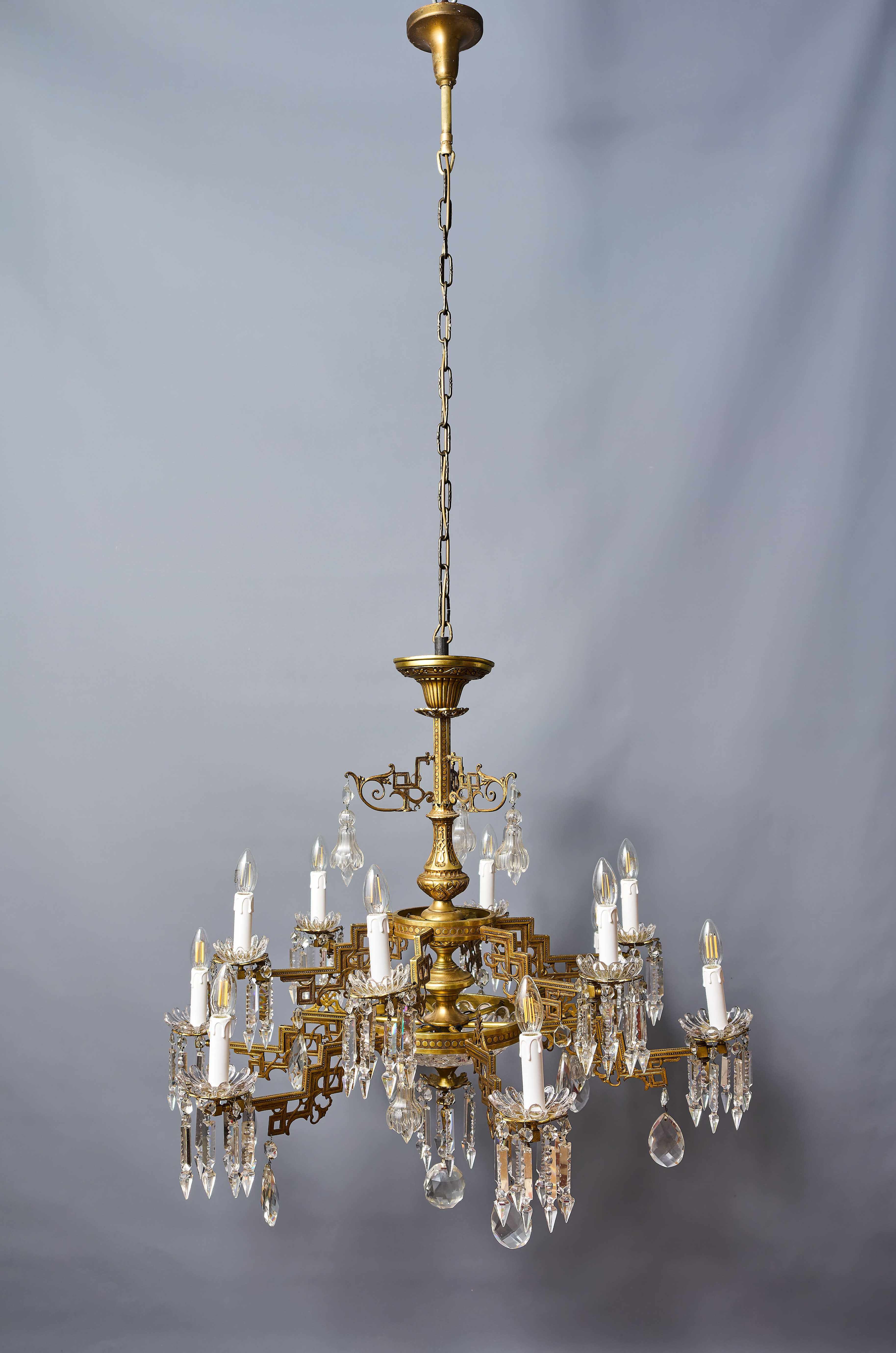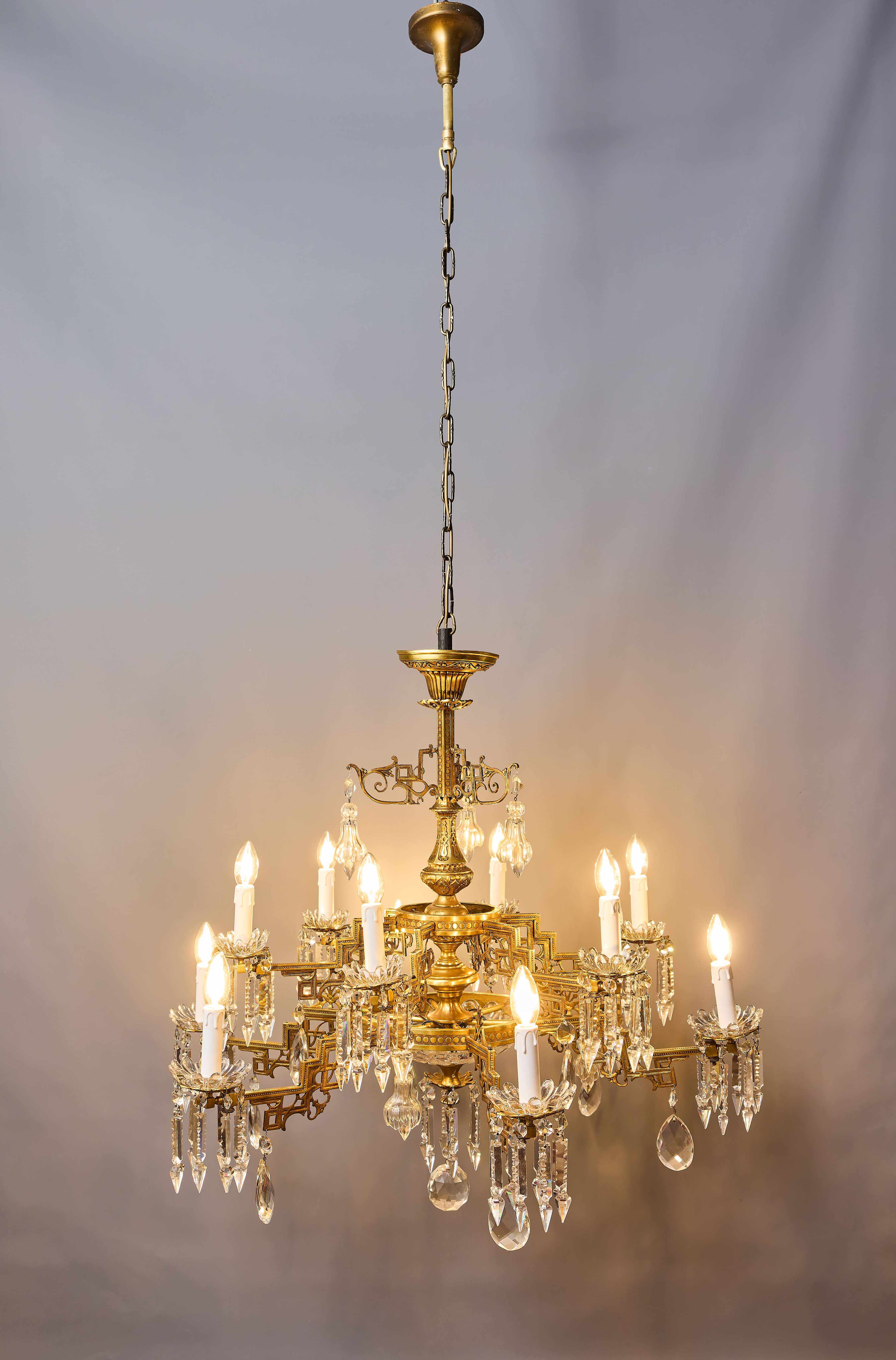 Dvoupatrový lustr z období art-deca s ověsy z olovnatého křišťálu, které jsou ručně broušené a leštěné. Lustr má novou elektroinstalaci v mědi, nové objímky a nové šešule (krytky objímek) – je plně funkční a připravený k užívání. Lustr je na klasické svíčkové žárovky s paticí E14 do 40W – vhodné jsou normální, halogenové i led žárovky (nejsou součástí, ale můžeme pomoc s výběrem nebo i dodat co bude vhodné pro váš projekt). Křišťálové ověsy jsou doplněné a jsou kompletní.