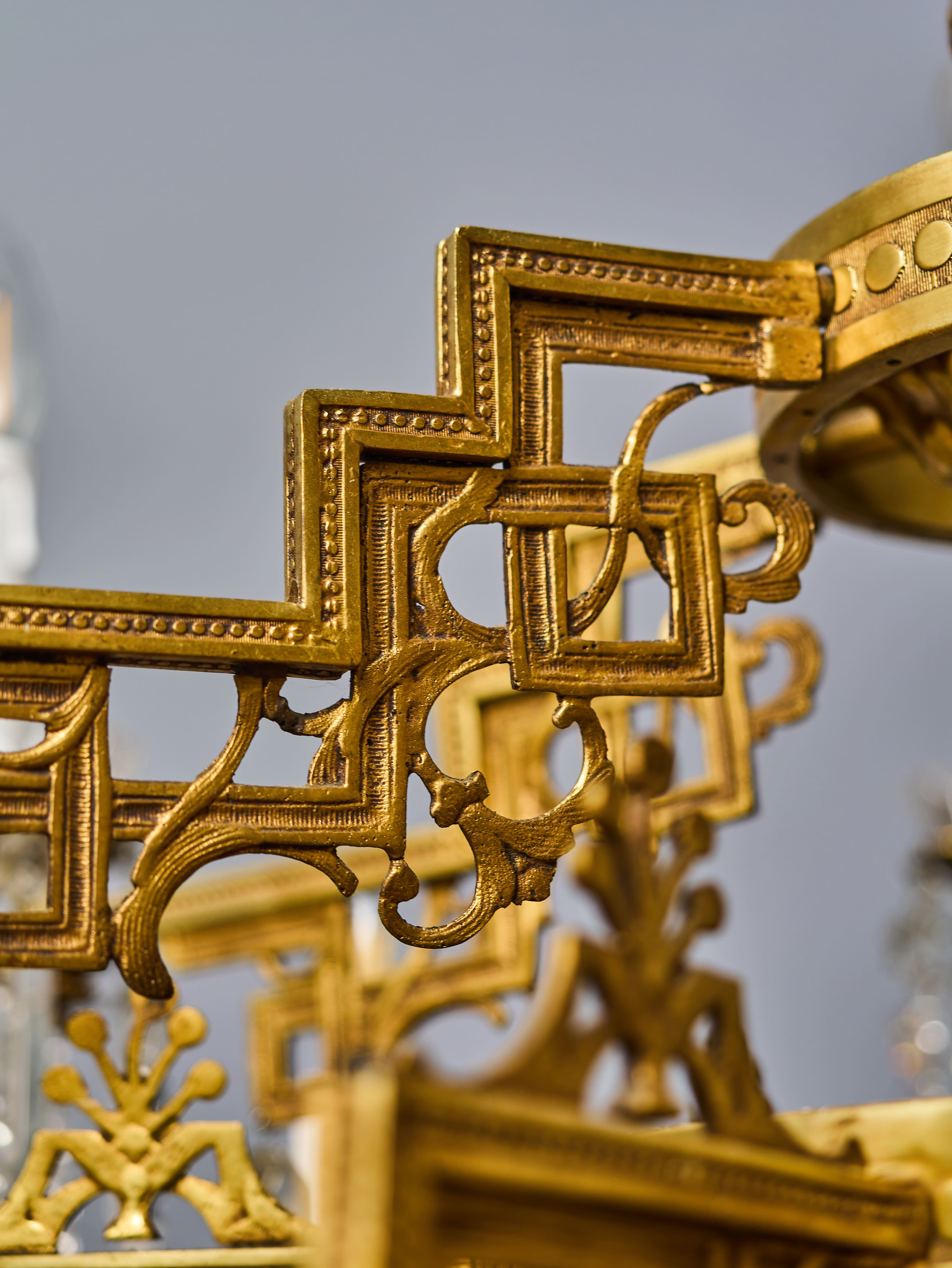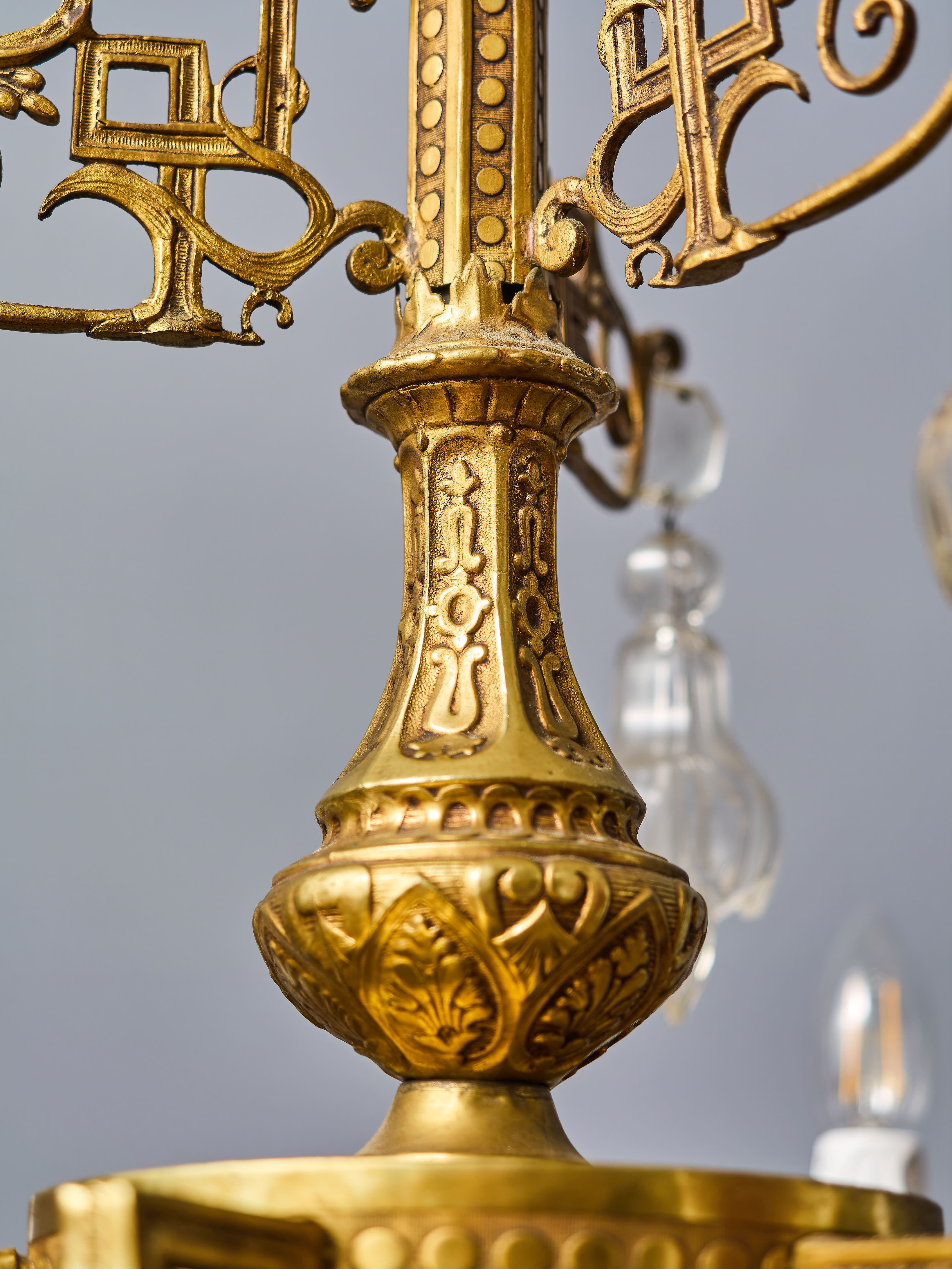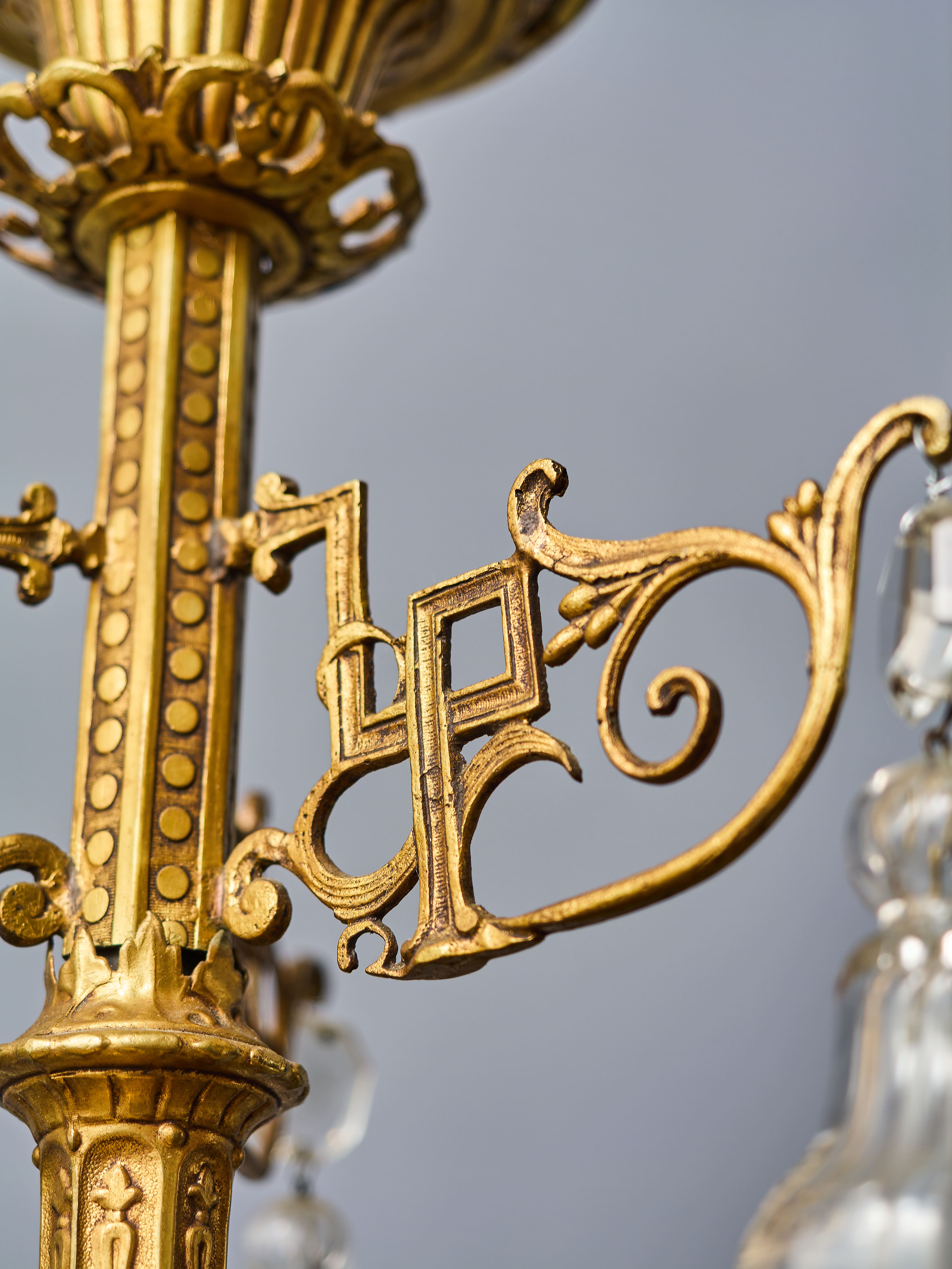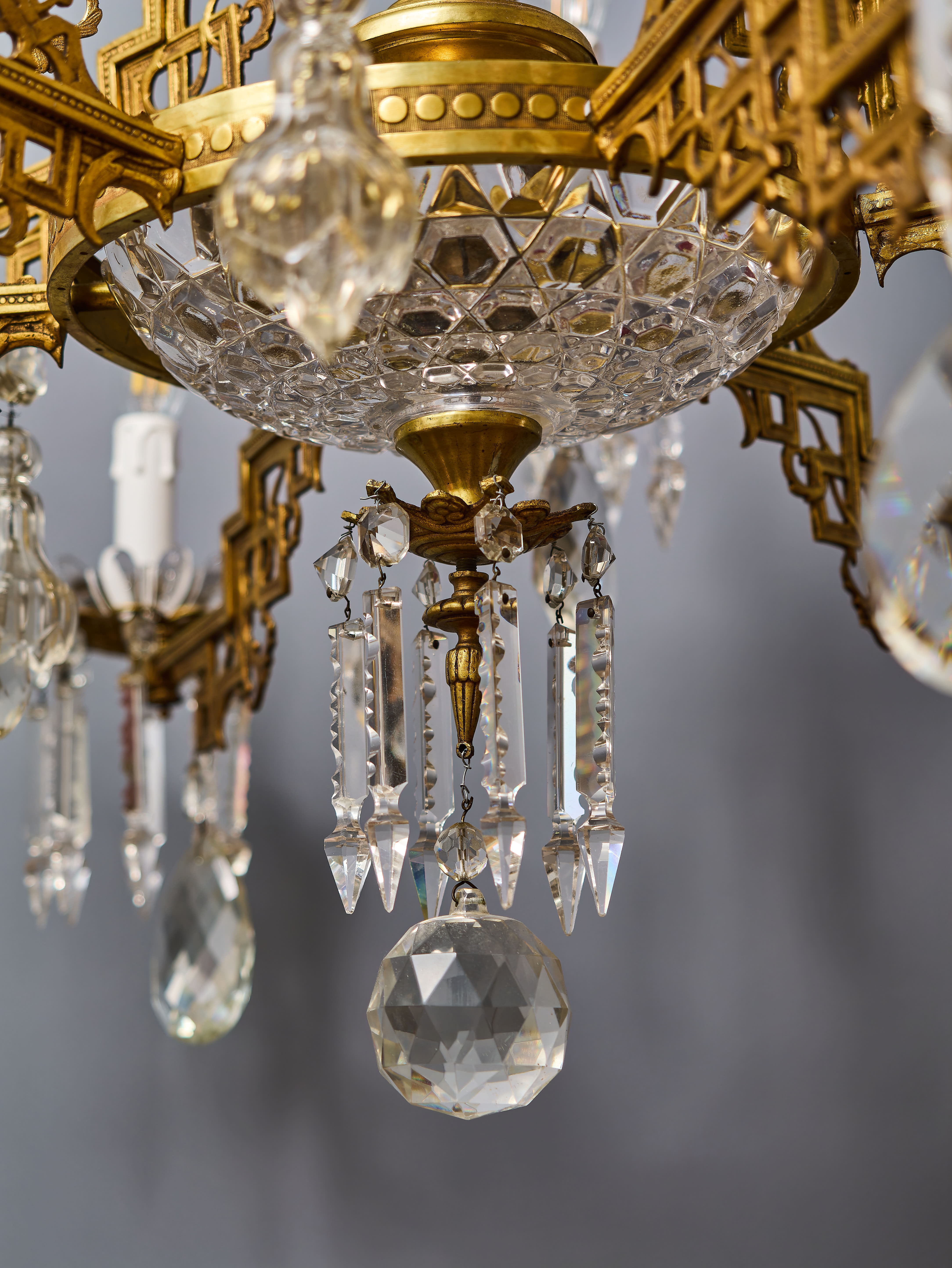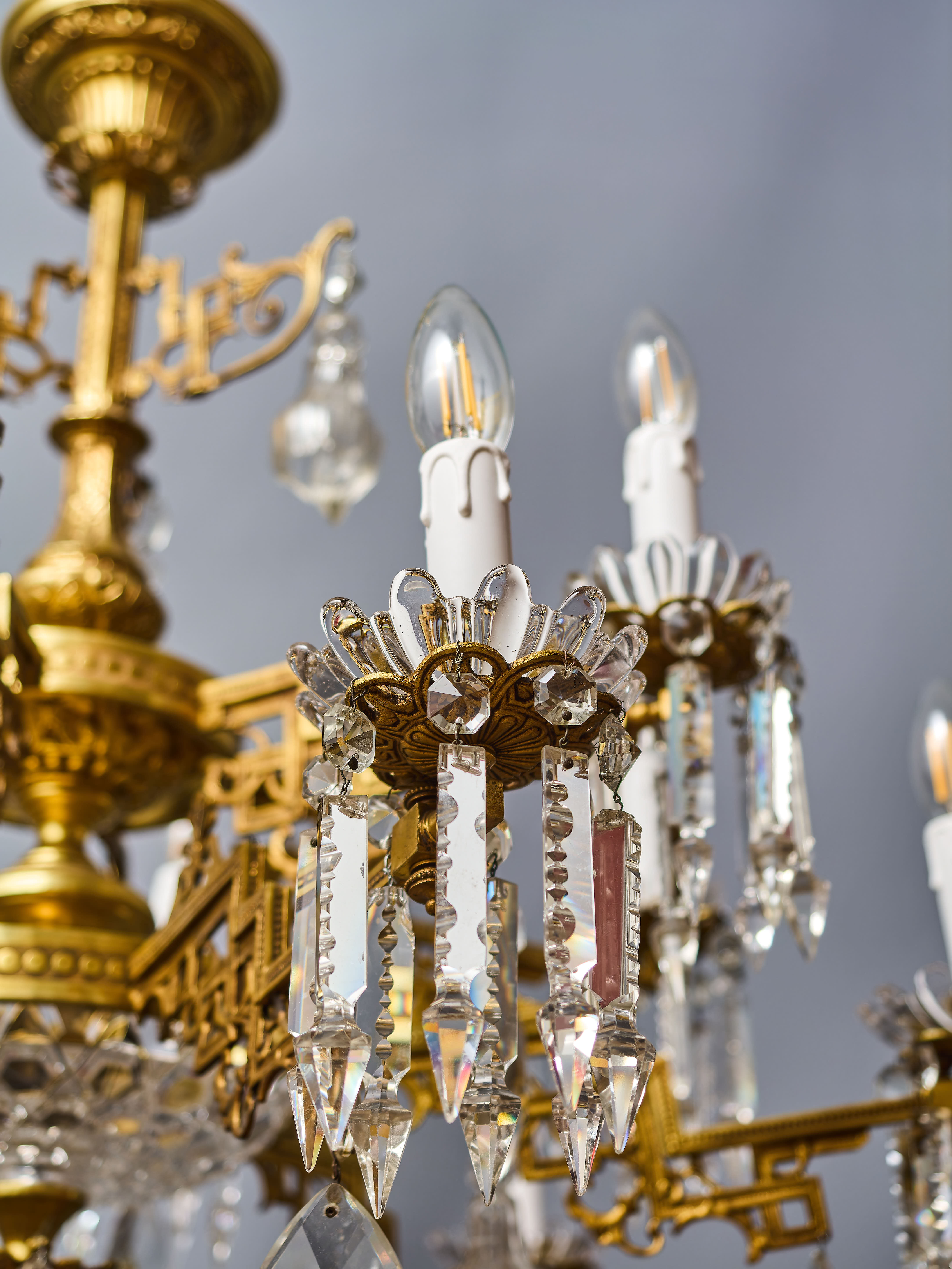 Dvoupatrový lustr z období art-deca s ověsy z olovnatého křišťálu, které jsou ručně broušené a leštěné. Lustr má novou elektroinstalaci v mědi, nové objímky a nové šešule (krytky objímek) – je plně funkční a připravený k užívání. Lustr je na klasické svíčkové žárovky s paticí E14 do 40W – vhodné jsou normální, halogenové i led žárovky (nejsou součástí, ale můžeme pomoc s výběrem nebo i dodat co bude vhodné pro váš projekt). Křišťálové ověsy jsou doplněné a jsou kompletní.