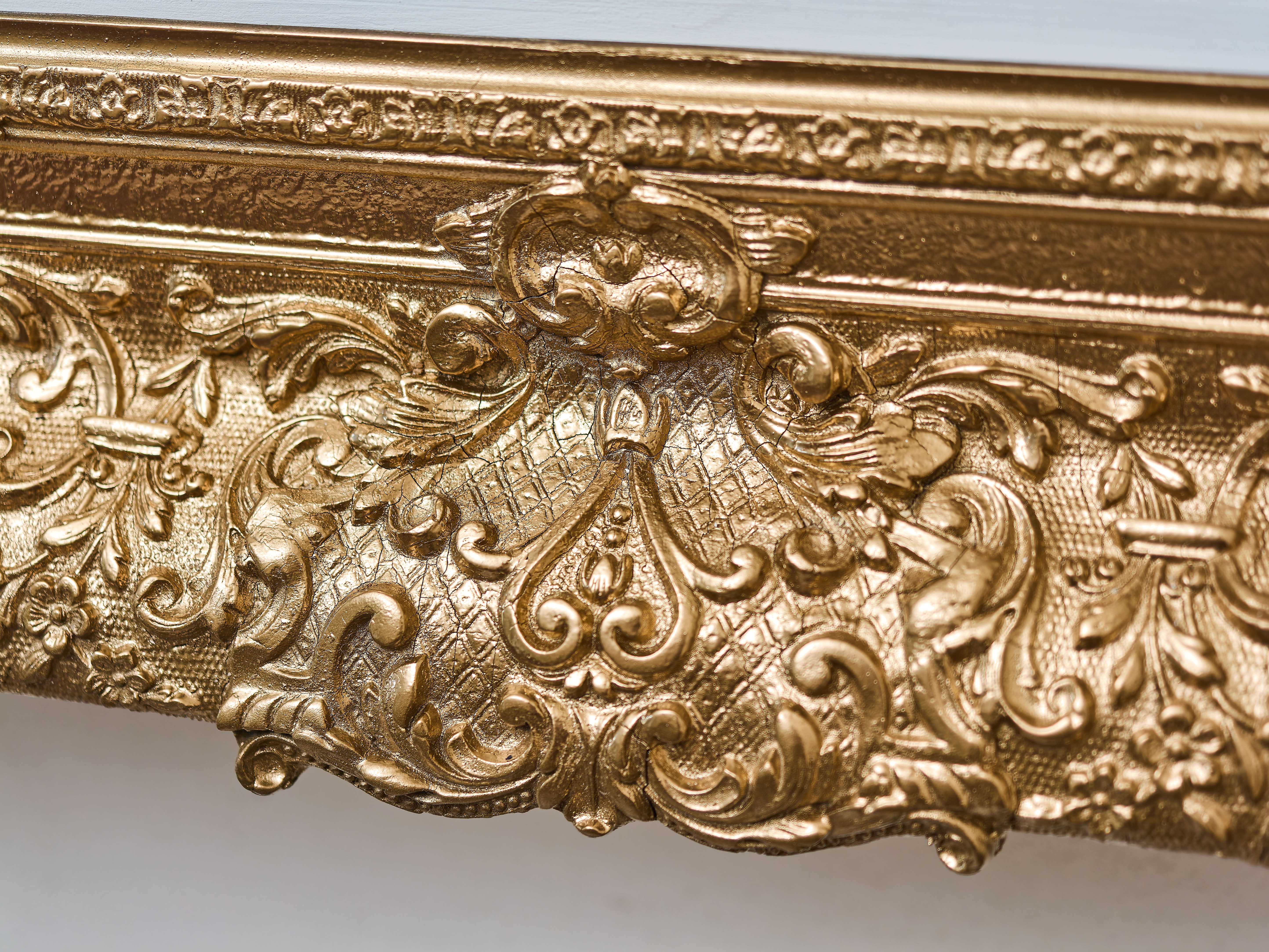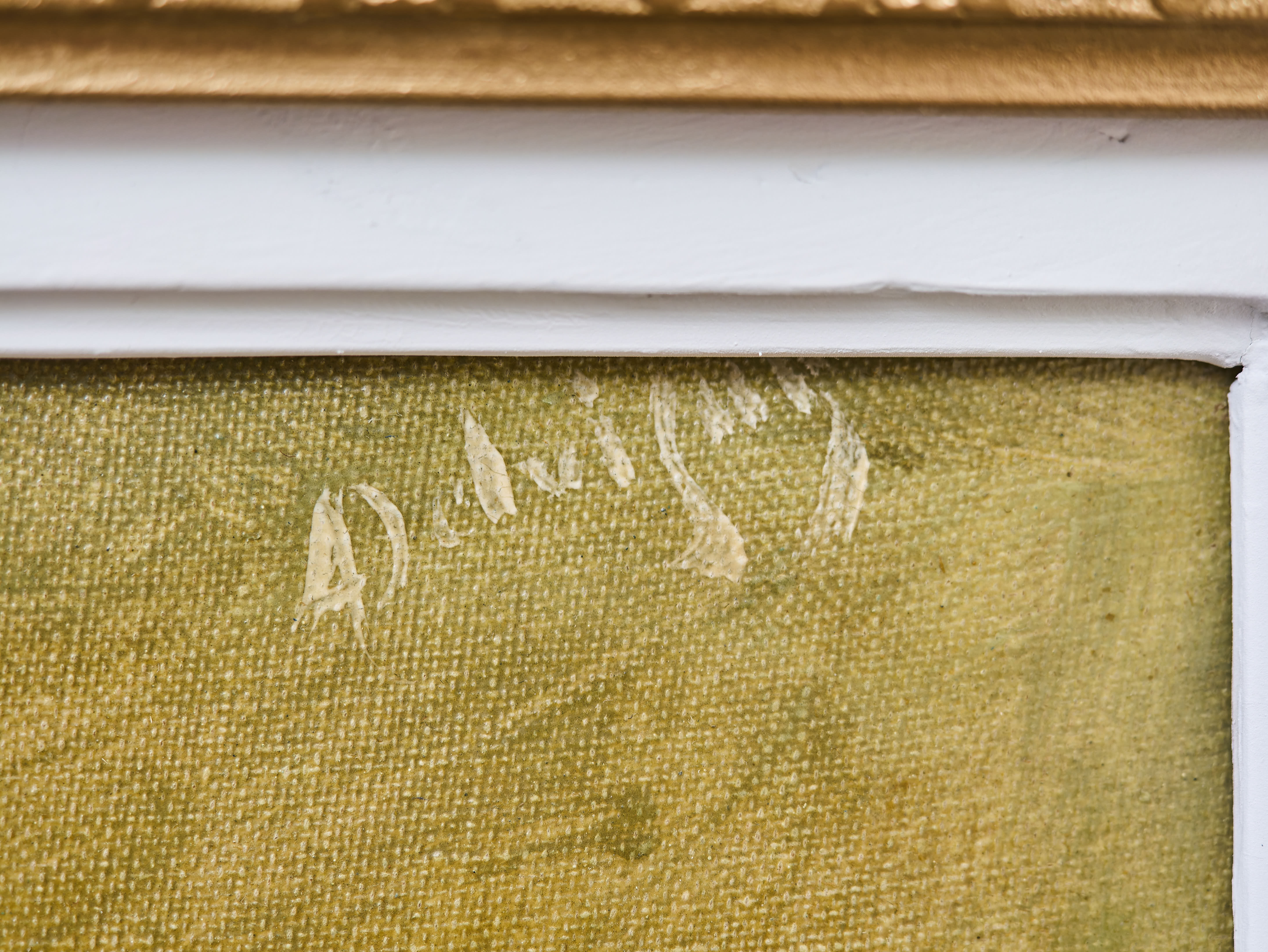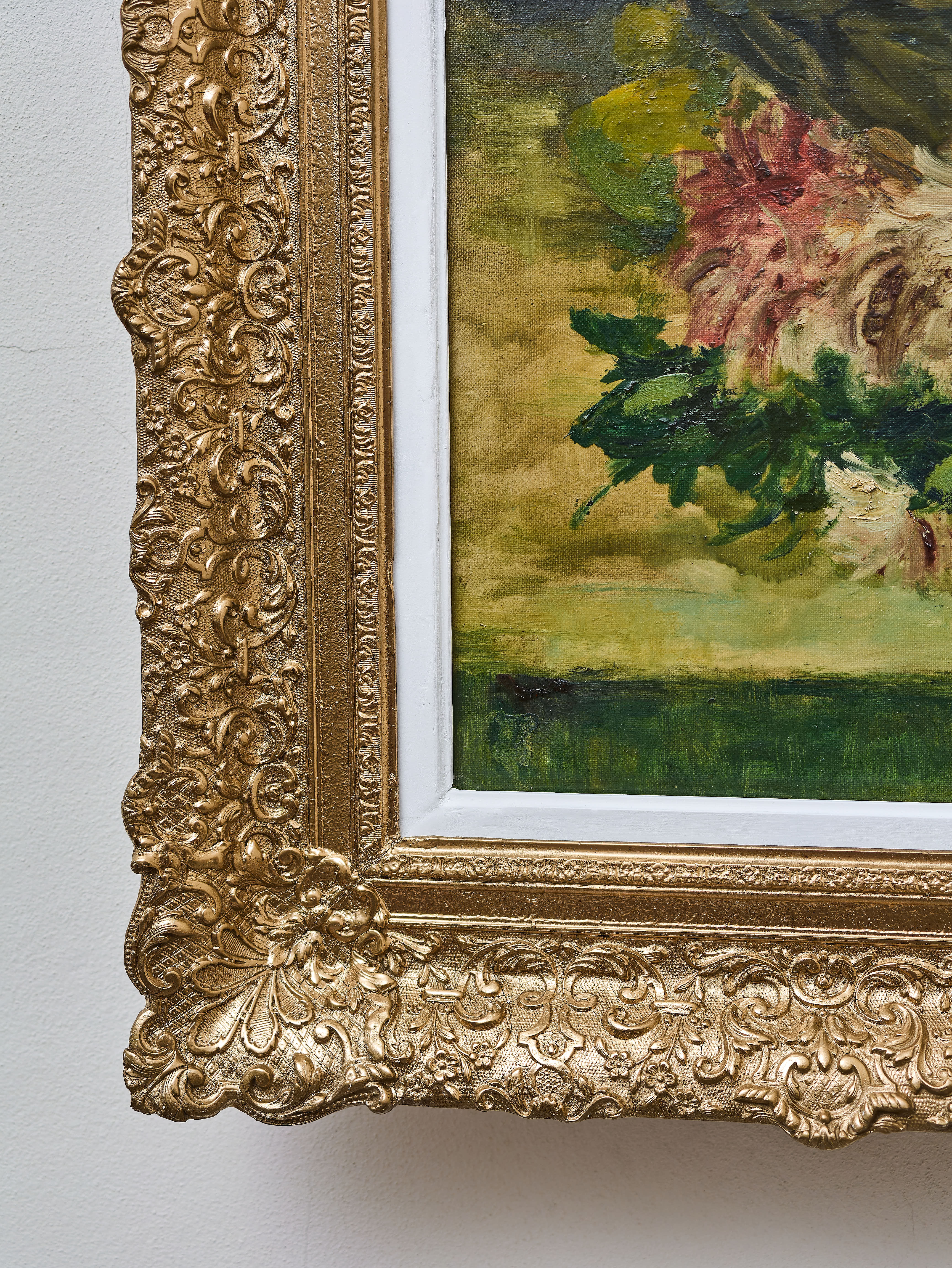 Malba je zasazena do bohatě zdobeného rámu s plastickým zlaceným dekorem, který podtrhuje její reprezentativní charakter. Celkový dojem díla je klidný a harmonický, a přitom plný života a barevné energie. Takto laděné zátiší představuje nejen esteticky působivý prvek, ale i výraz klasického malířského mistrovství, které zůstává nadčasové.