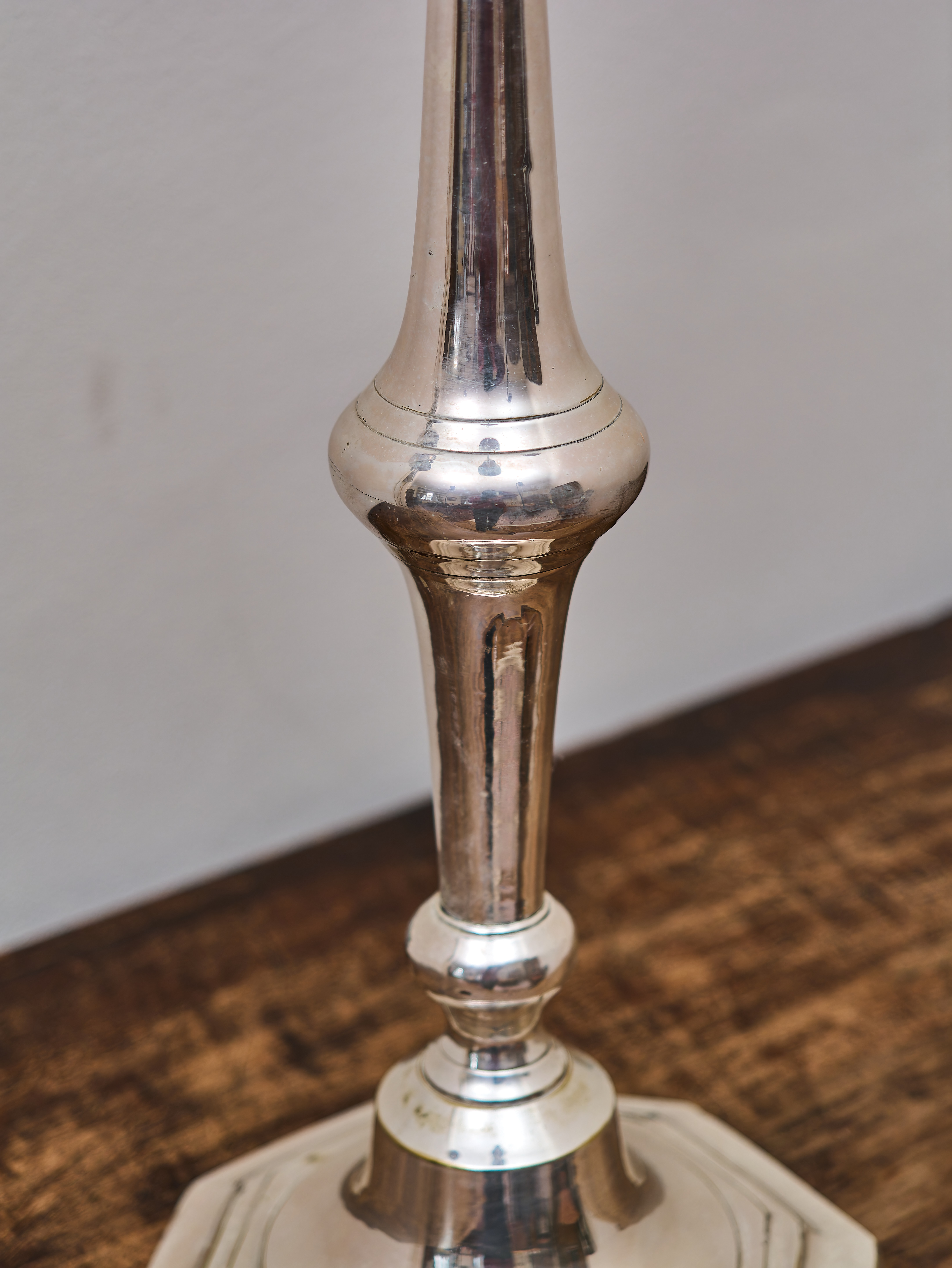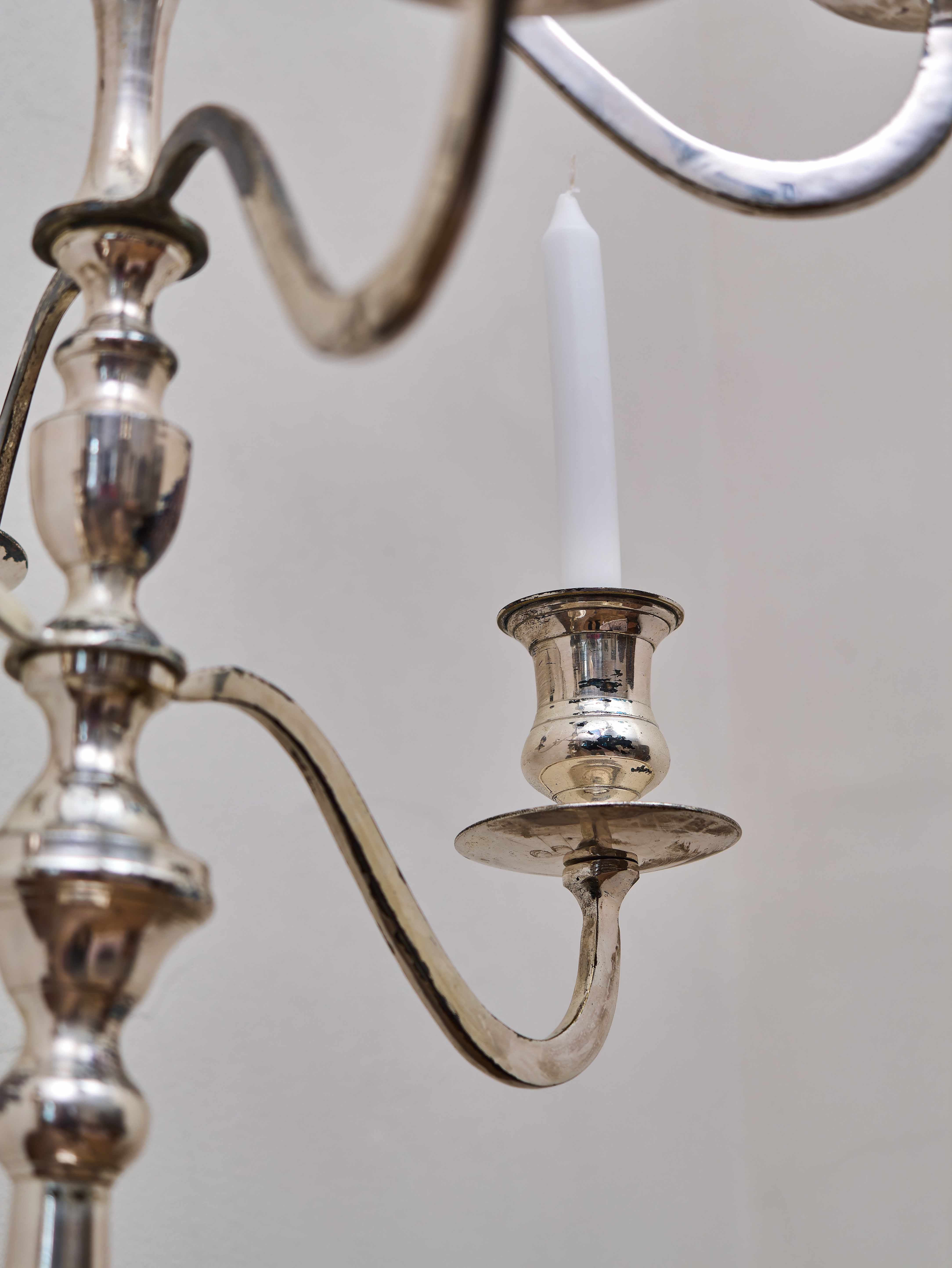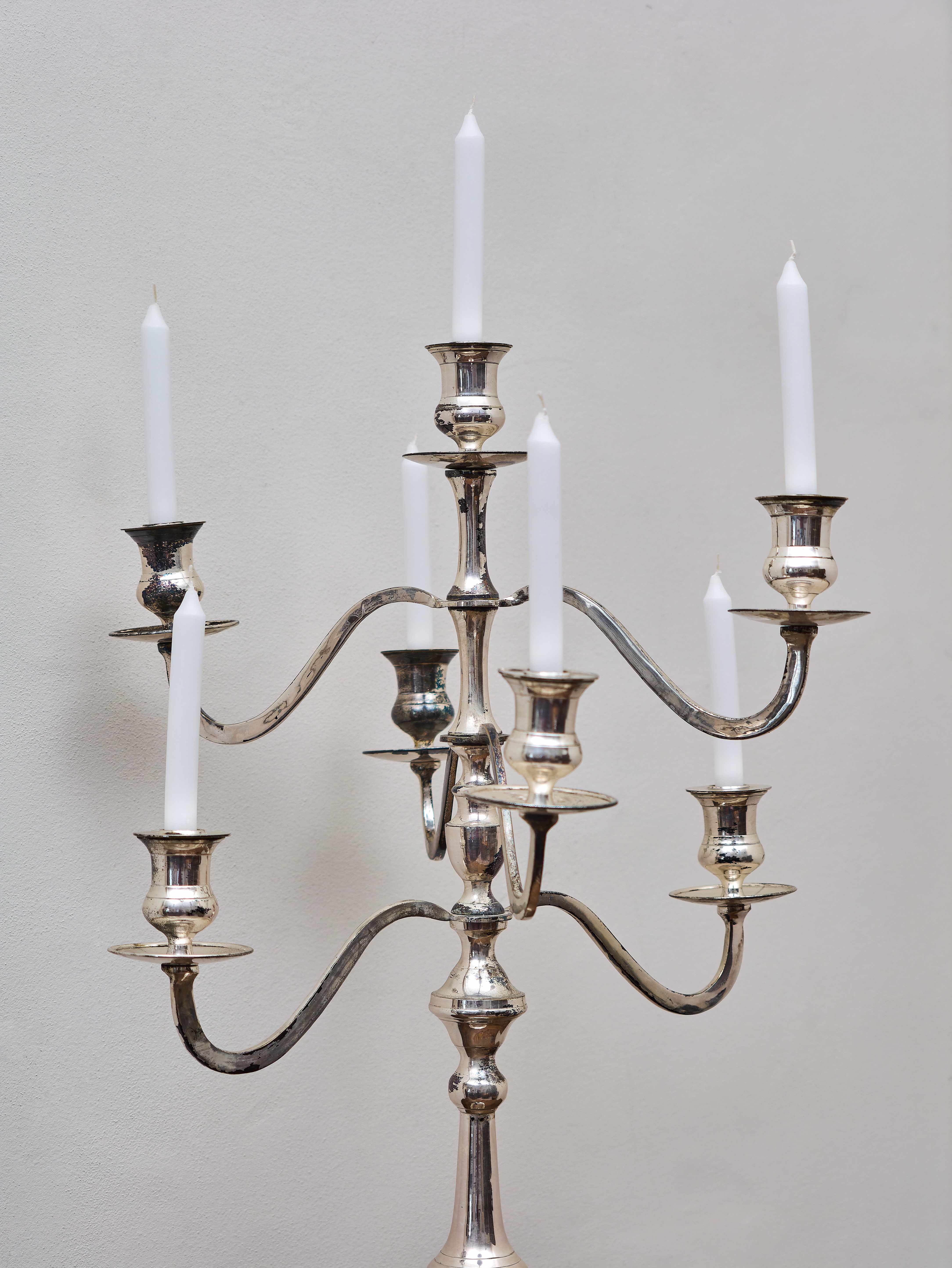 Velký sedmiramenný svícen z kovu se stříbřeným povrchem, zhotovený v klasickém historizujícím stylu. Svícen stojí na široké osmihranné základně a má vysoký, elegantně profilovaný dřík, z něhož vyrůstají symetricky tvarovaná ramena nesoucí šest svíček, zatímco sedmá svíce je umístěna na vrcholu centrálního sloupku. Celek vytváří vyváženou a velmi dekorativní kompozici typickou pro slavnostní stolní či interiérové osvětlení.