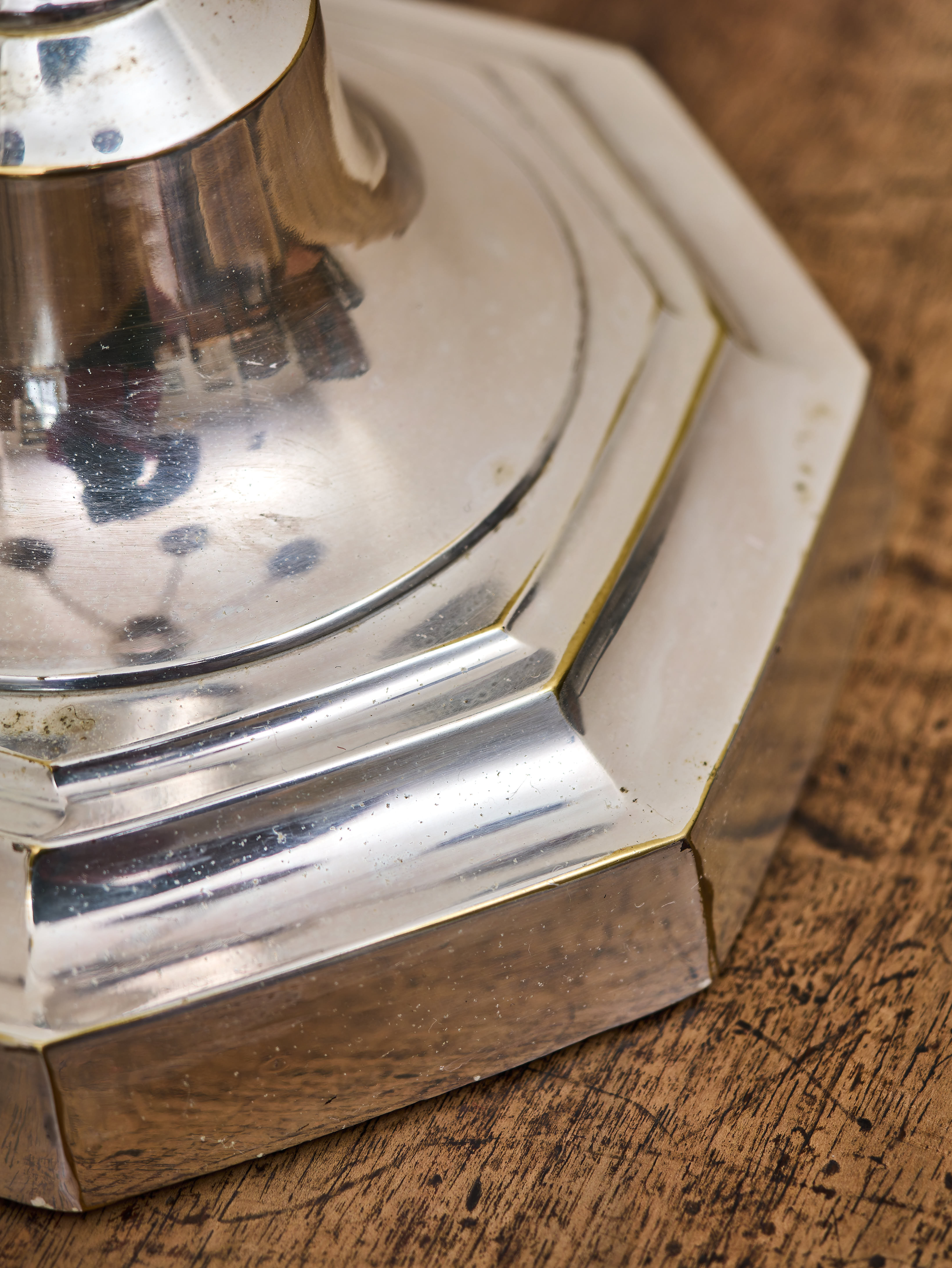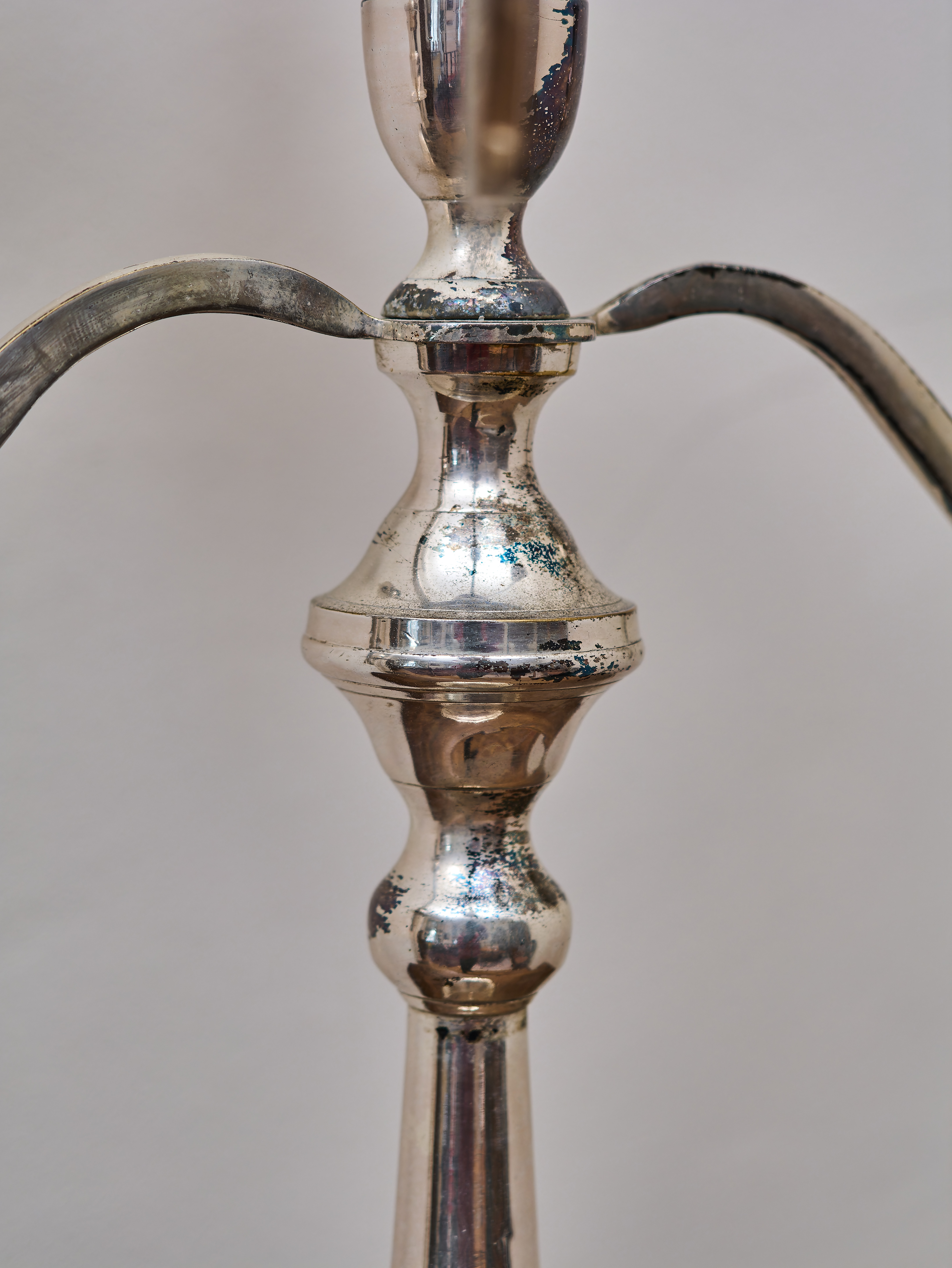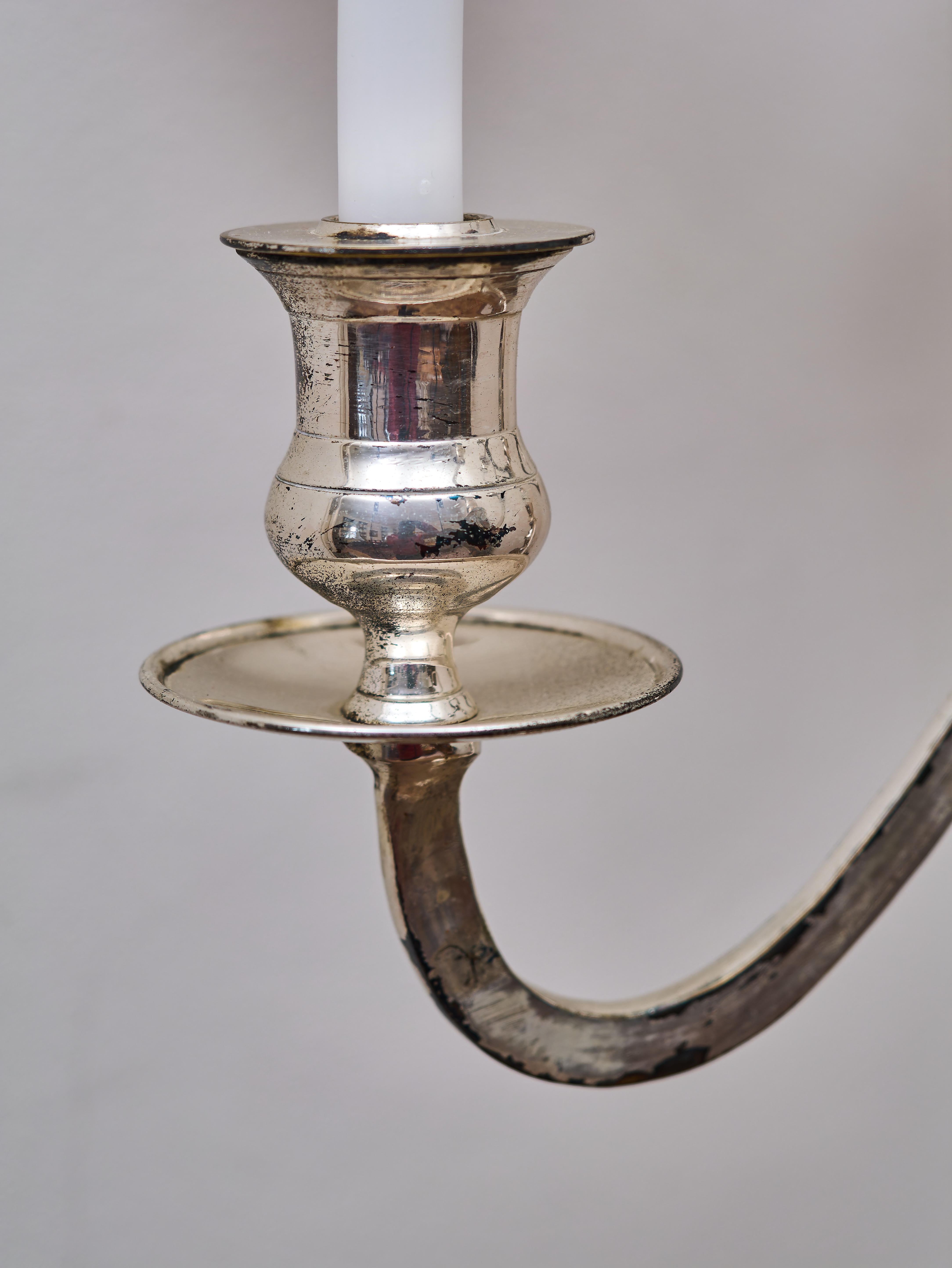 Ramena svícnu jsou jemně prohnutá a zakončená kalichovitými objímkami s miskami zachycujícími vosk. Lesklý stříbřený povrch zvýrazňuje plastické tvarování jednotlivých částí a dodává svícnu reprezentativní charakter. Patina a drobné známky užívání na povrchu odpovídají stáří předmětu a podtrhují jeho autentický vzhled.