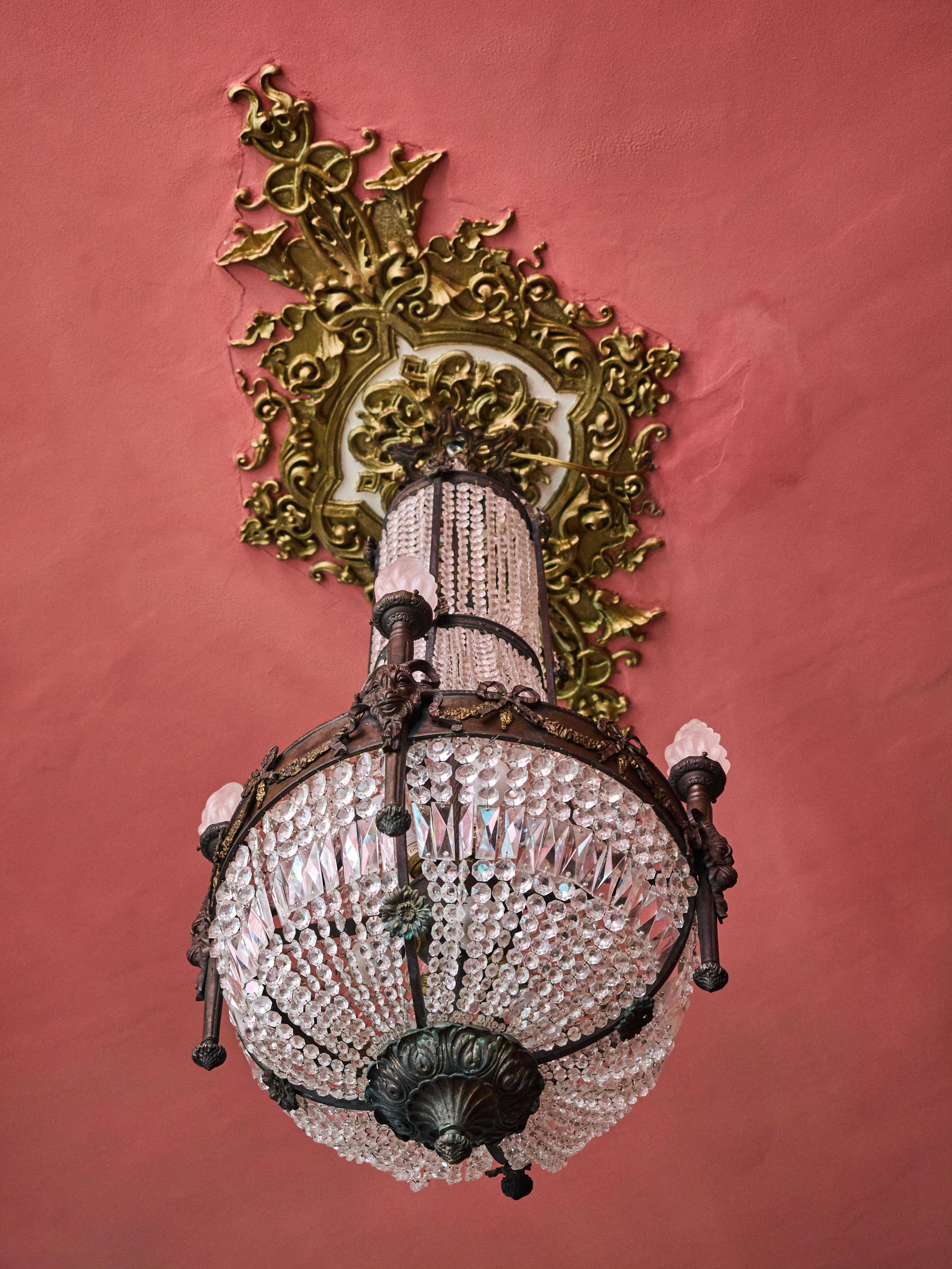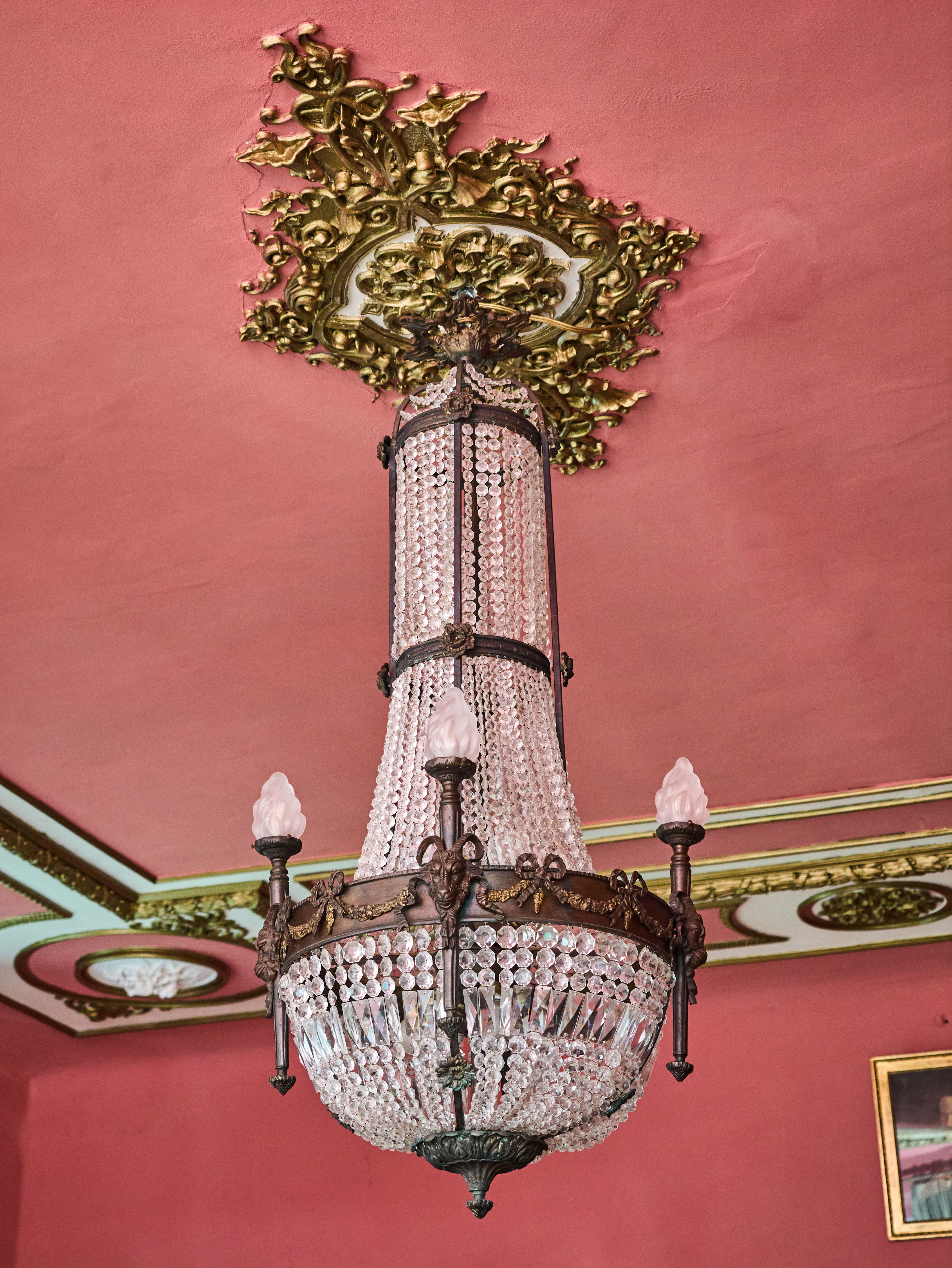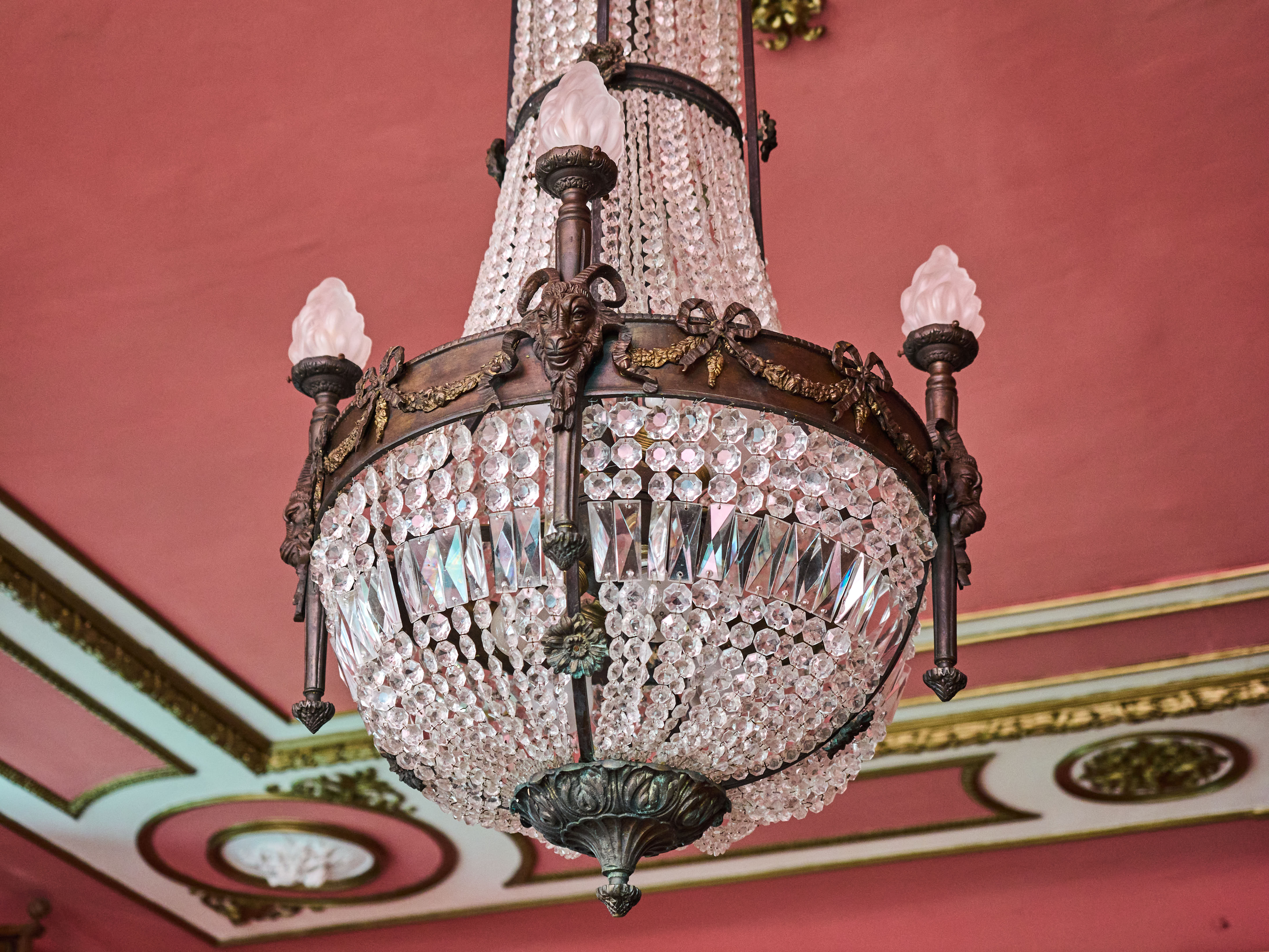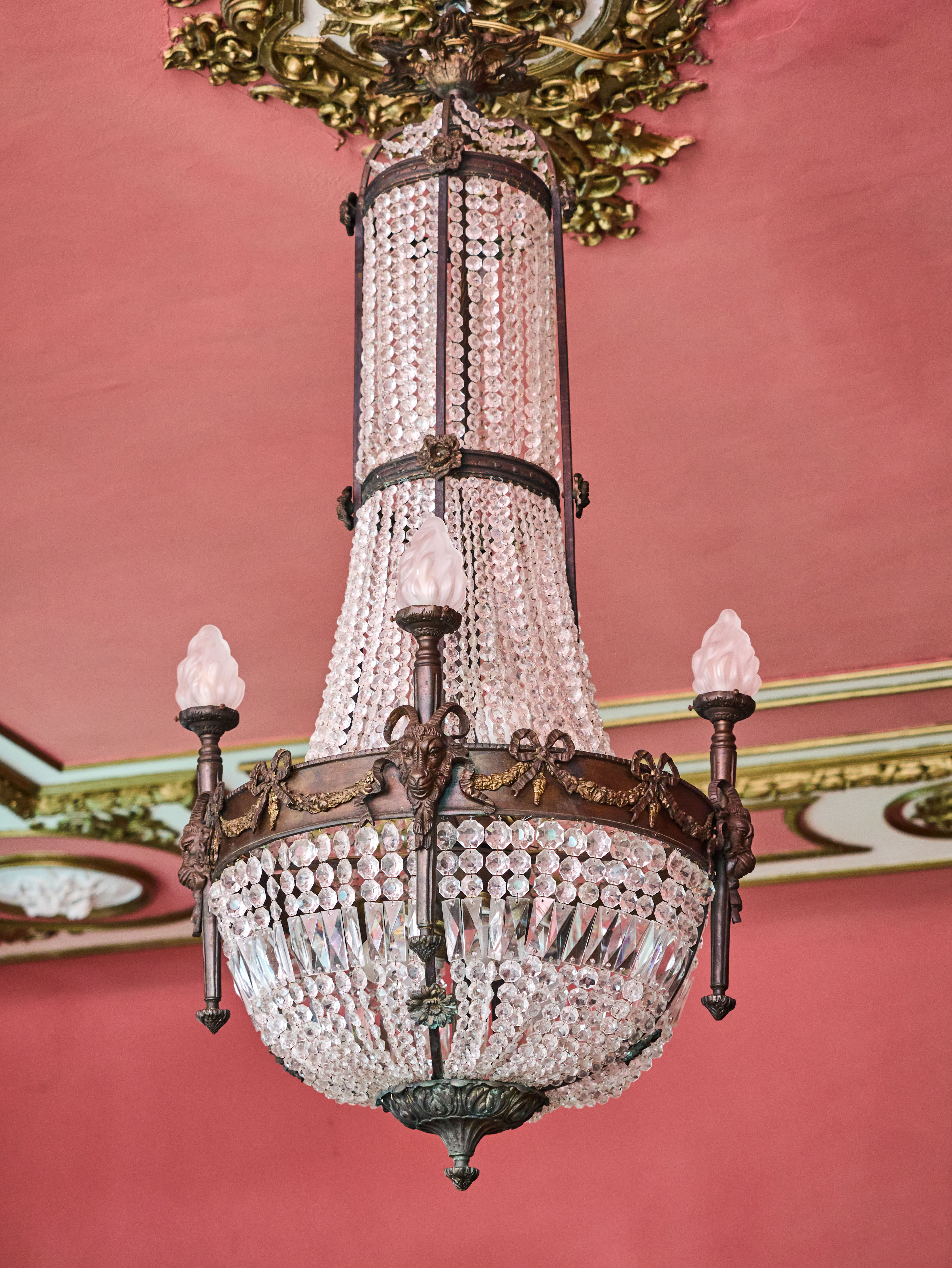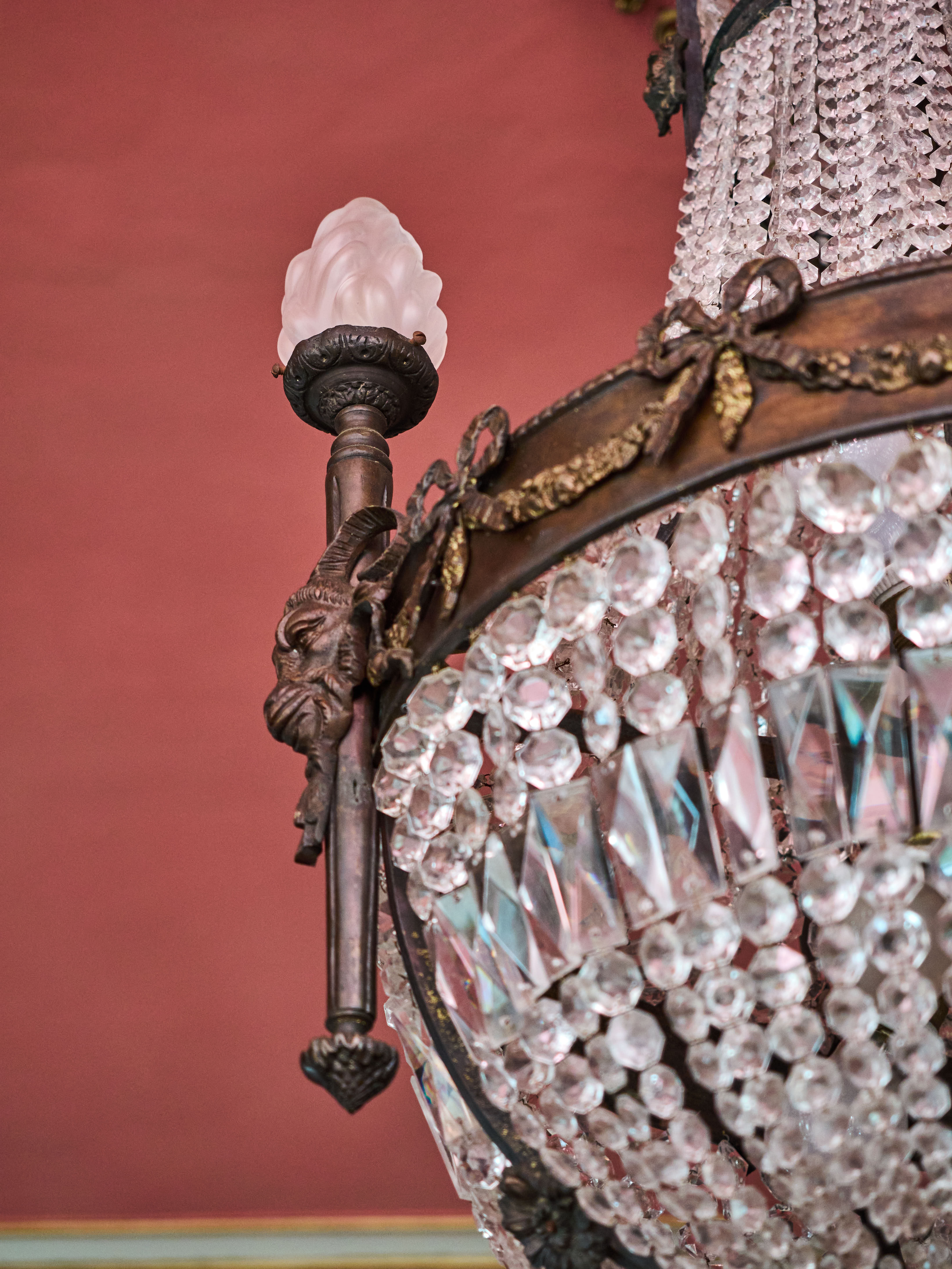 Zrestaurovaný zámecký lustr z bronzu, ručně broušeného a leštěného křišťálu a skleněných stínidel ve tvaru pochodně. Lustr má elektroinstalaci kompletně v mědi. Ověsy jsou vyčištěné. Lustr je zdobený květy, klasicistním mašlovým motivem Ludvíka XVI a hlavami beranů. Lustr je na žárovky s paticemi E14 v ramenech (4X) a E27 uvnitř lustru (8X)- vhdoné jsou normální, halogenové i led žárovky.