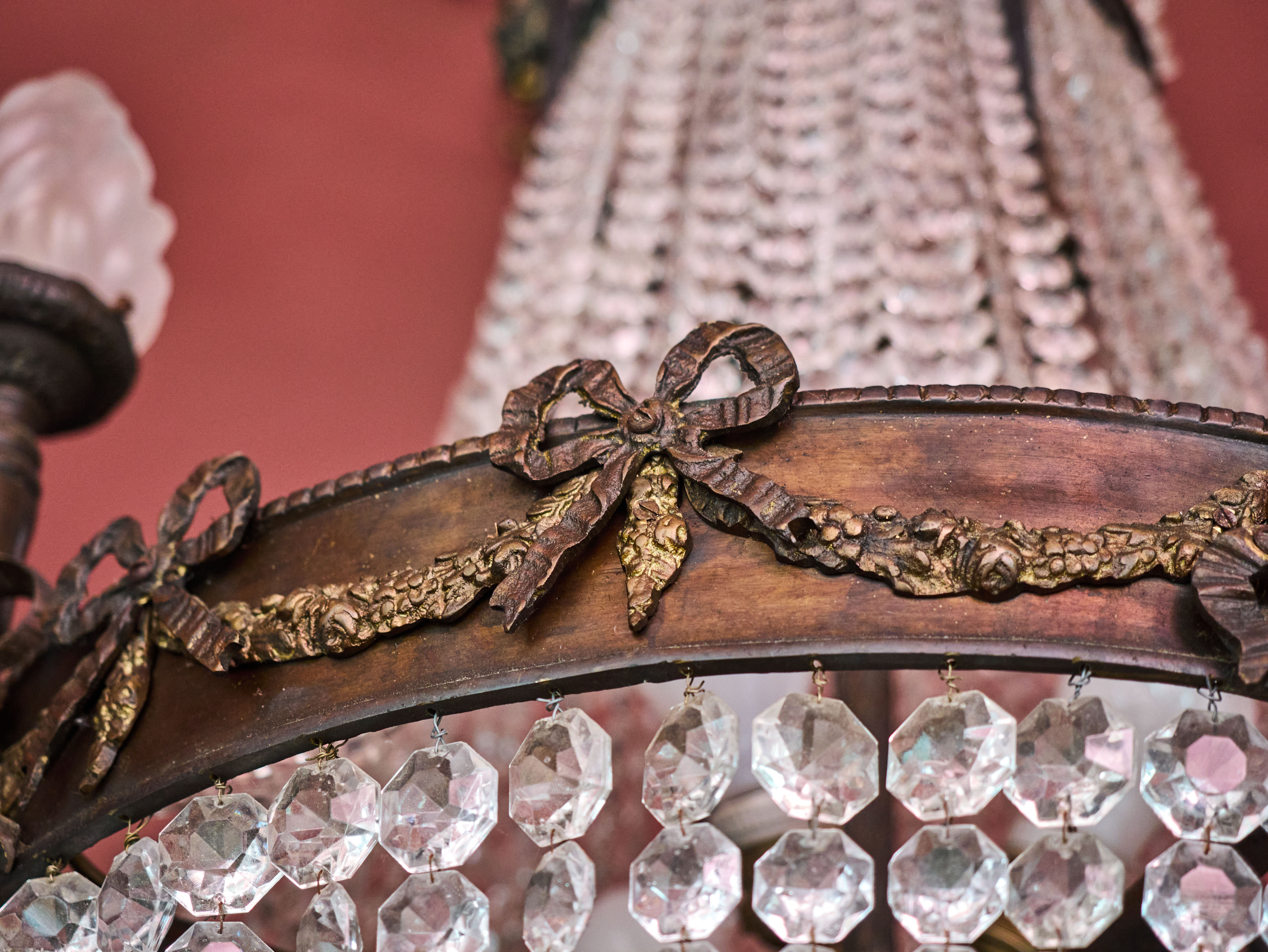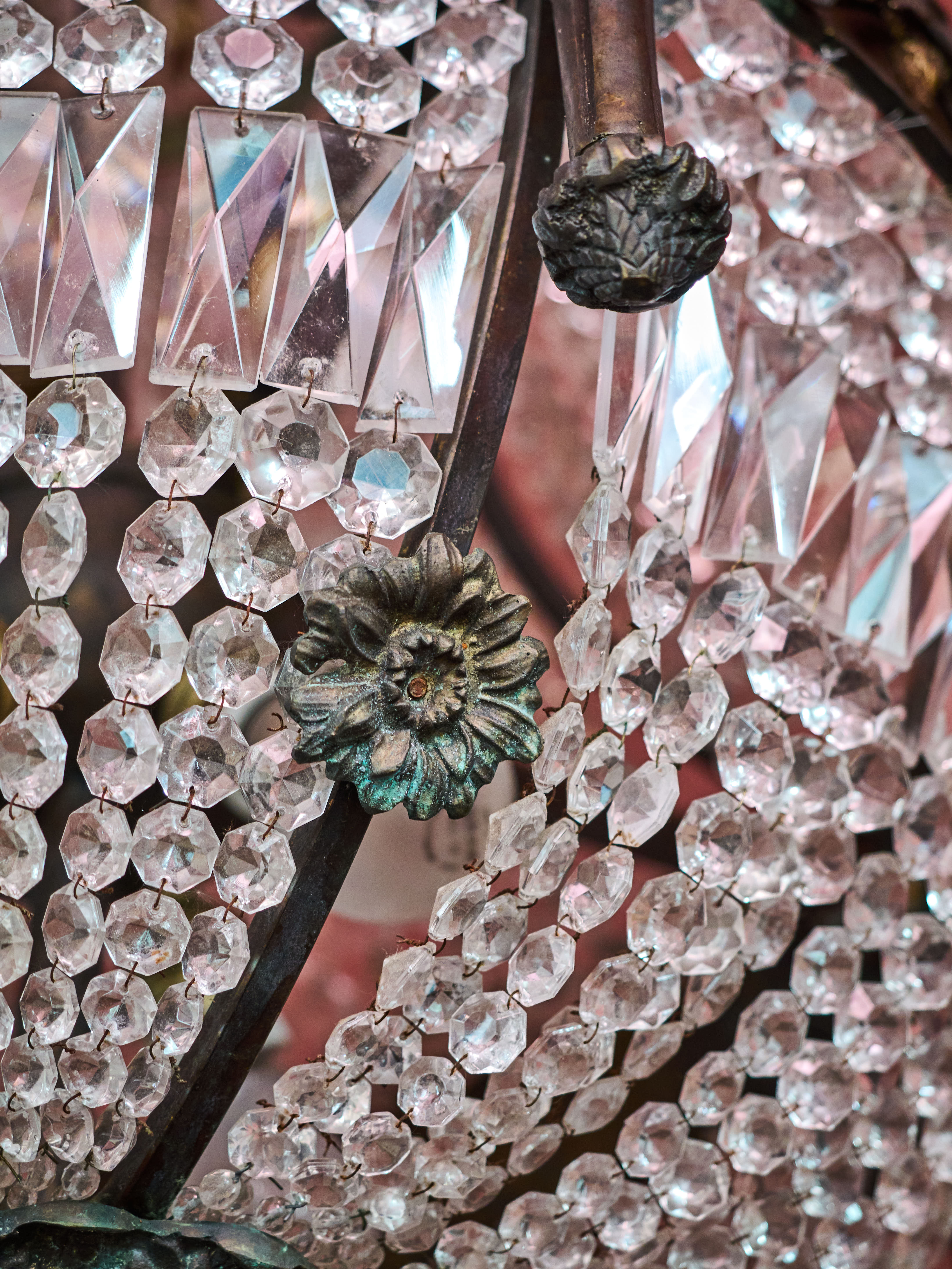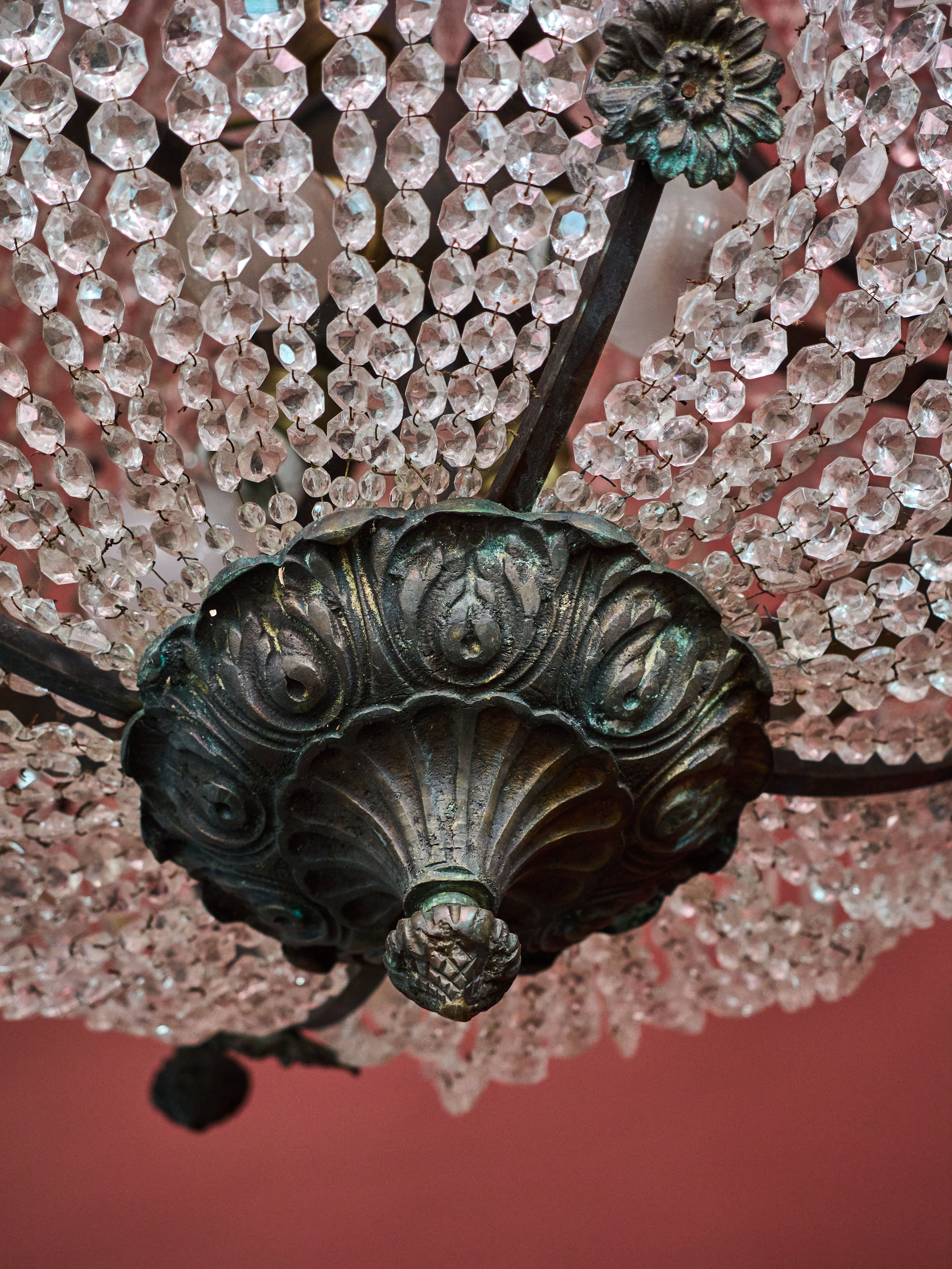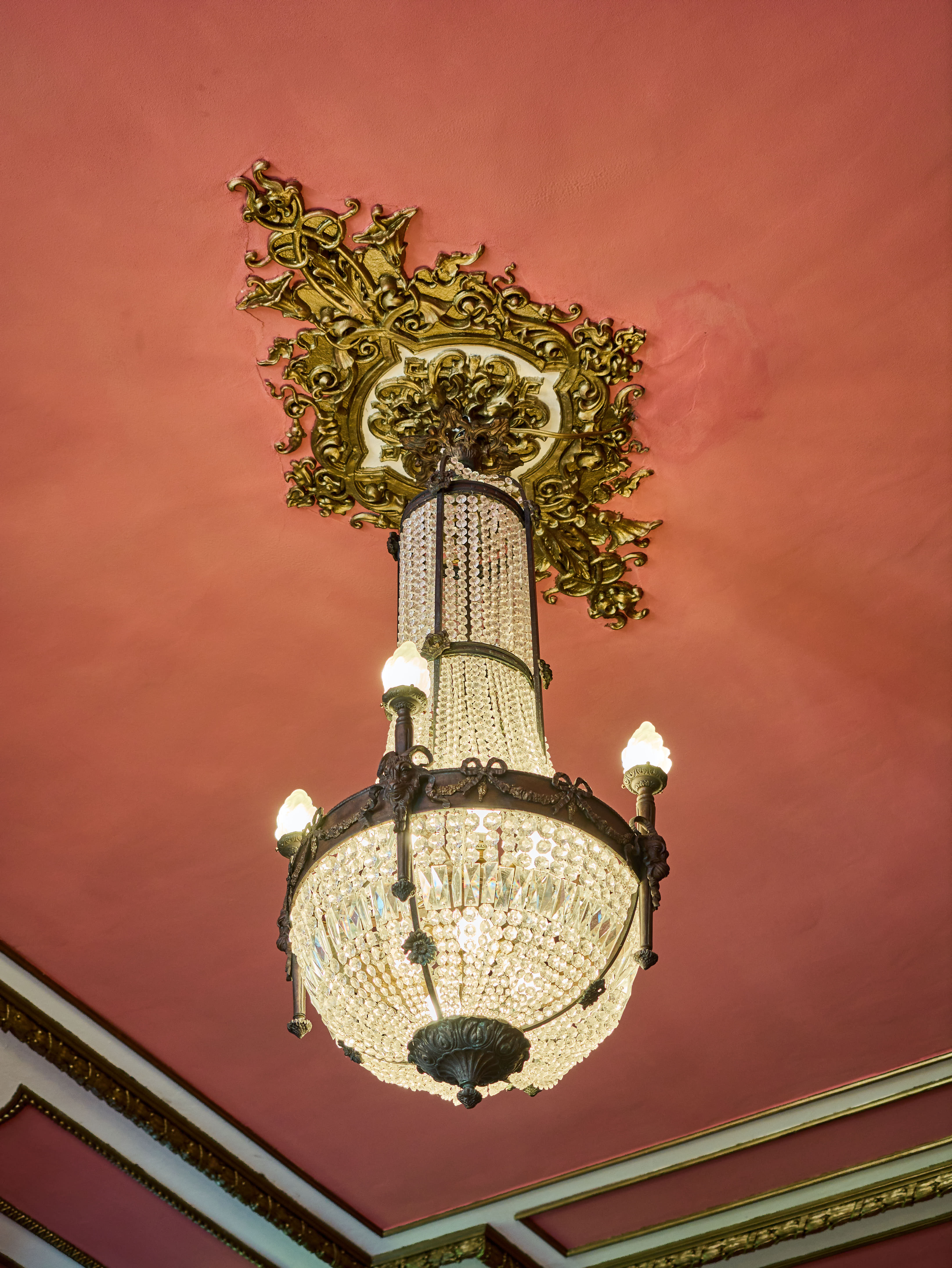 Zrestaurovaný zámecký lustr z bronzu, ručně broušeného a leštěného křišťálu a skleněných stínidel ve tvaru pochodně. Lustr má elektroinstalaci kompletně v mědi. Ověsy jsou vyčištěné. Lustr je zdobený květy, klasicistním mašlovým motivem Ludvíka XVI a hlavami beranů. Lustr je na žárovky s paticemi E14 v ramenech (4X) a E27 uvnitř lustru (8X)- vhdoné jsou normální, halogenové i led žárovky.