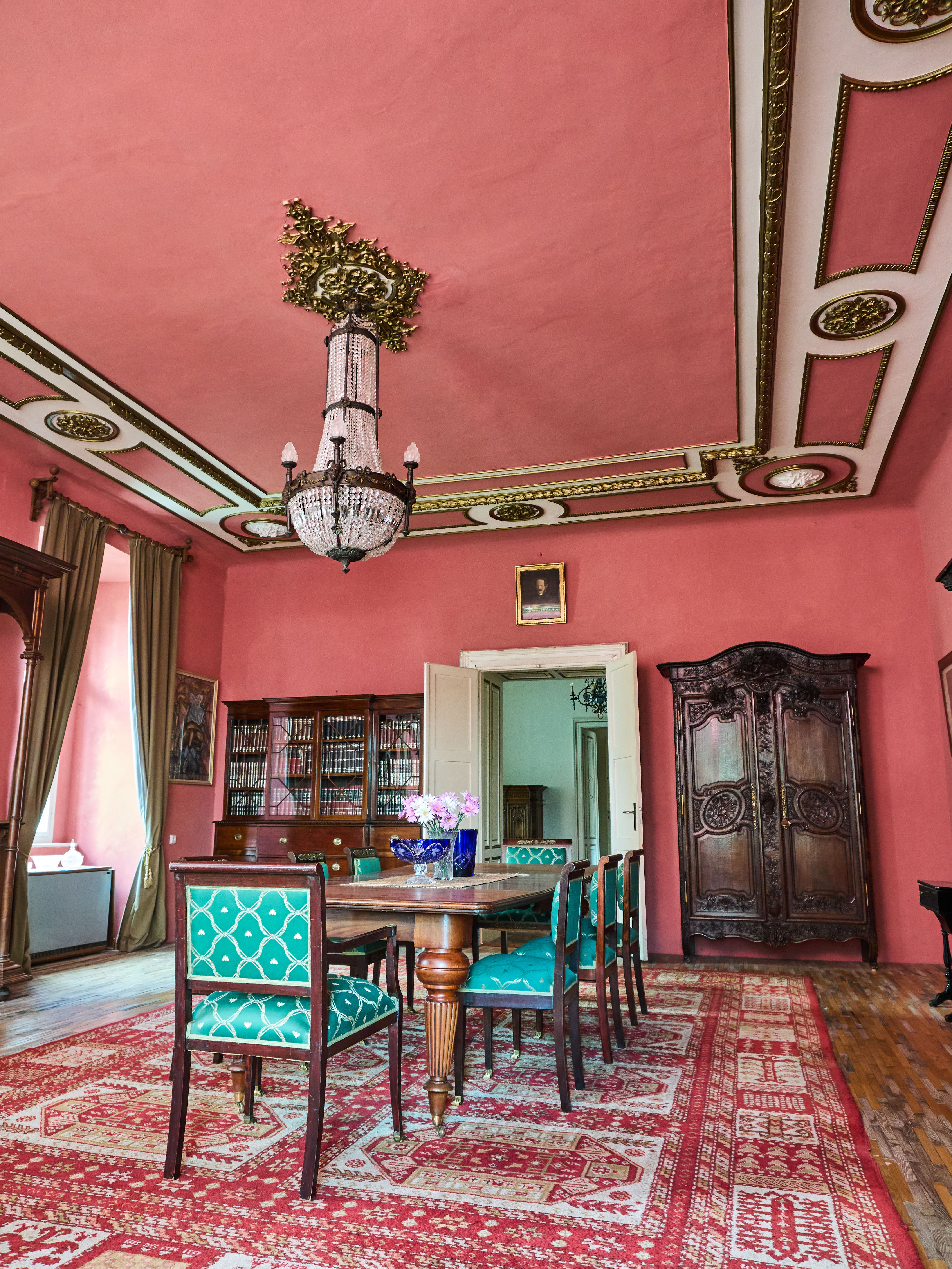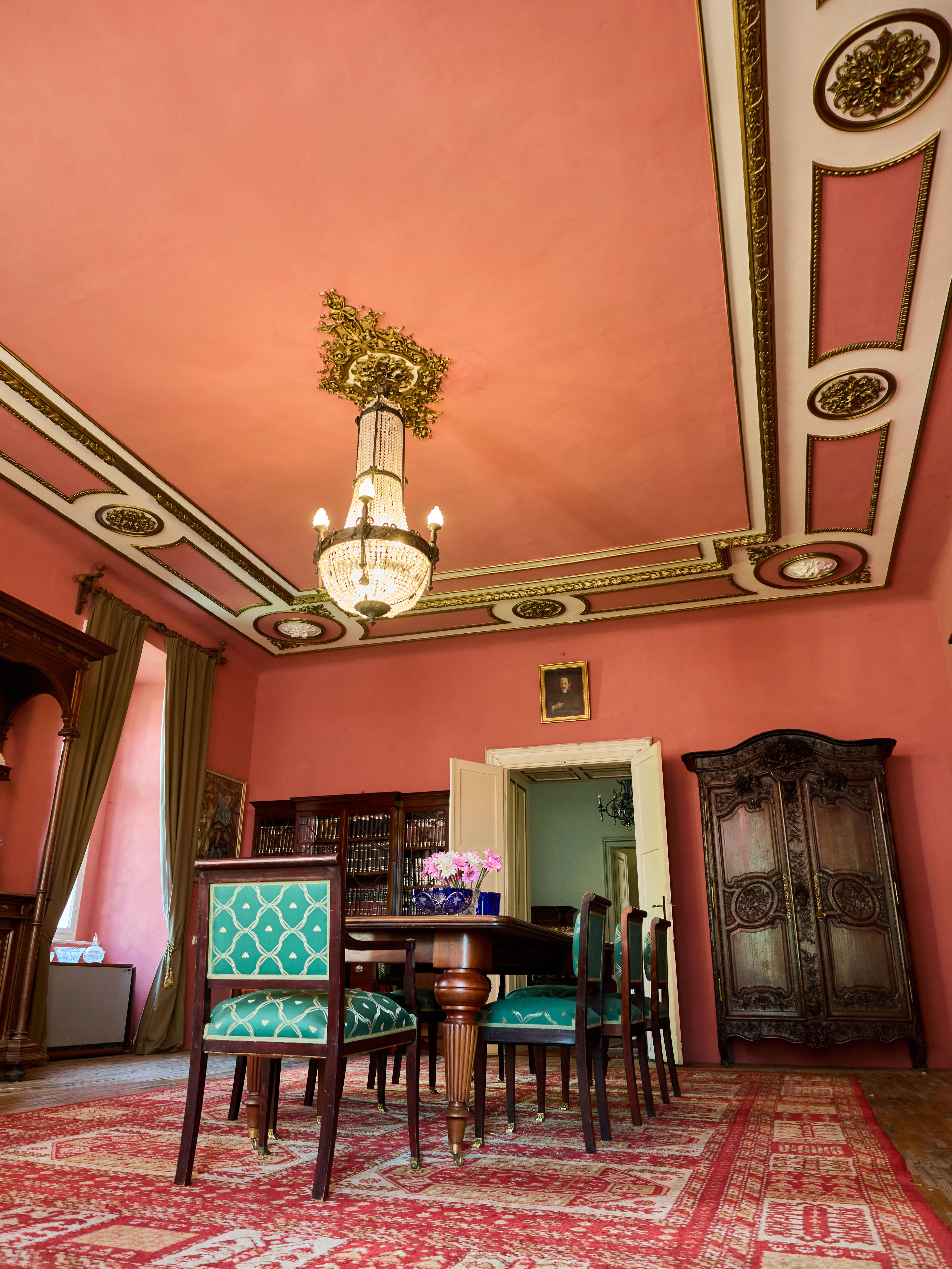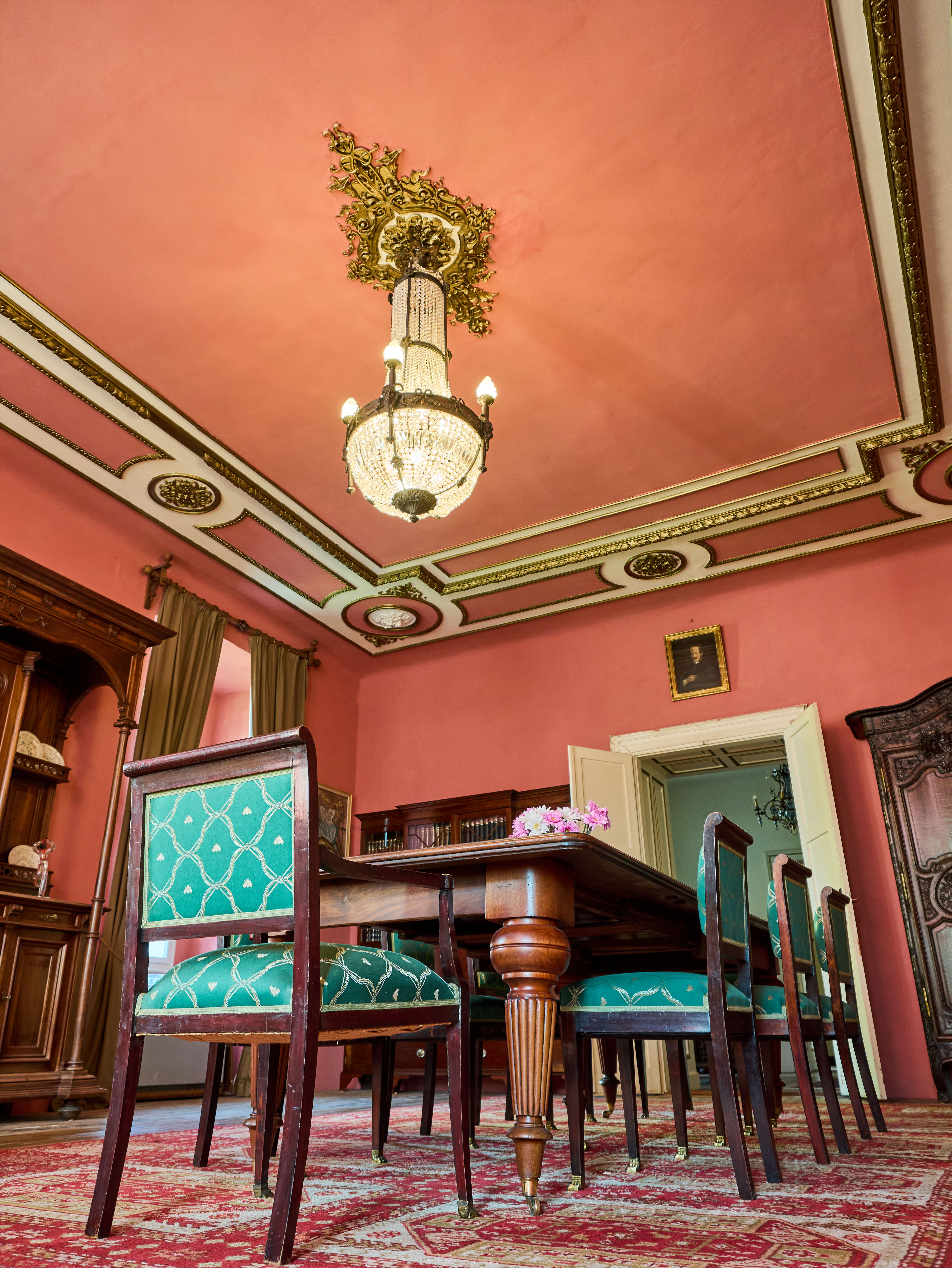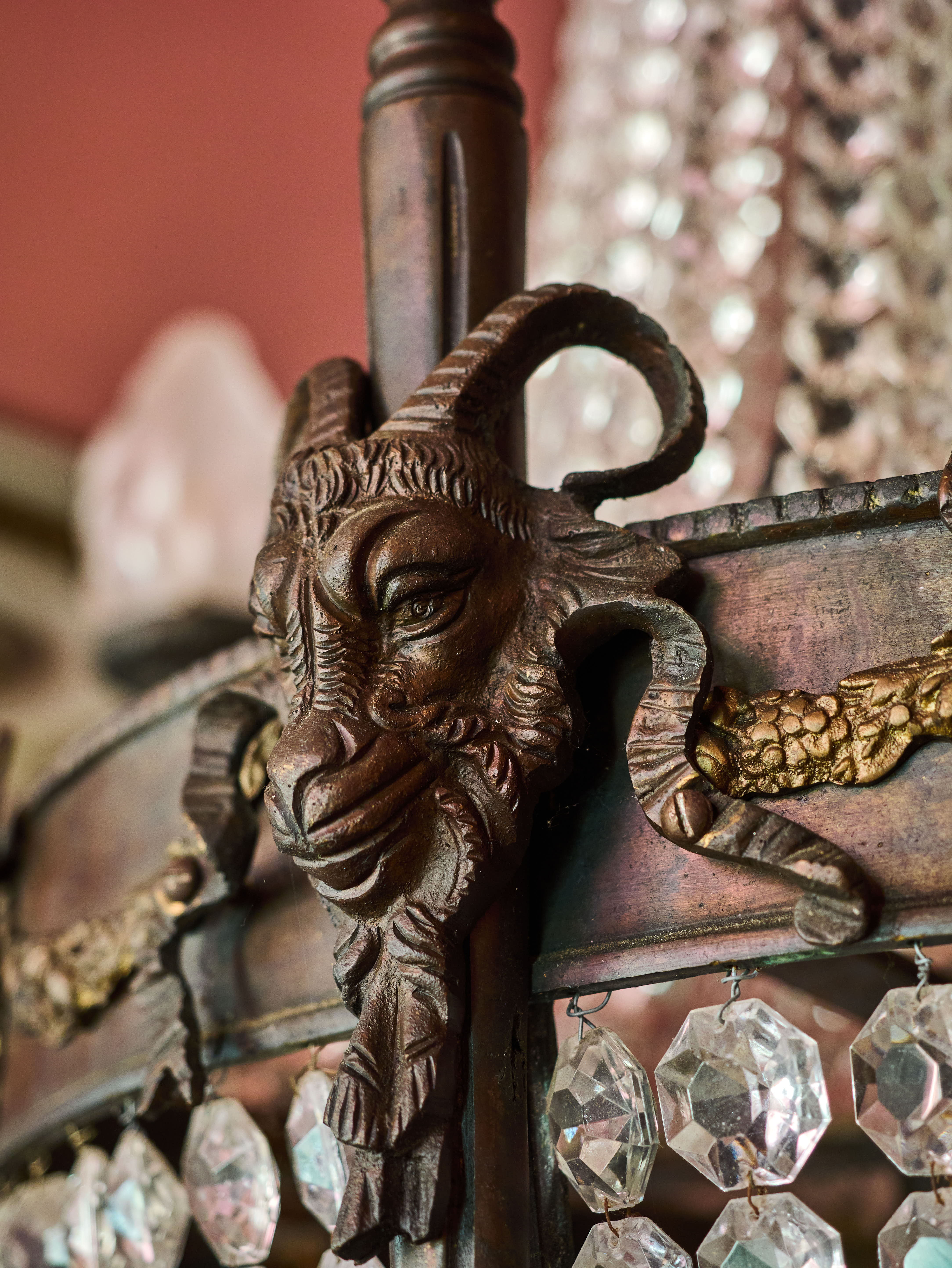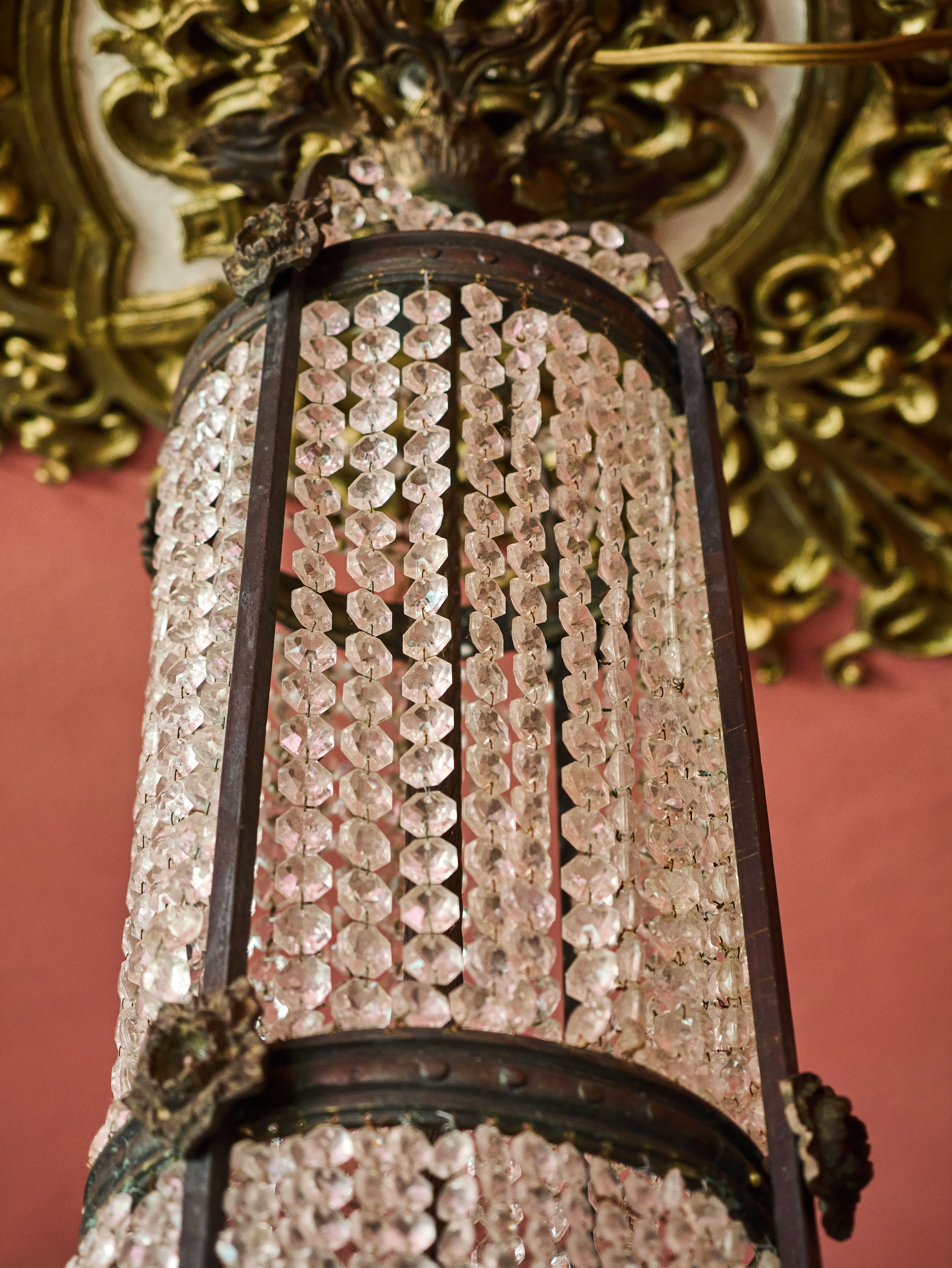 Zrestaurovaný zámecký lustr z bronzu, ručně broušeného a leštěného křišťálu a skleněných stínidel ve tvaru pochodně. Lustr má elektroinstalaci kompletně v mědi. Ověsy jsou vyčištěné. Lustr je zdobený květy, klasicistním mašlovým motivem Ludvíka XVI a hlavami beranů. Lustr je na žárovky s paticemi E14 v ramenech (4X) a E27 uvnitř lustru (8X)- vhdoné jsou normální, halogenové i led žárovky.