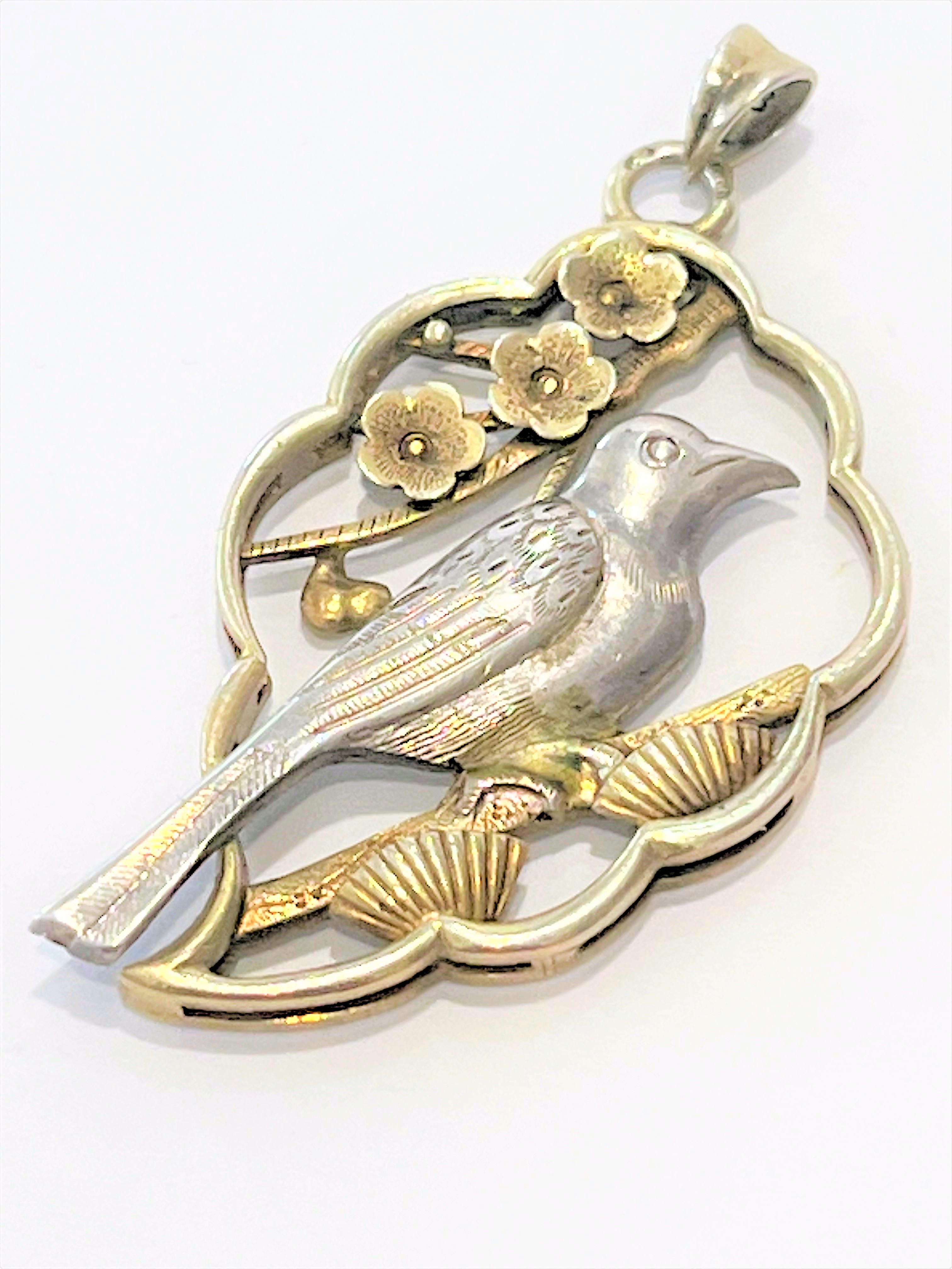 Krásný velký starožitný stříbrný přívěsek s motivem ptáčka, zdobený jemně pozlacenými květinami o hmotnosti 5,24 g. Velikost přívěsku na výšku cca 4,5 cm, včetně závěsného ouška.