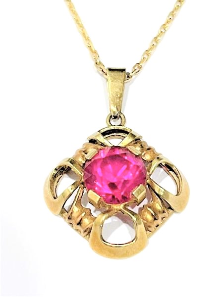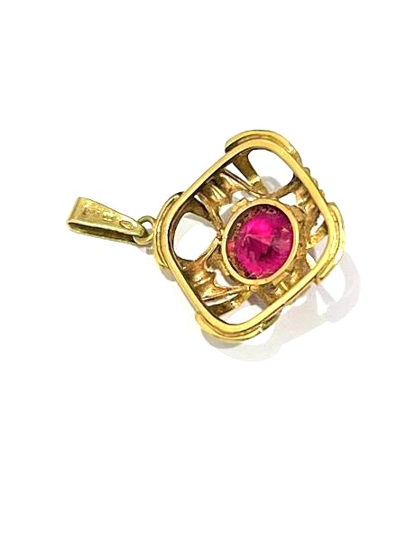Starožitný zlatý přívěšek se syntetickým rubínem AU 585/1000 – žluté zlato 14 karátů 2,69 gramů brutto. Puncováno historickým puncem Čejkou. Řetízek není v ceně. Velmi hezký stav přívěšku.