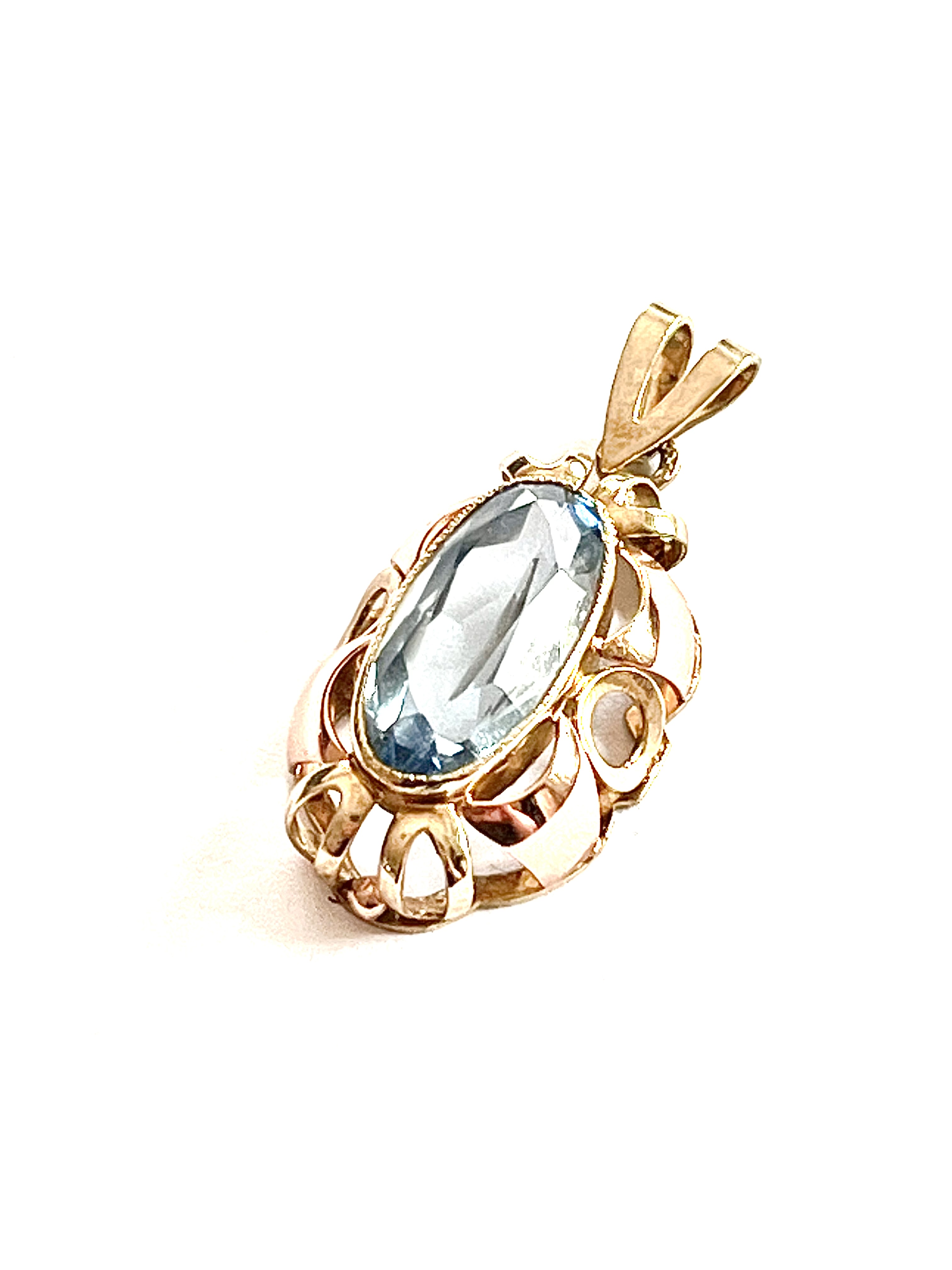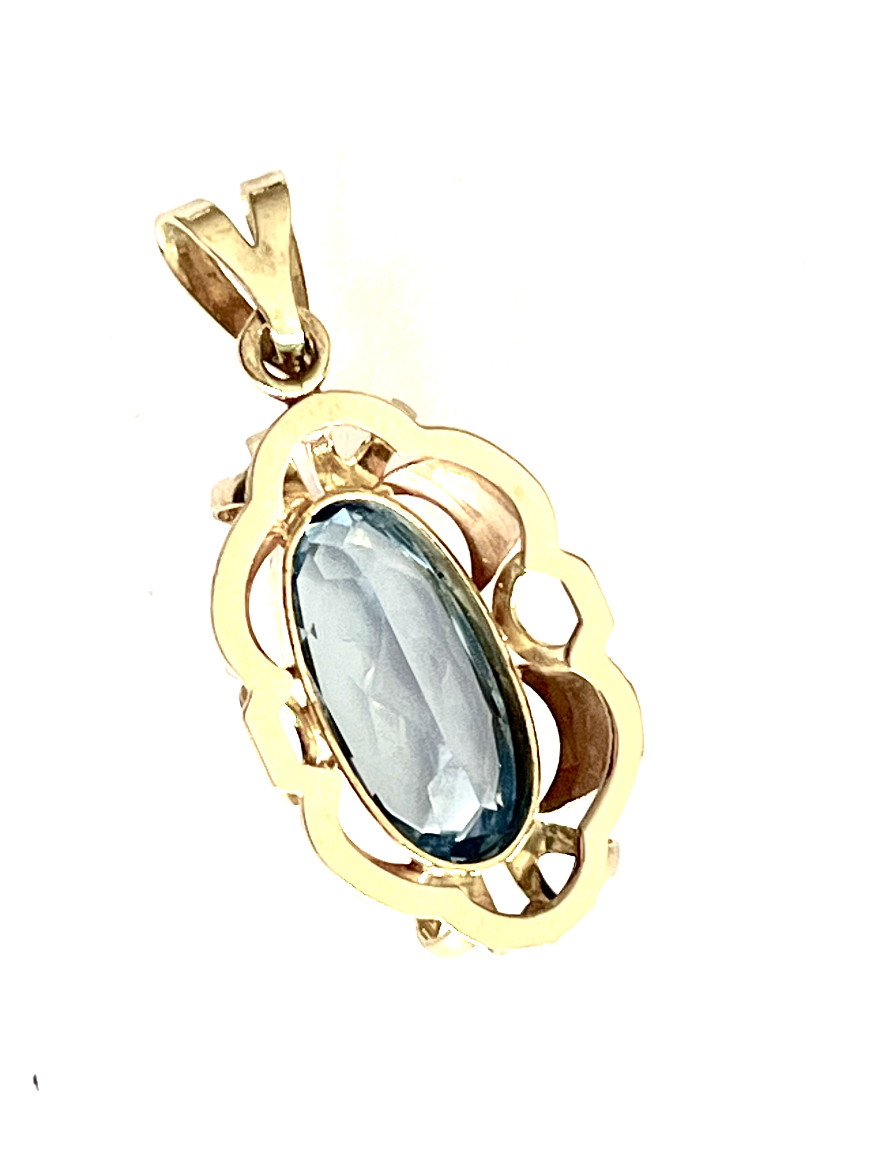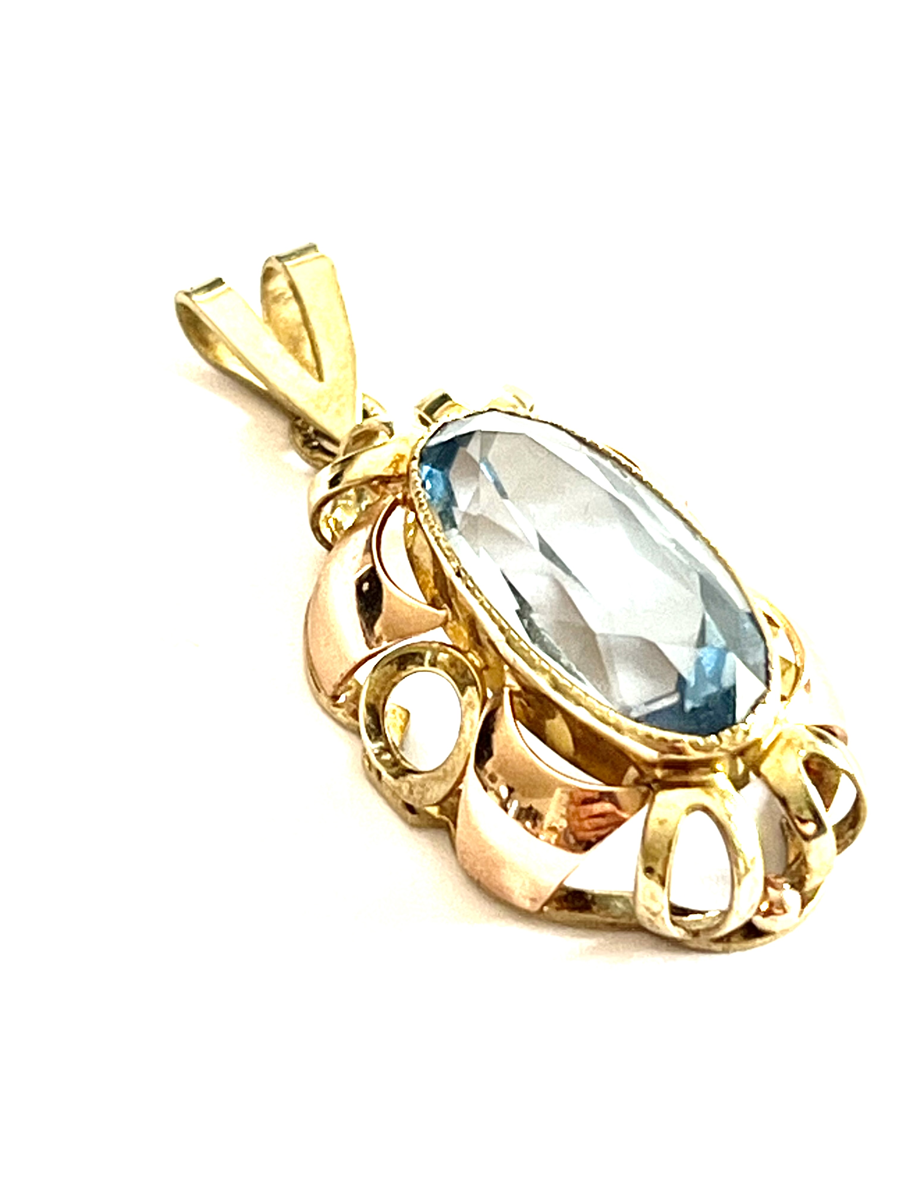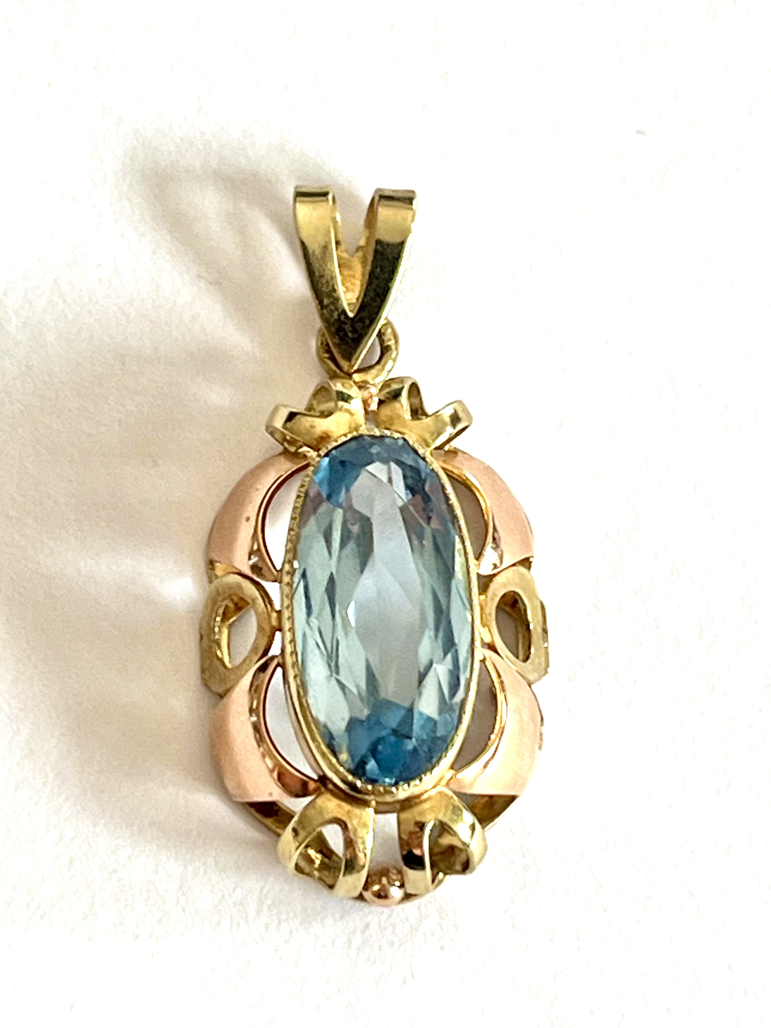 Velký přívěšek ze 14 karátového zlata, ručně vyrobený v kombinaci žlutého a růžového zlata se světle modrým kamenem. Přívěšek je opuncovaný historickým puncem Čejka. Váha přívěšku brutto 4,06 gramů AU585/000.