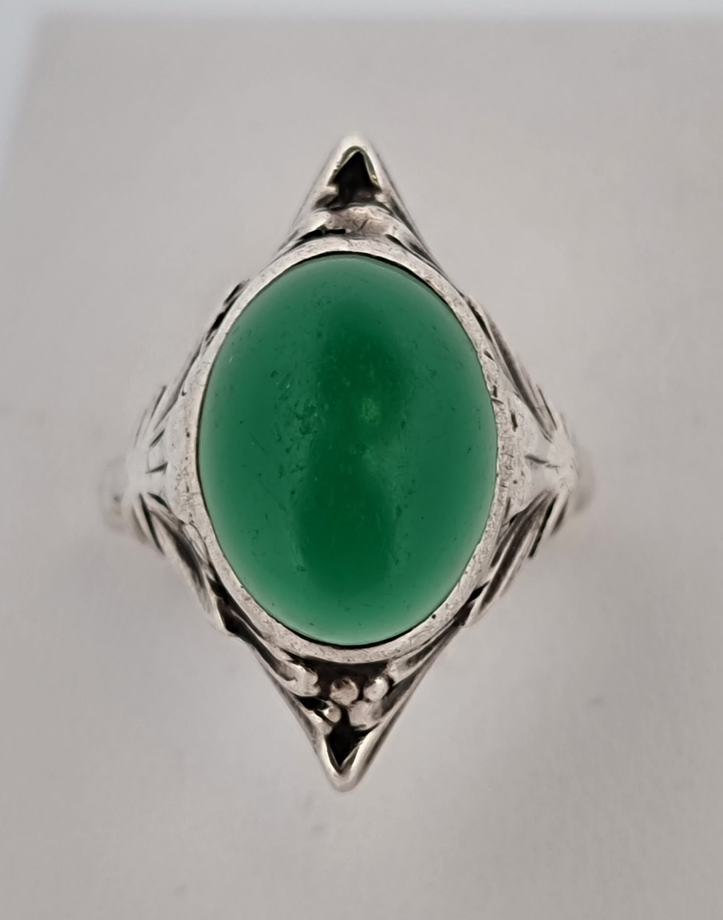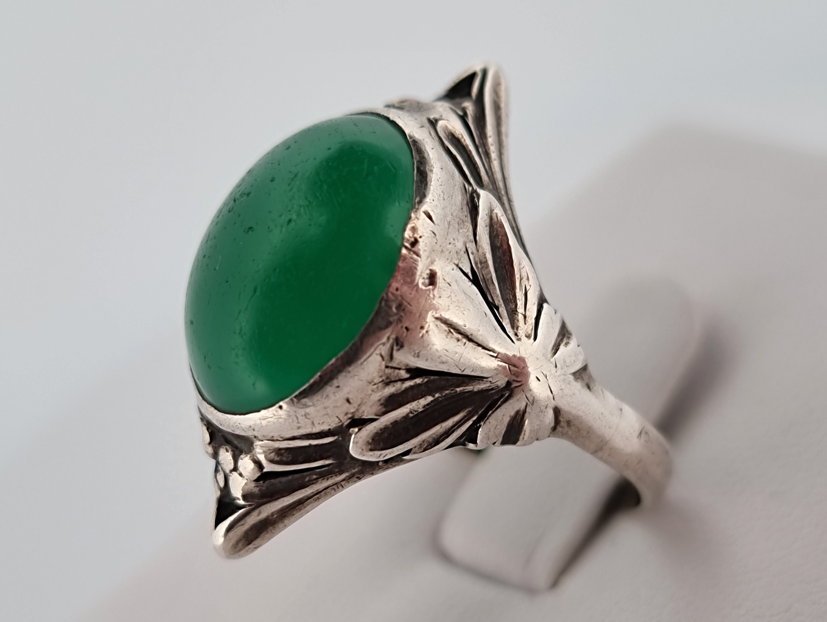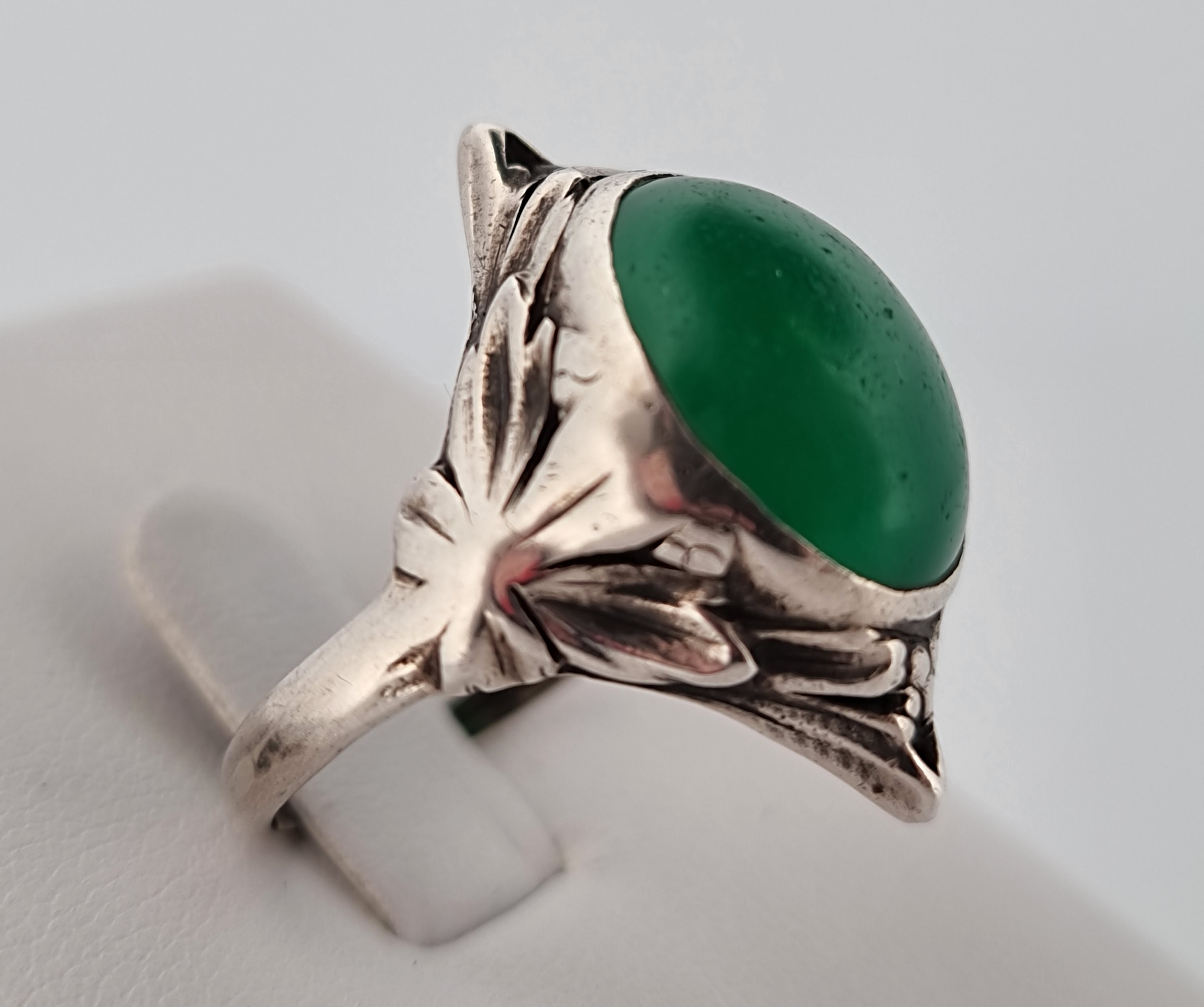 Popis: Stříbrný prsten se zeleným kamenem, pravděpodobně avanturín. Zdobeno, ruční práce.