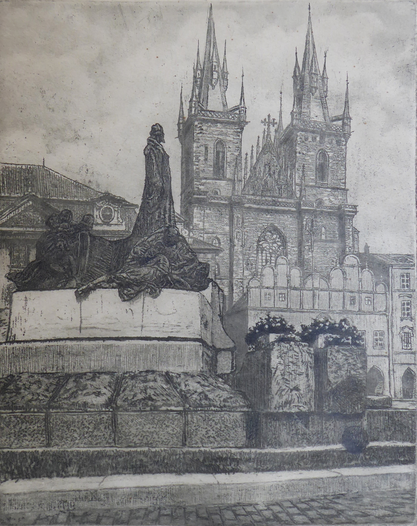 Lept s akvatintou na papíru 195 mm x 155 mm. Signováno vpravo dole tužkou. Sousoší mistra Jana Husa na Staroměstském náměstí v Praze od akademického sochaře Ladislava Šalouna (1870-1946) s kostelem Matky Boží před Týnem v pozadí (též zvaným Kostel Panny Marie před Týnem nebo obecně Týnský chrám). Čechy, Praha 1915 – 1925. Celkový rozměr s papírovou paspartou 320 mm x 220 mm. Nerámováno.