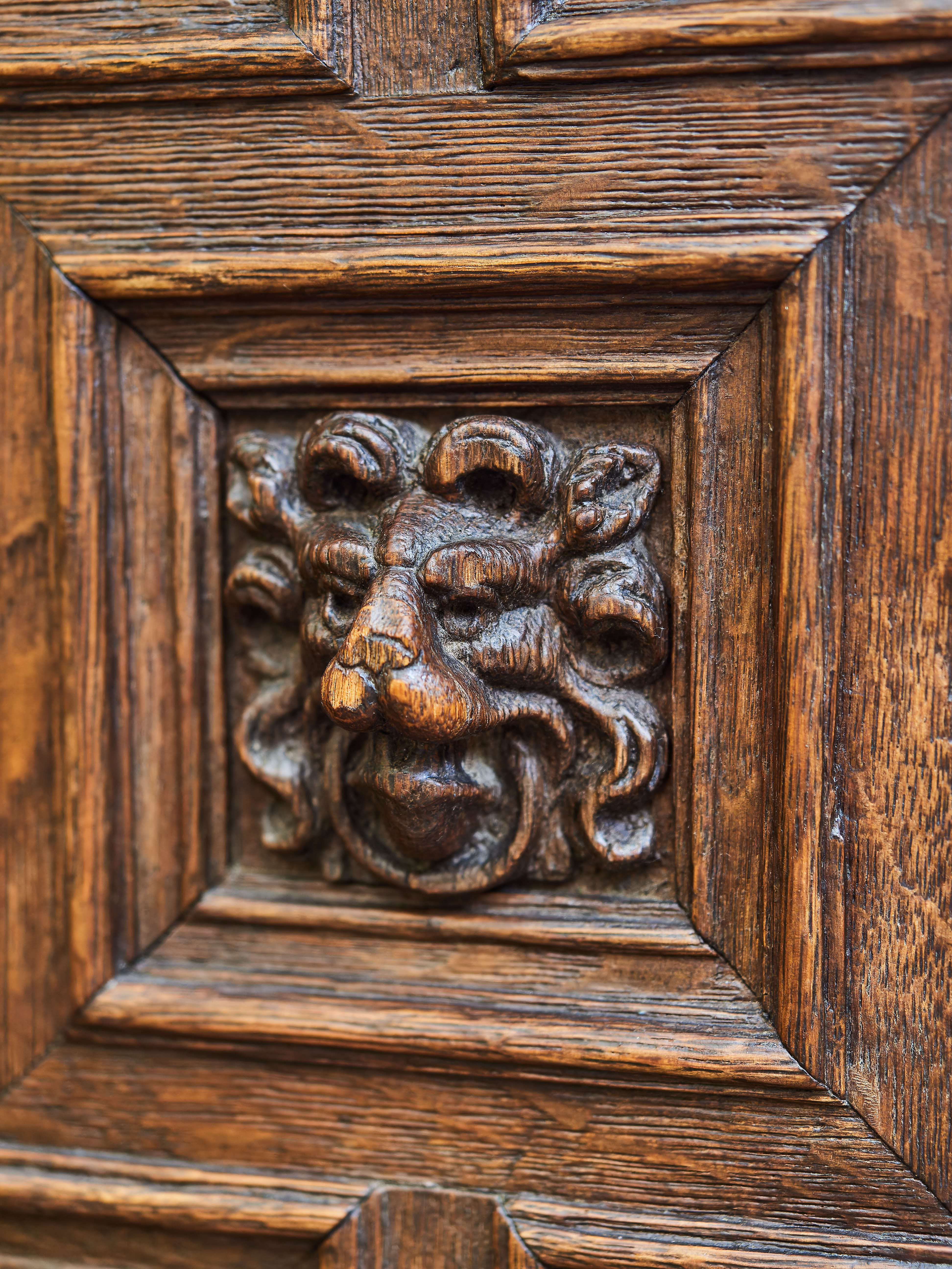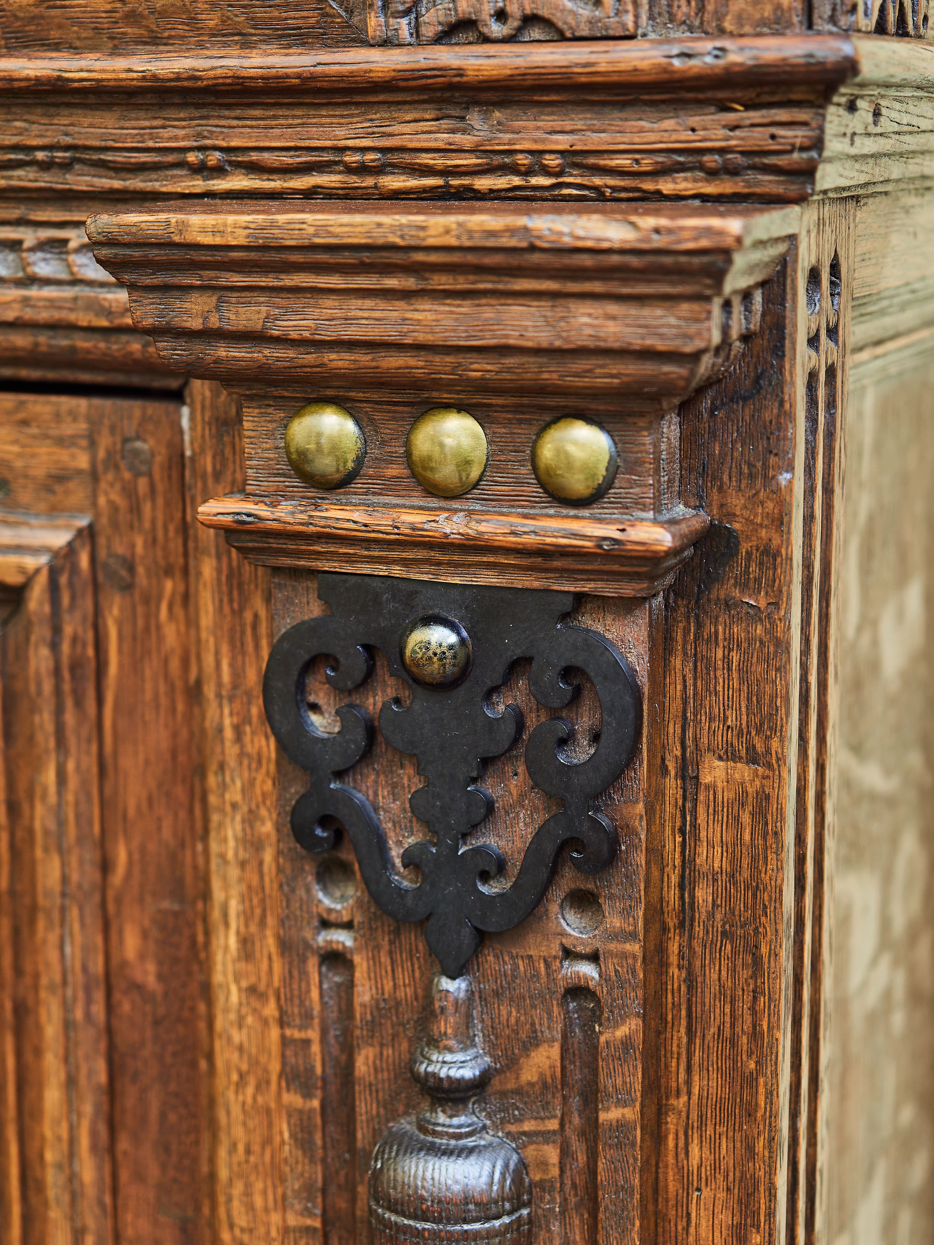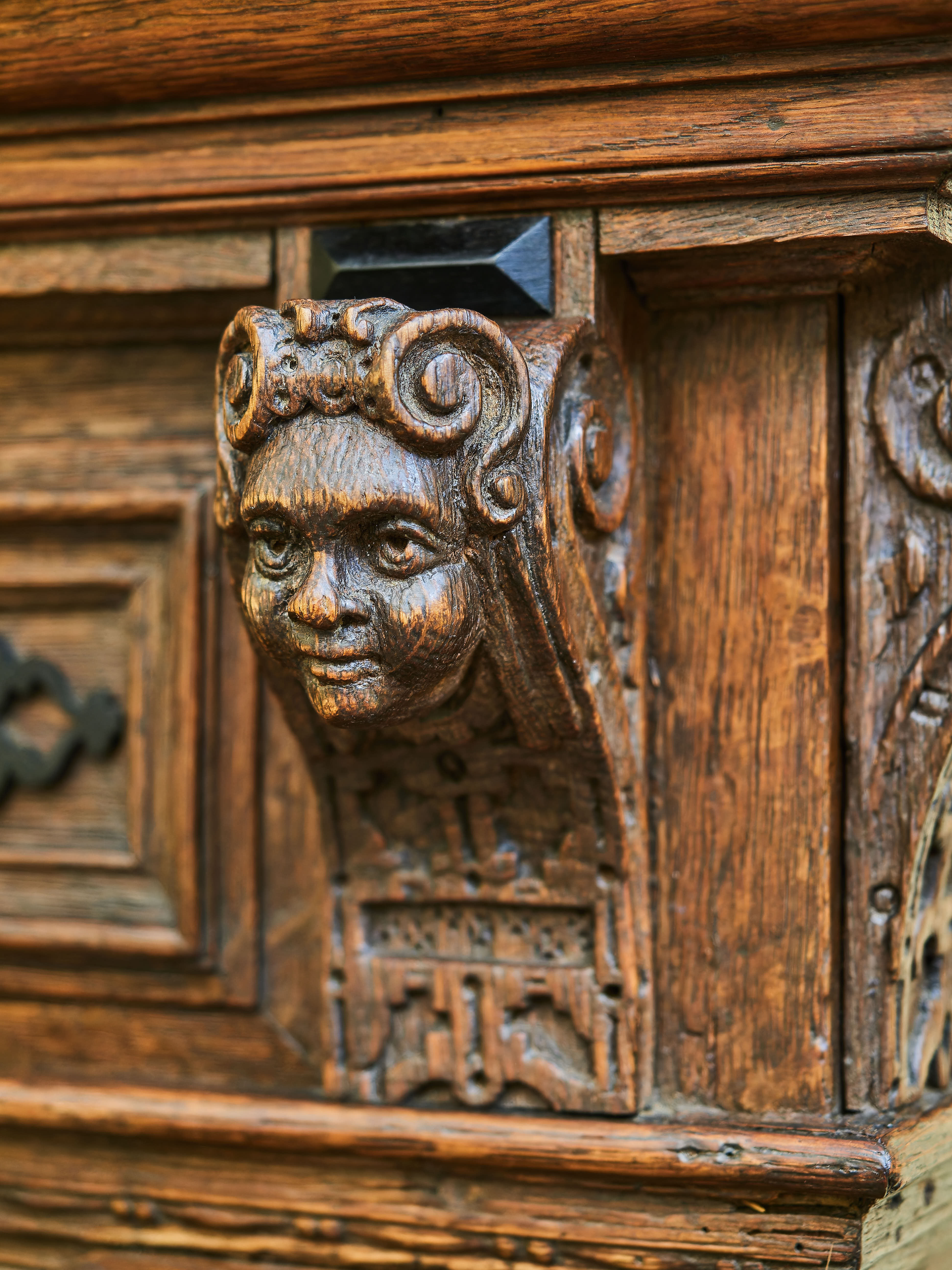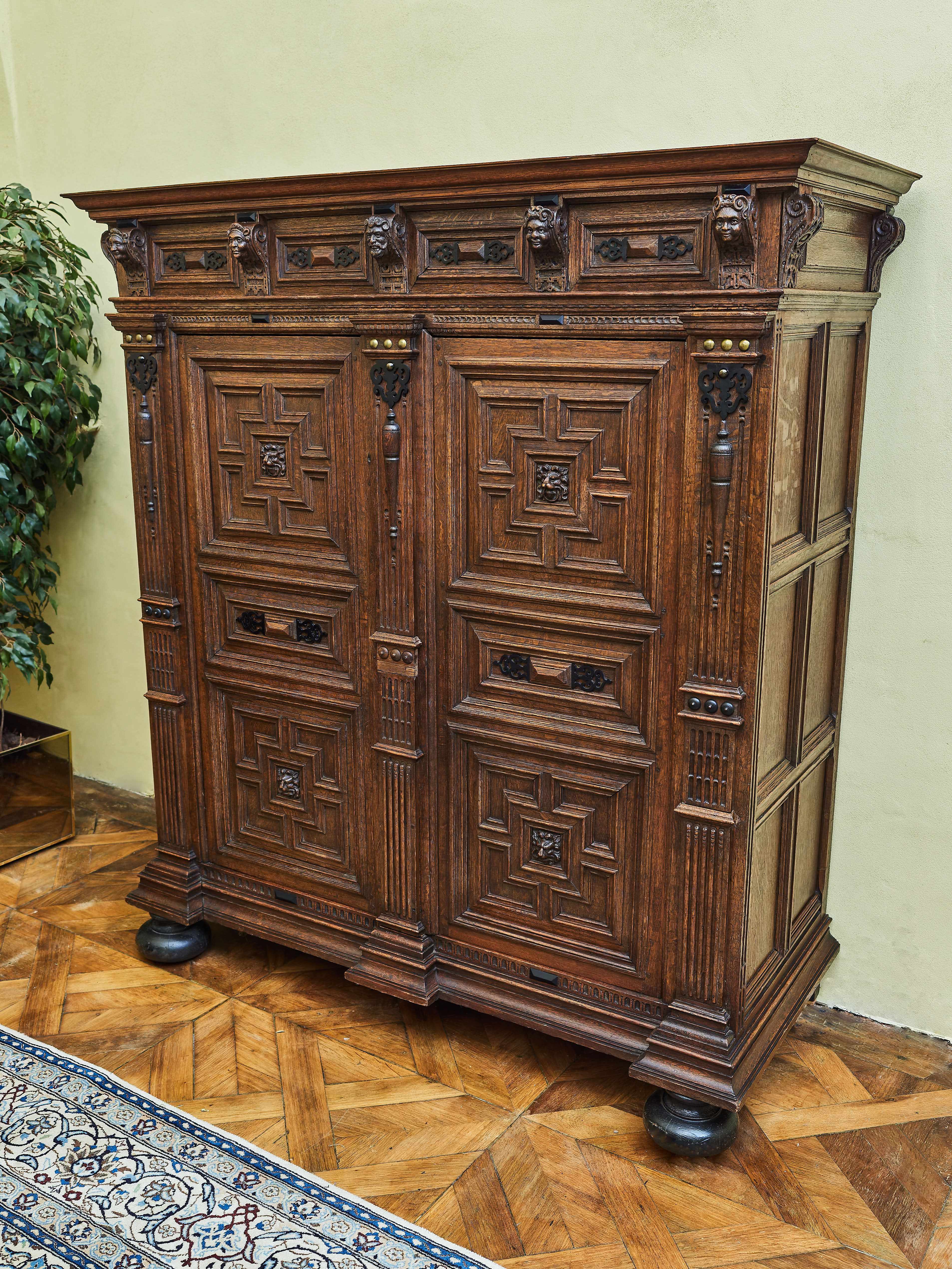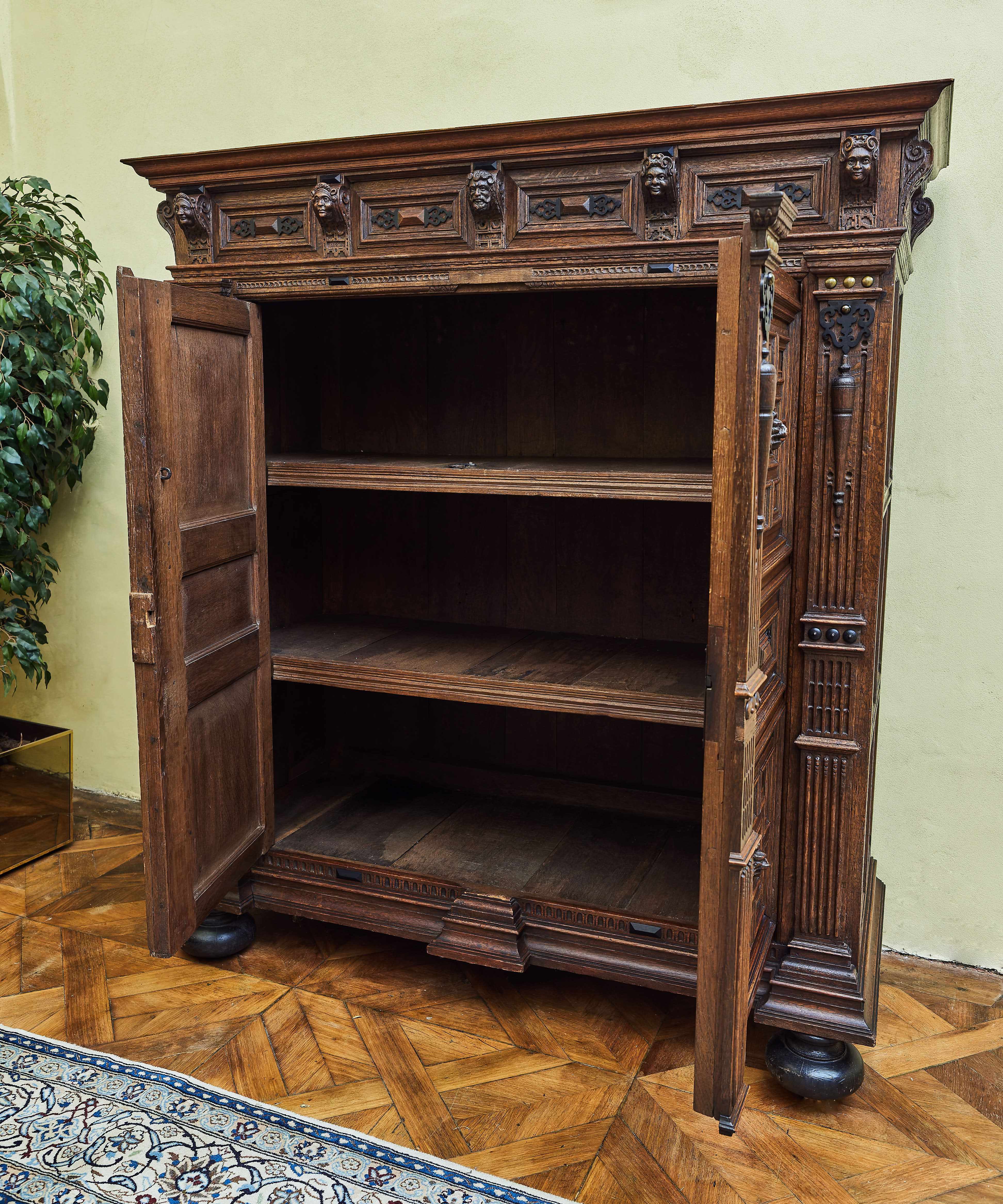 Originální vlámská renesanční skříň vyřezávaná z masivního dubu. Fasáda je zdobená geometrickými kazetami, plastickými reliéfy a dekorativními prvky v podobě lvích a lidských hlav. Typické renesanční prvky doplňují robustní sloupky, kované detaily a původní zámek s klíčem. Skříň stojí na soustružených kulových nohách, které jsou černěné a nabízí dvoukřídlé otevírání s vnitřními policemi. Jedná se o autentický kus vlámského řemesla z období renesance, který představuje jak historickou hodnotu, tak výrazný interiérový prvek.