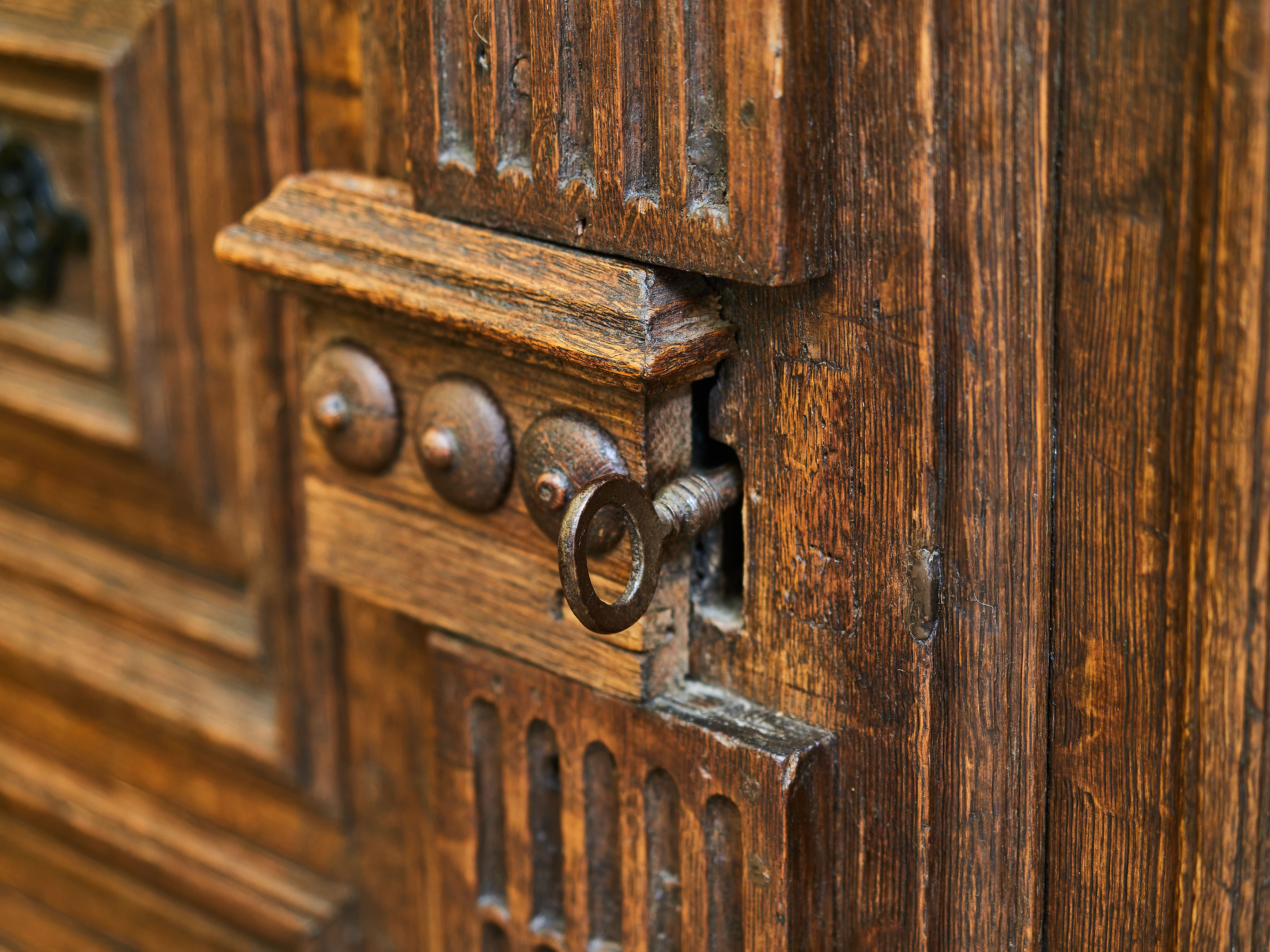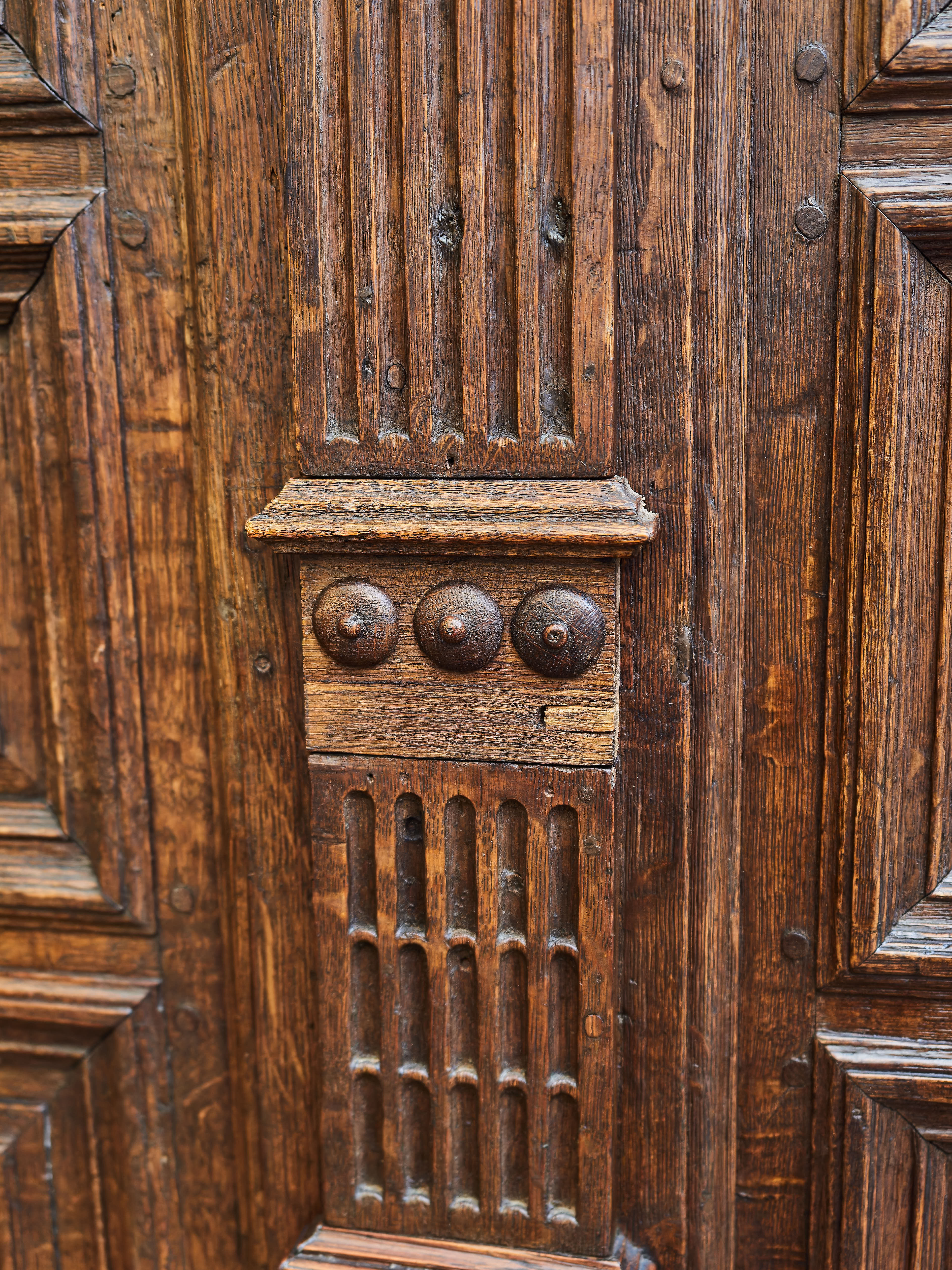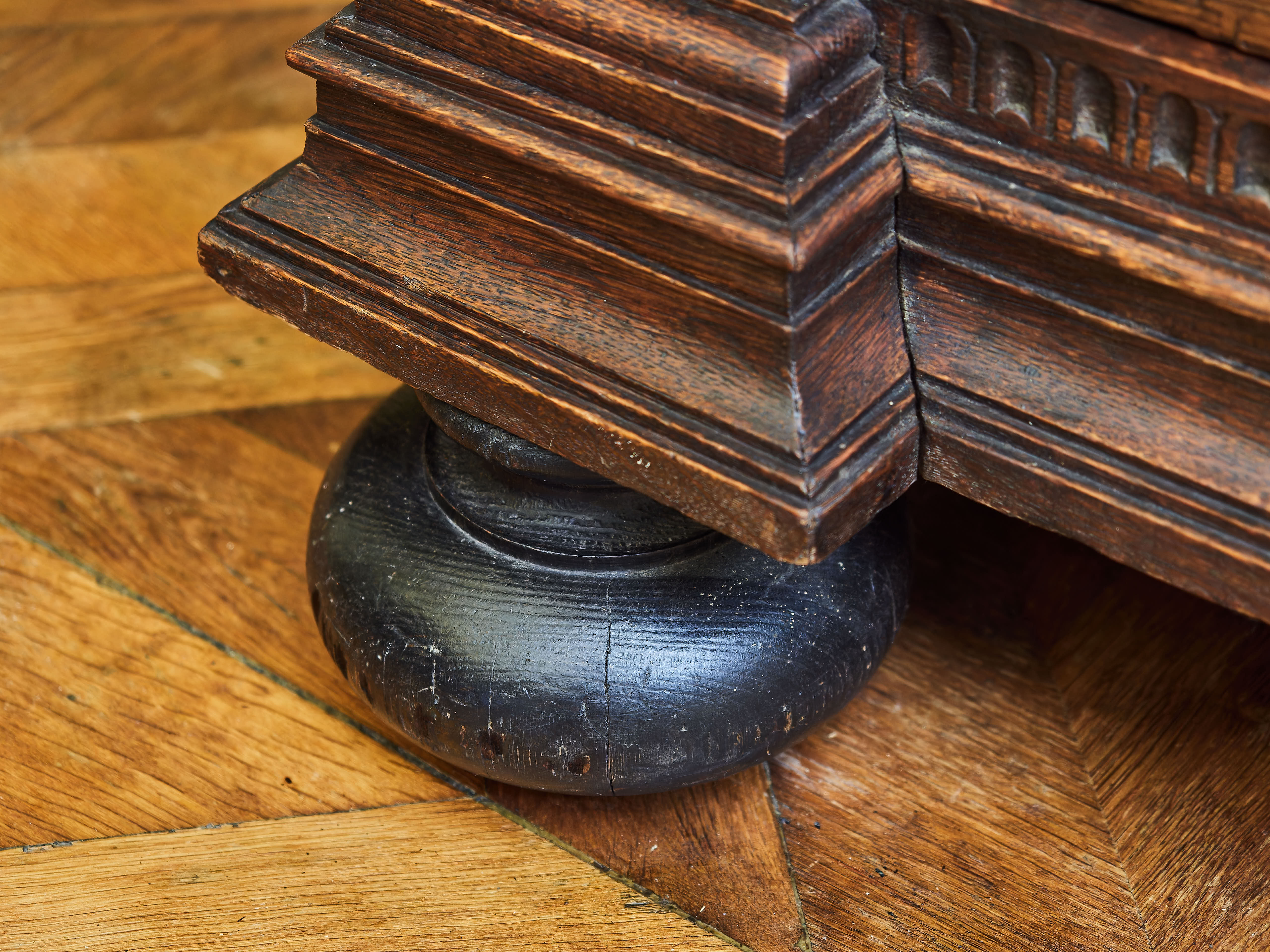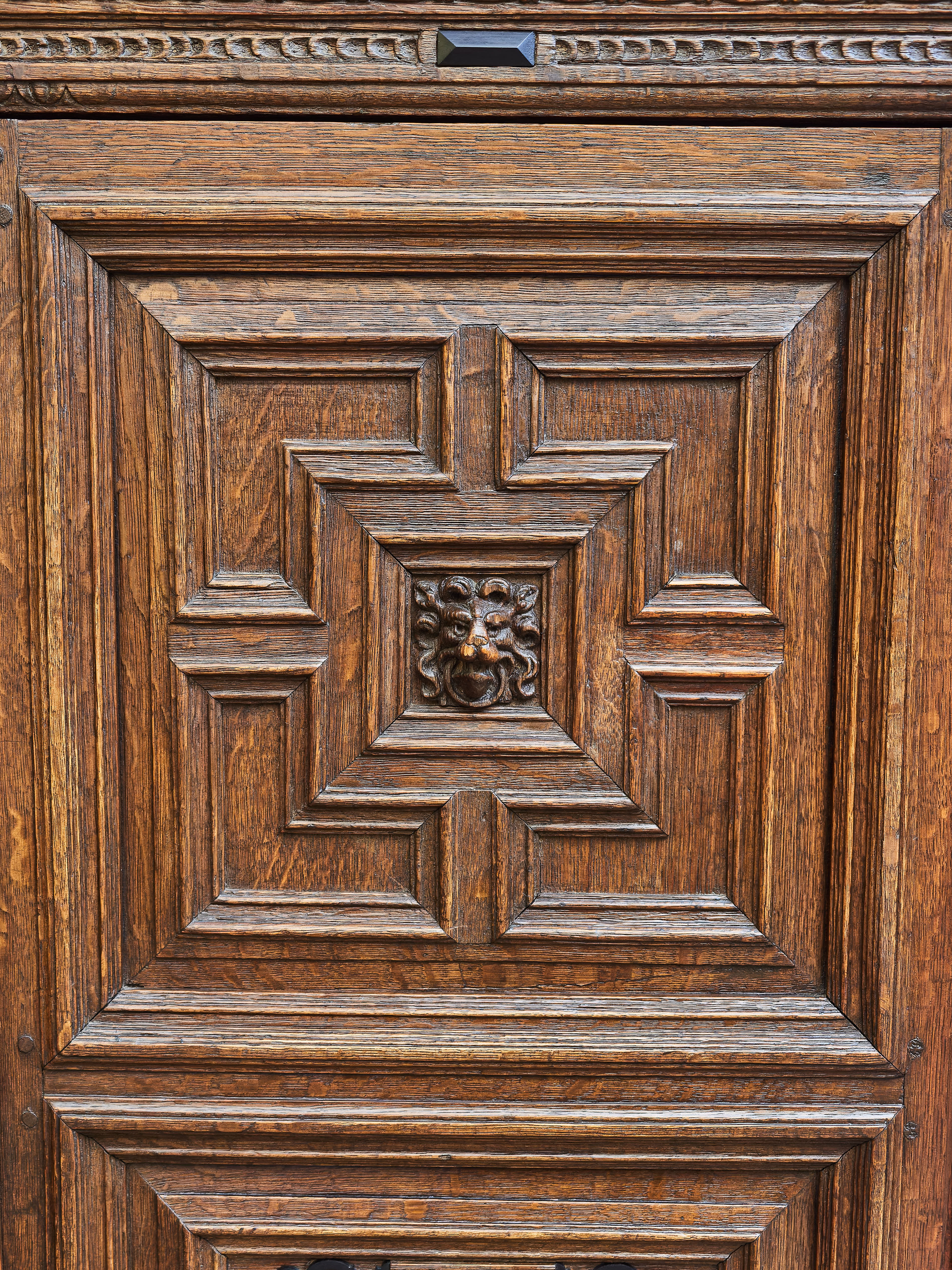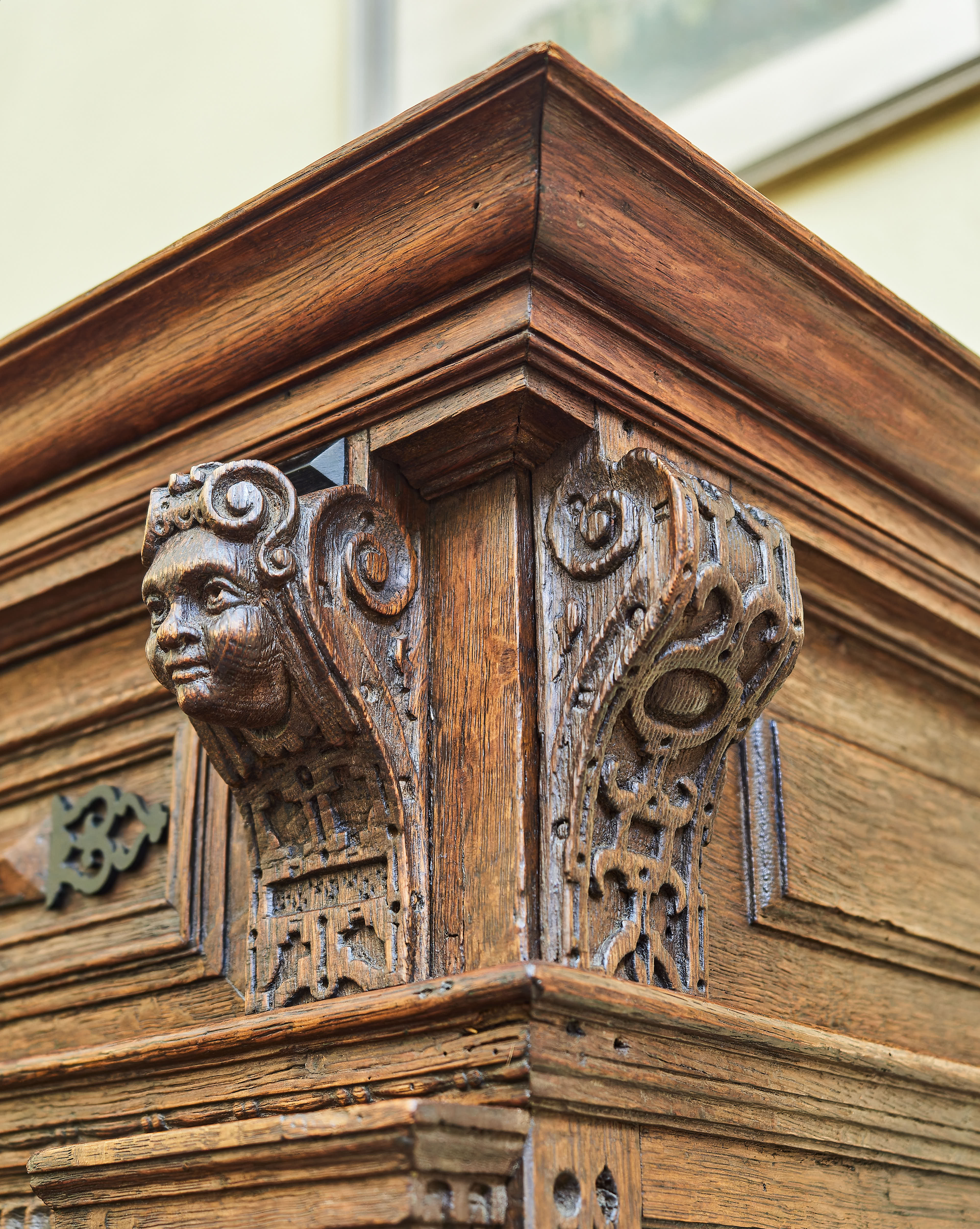 Originální vlámská renesanční skříň vyřezávaná z masivního dubu. Fasáda je zdobená geometrickými kazetami, plastickými reliéfy a dekorativními prvky v podobě lvích a lidských hlav. Typické renesanční prvky doplňují robustní sloupky, kované detaily a původní zámek s klíčem. Skříň stojí na soustružených kulových nohách, které jsou černěné a nabízí dvoukřídlé otevírání s vnitřními policemi. Jedná se o autentický kus vlámského řemesla z období renesance, který představuje jak historickou hodnotu, tak výrazný interiérový prvek.