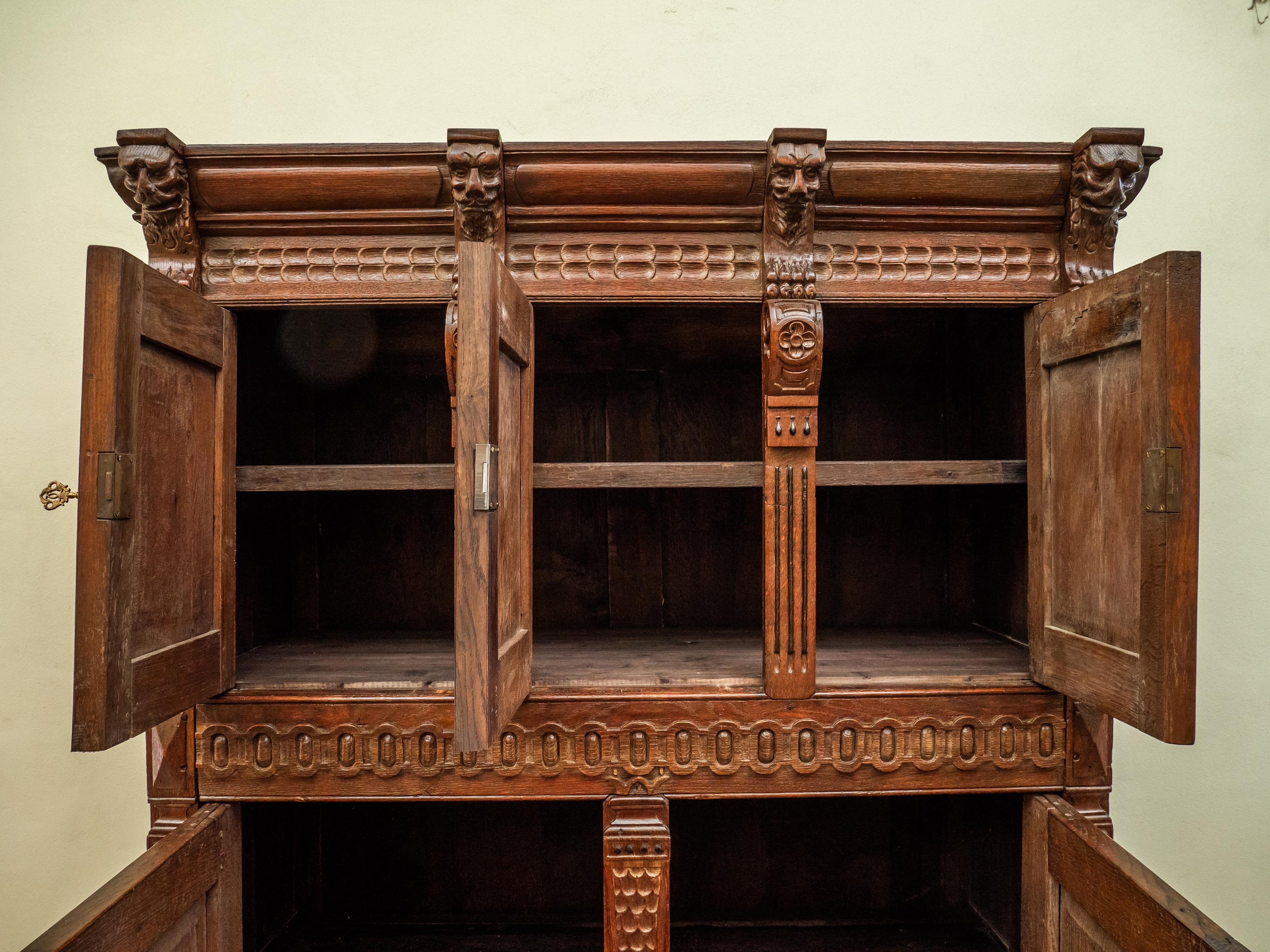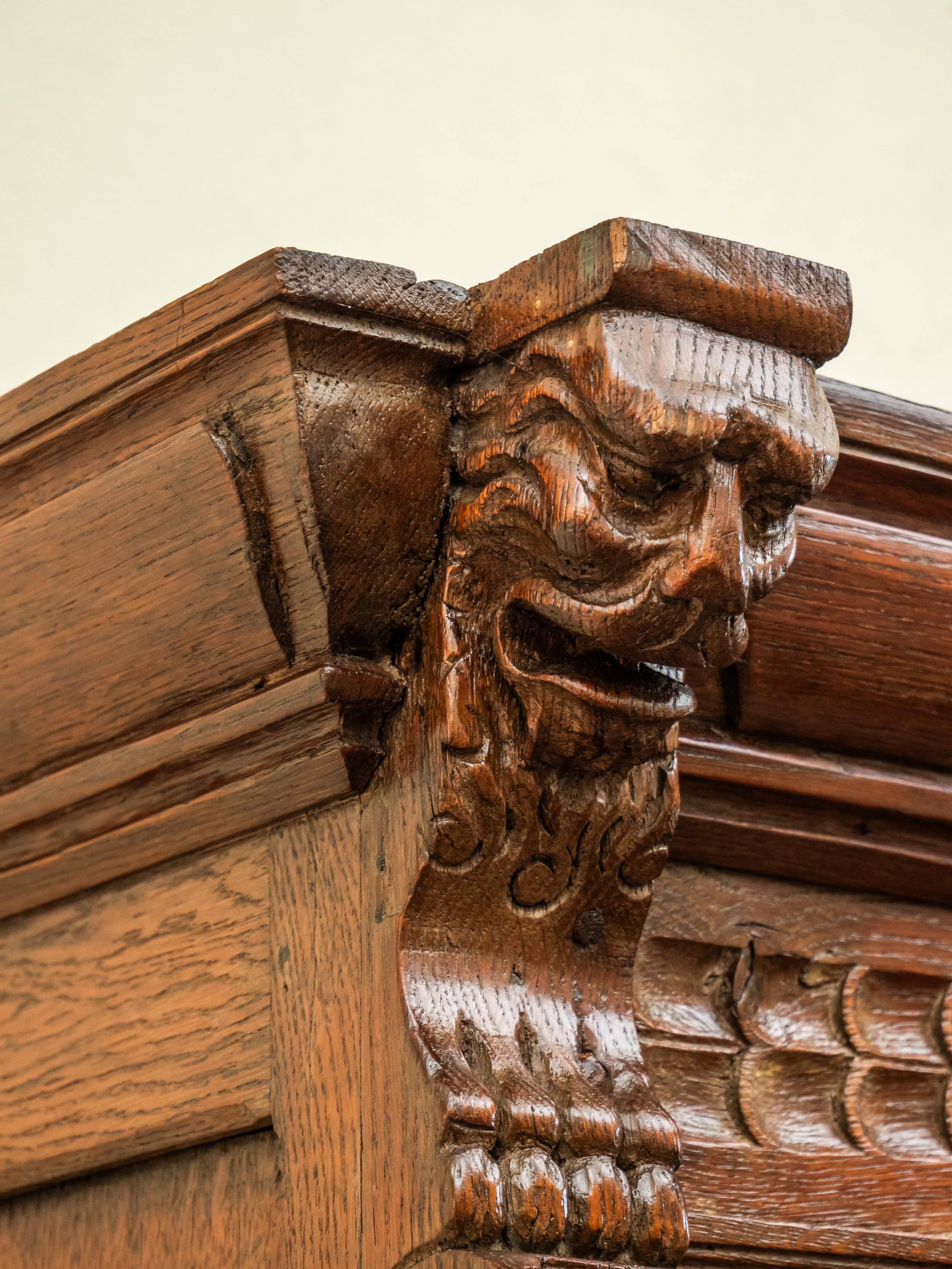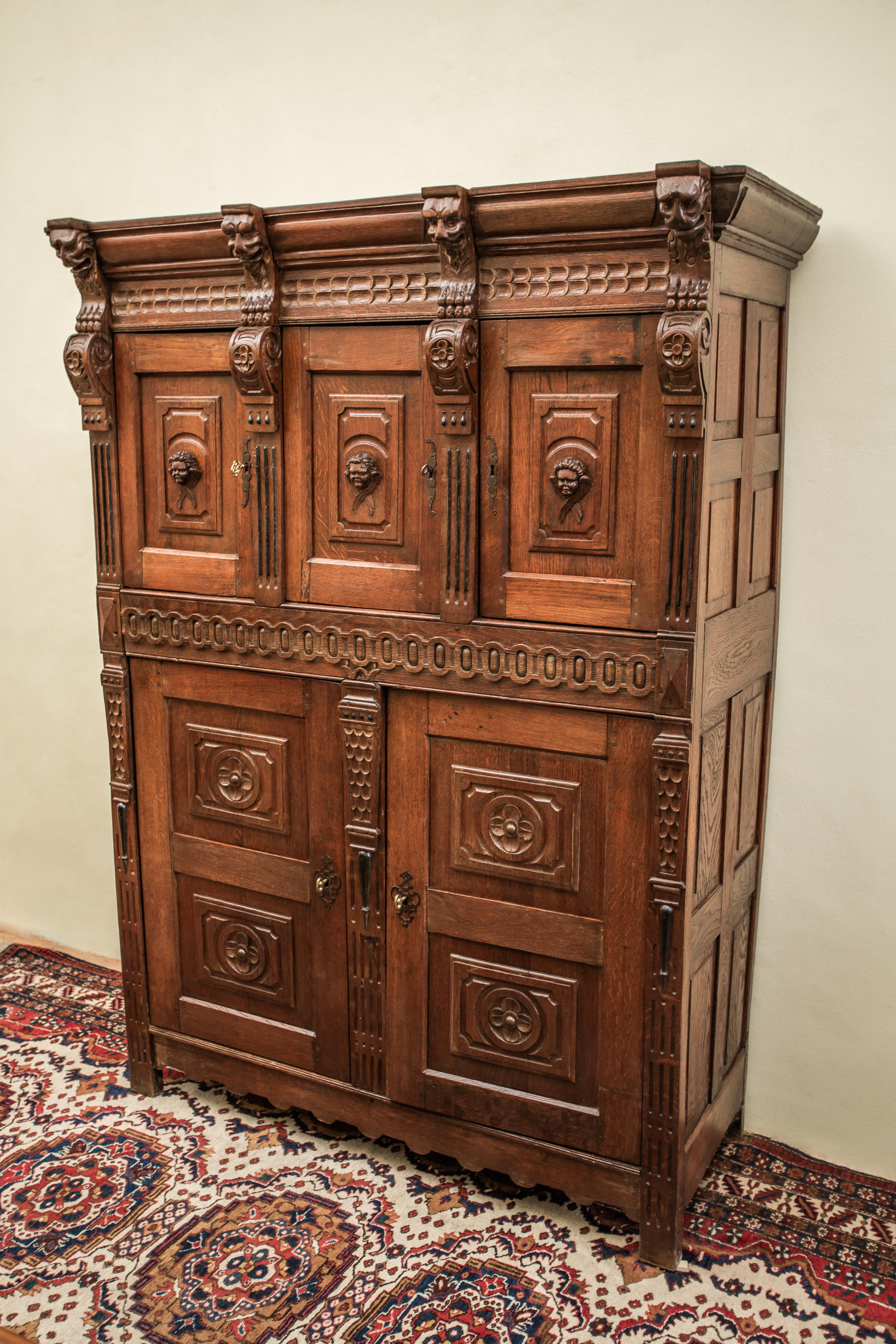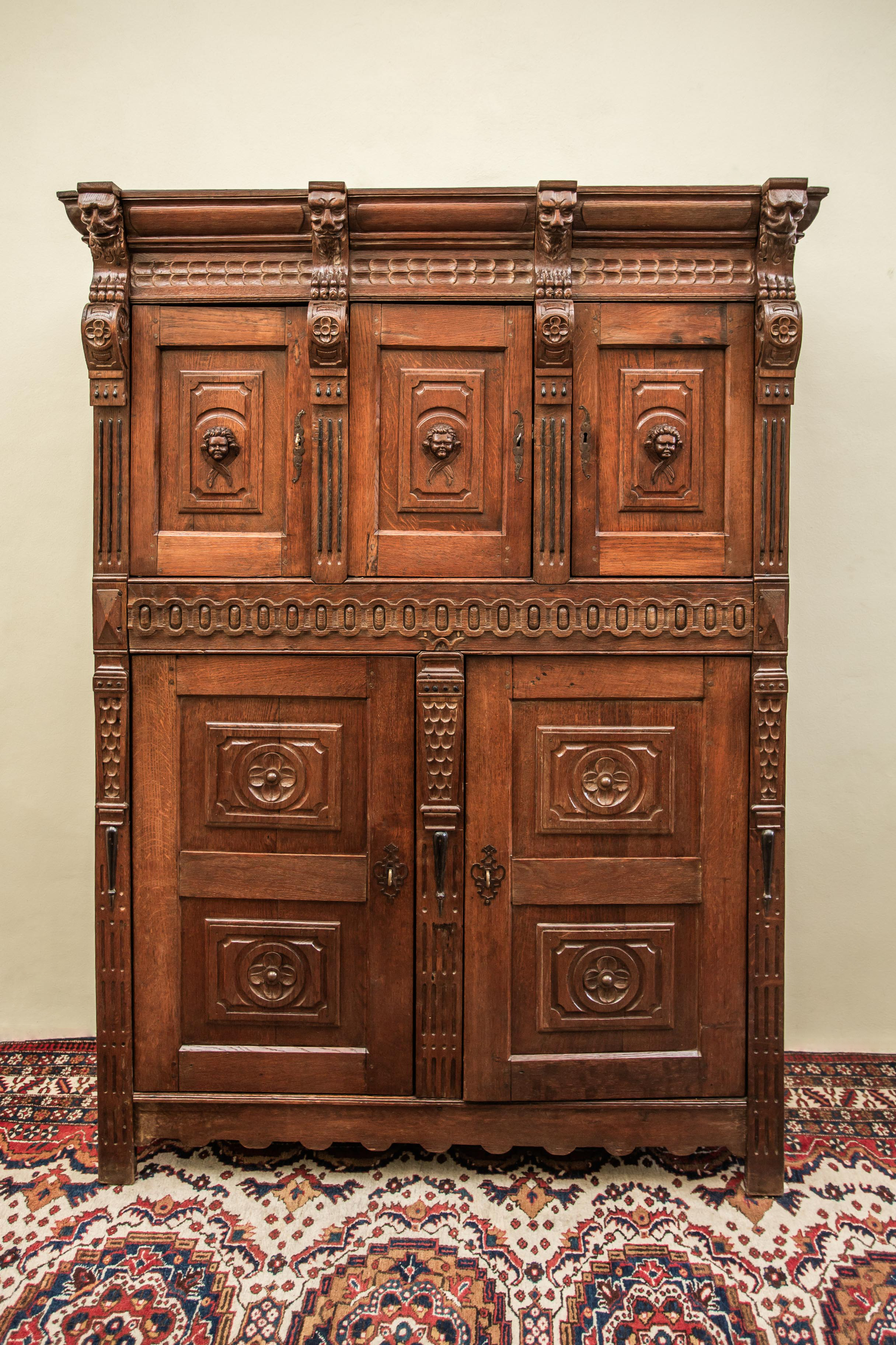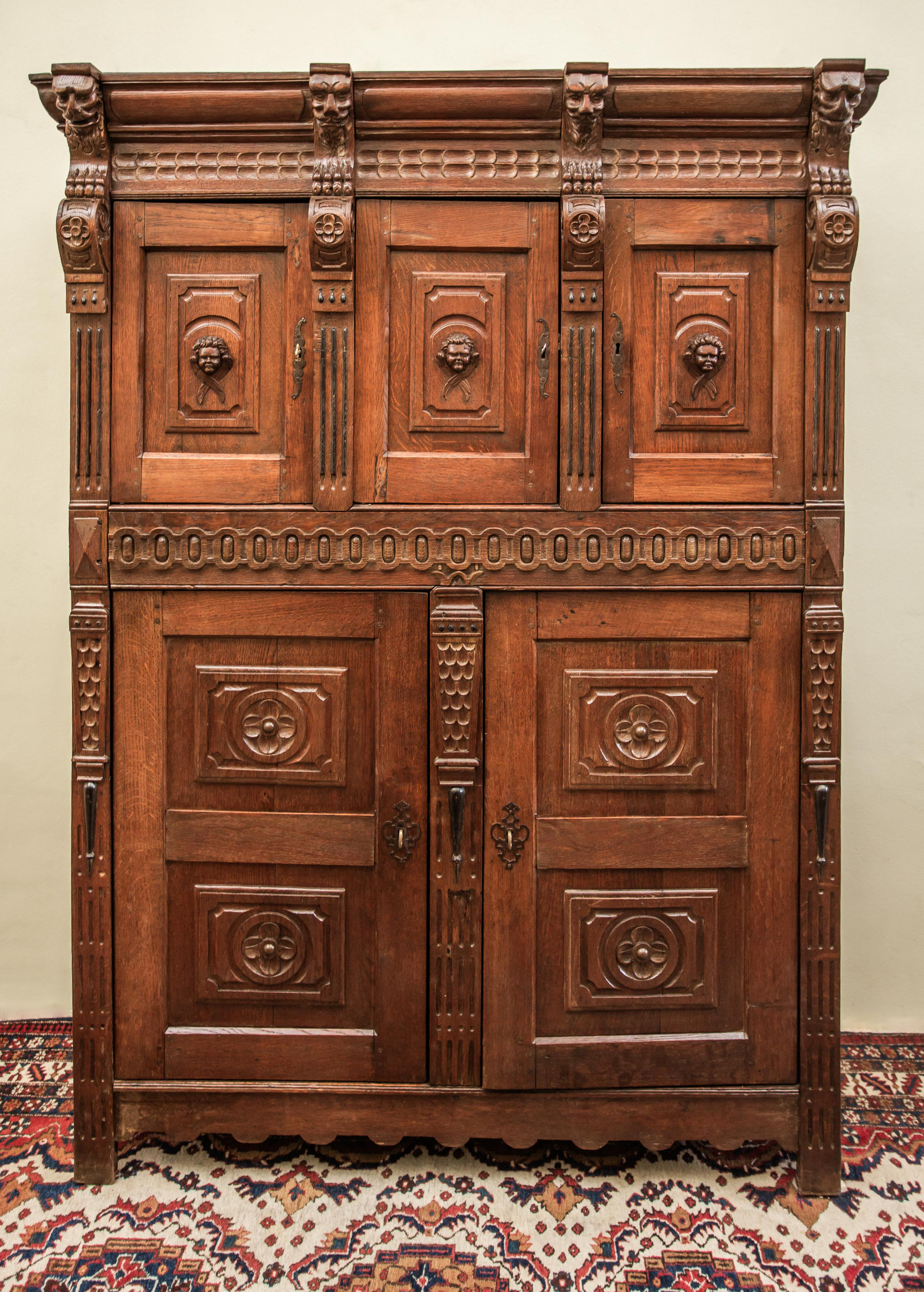 Originál z období vlámské renesance – první polovina 17. století. Skříň je vyrobena z masivního dubu s řezbářskou výzdobou ve vysoké kvalitě. Vše je spojované na drážku + čep + kolíčky. Tato skříň byla ozdobou panského domu v kuchyni. Stav: velmi dobrý, bez červotoče. Zámky jsou funkční – nejsou původní, klíče jsou nově dodělané. Provenience: Vlámsko – Antverpy.