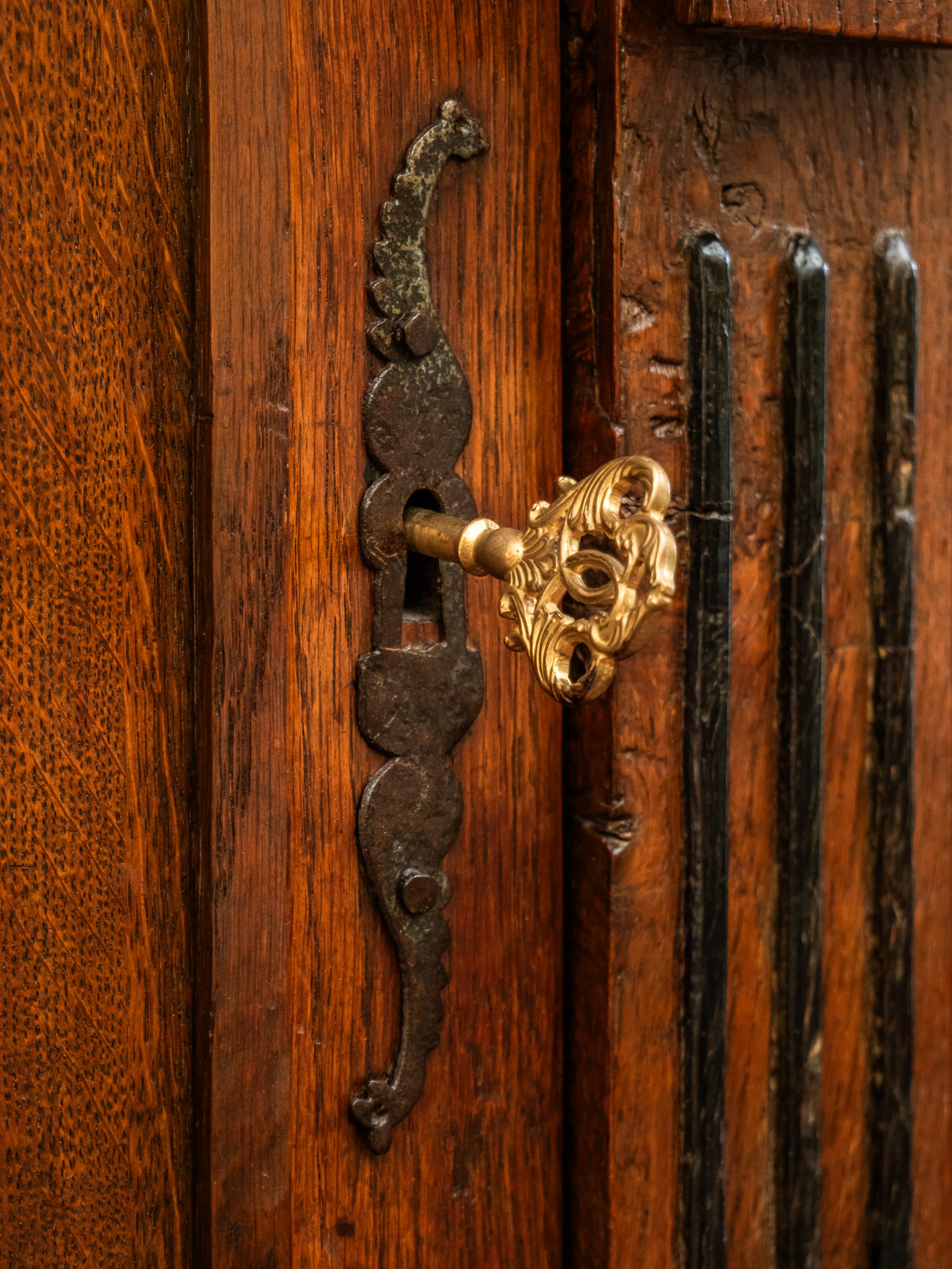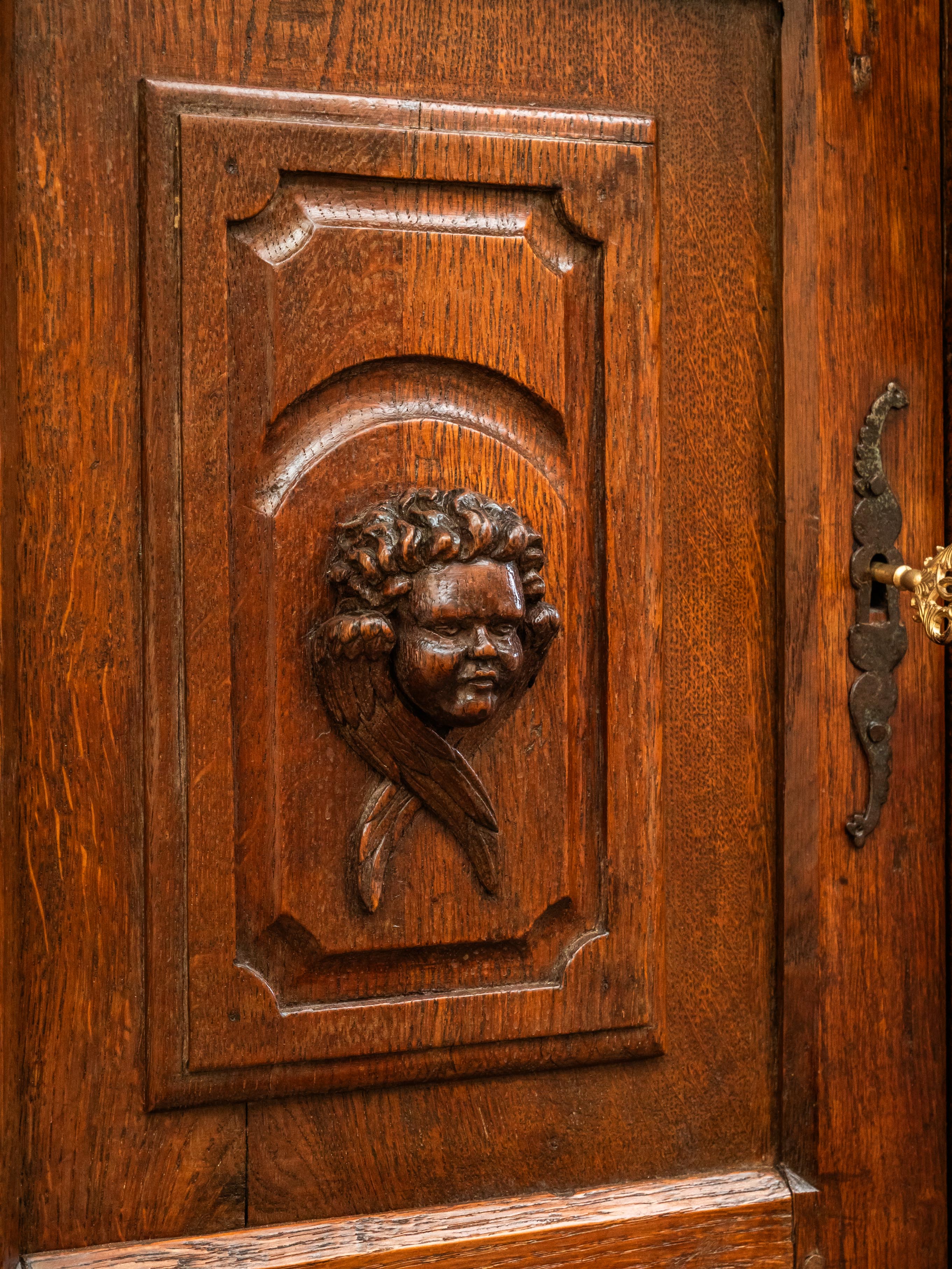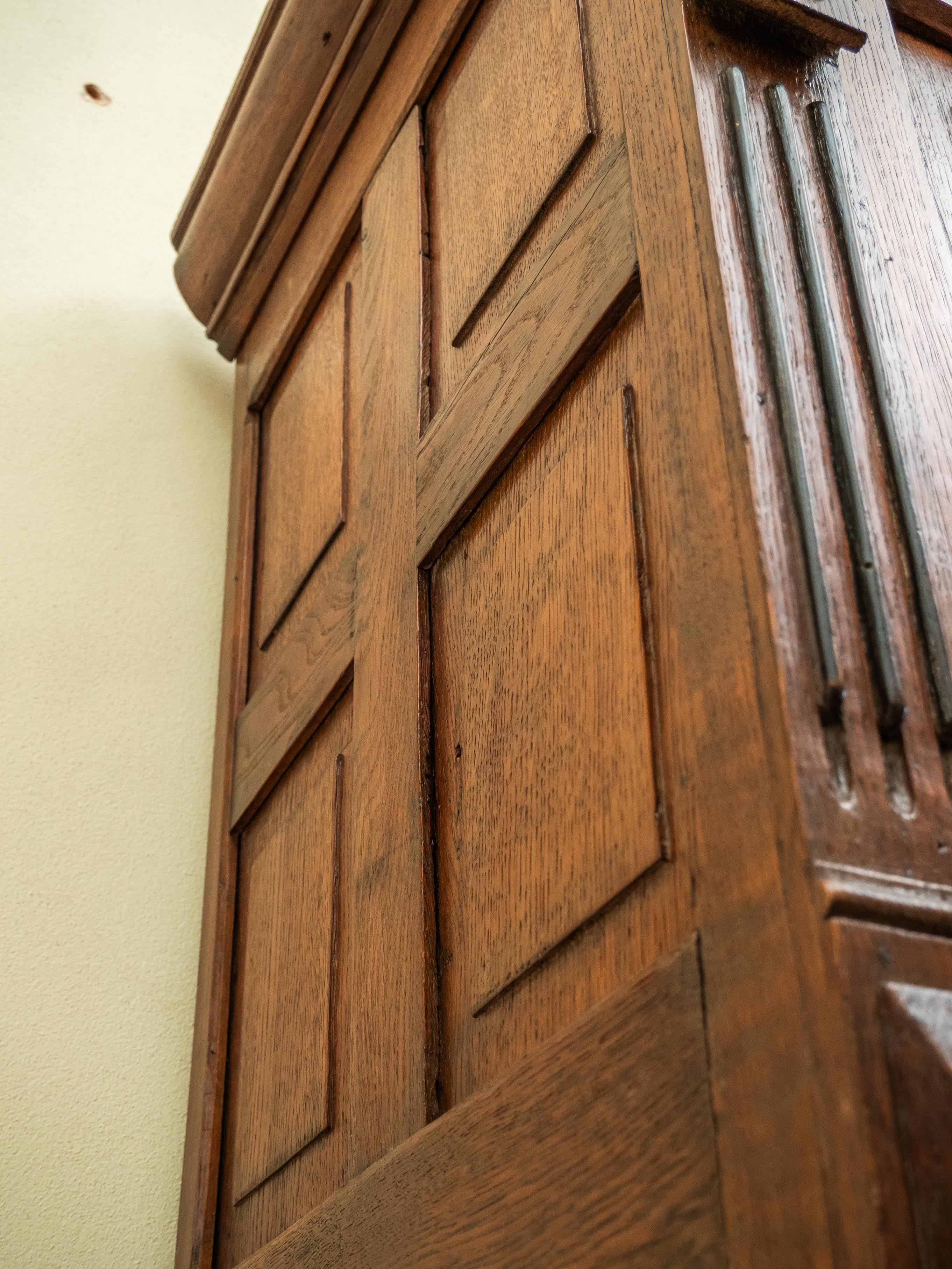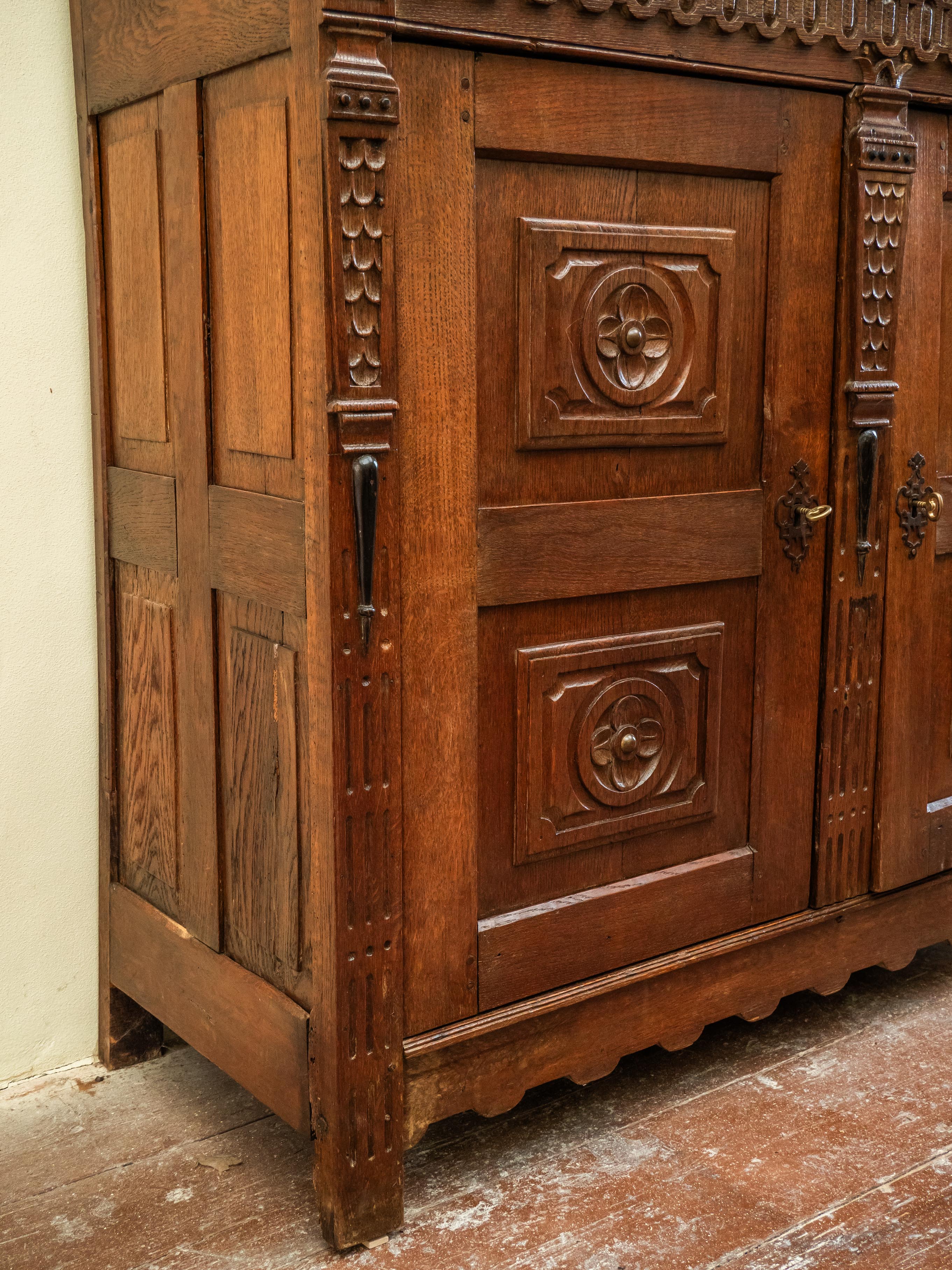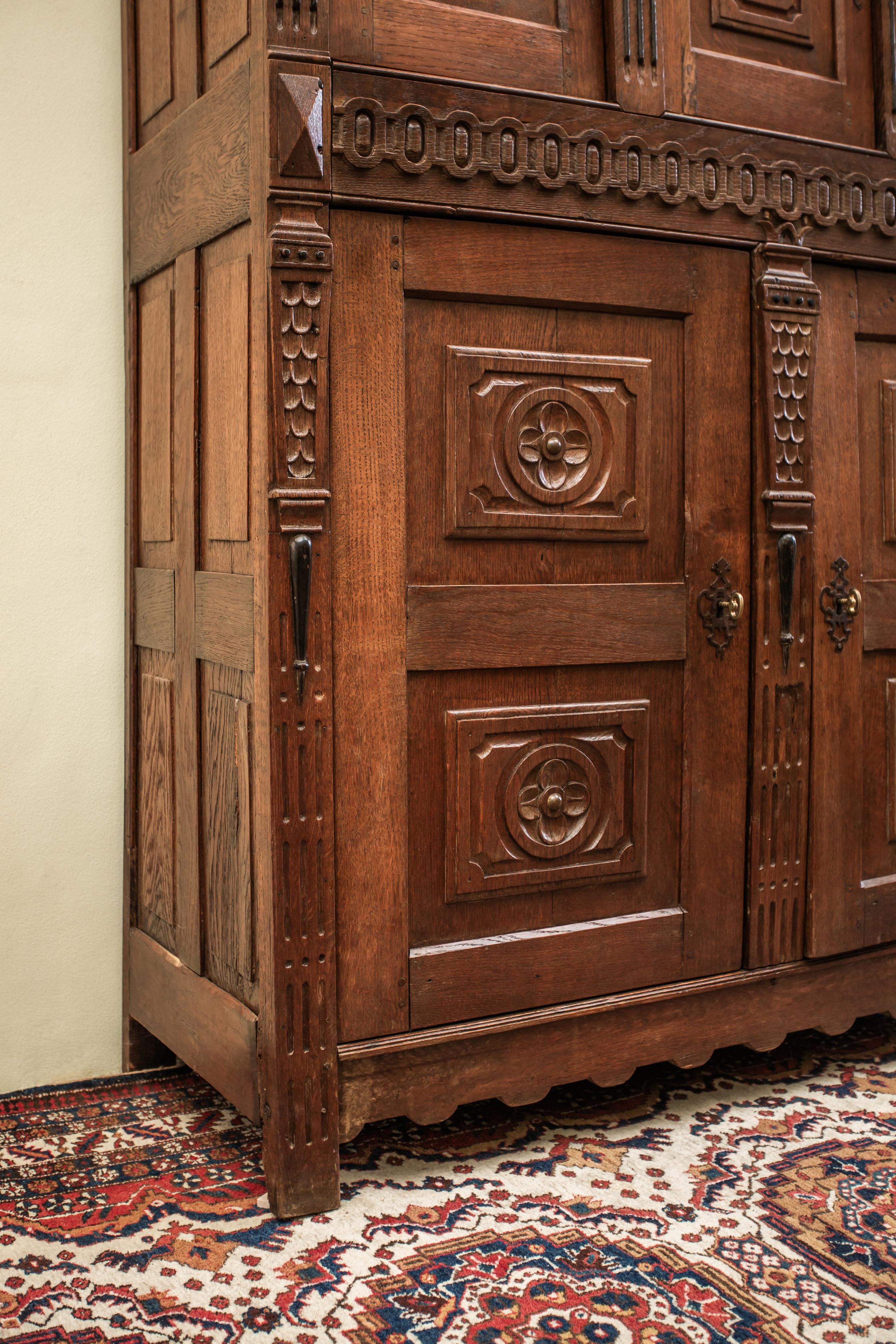 Originál z období vlámské renesance – první polovina 17. století. Skříň je vyrobena z masivního dubu s řezbářskou výzdobou ve vysoké kvalitě. Vše je spojované na drážku + čep + kolíčky. Tato skříň byla ozdobou panského domu v kuchyni. Stav: velmi dobrý, bez červotoče. Zámky jsou funkční – nejsou původní, klíče jsou nově dodělané. Provenience: Vlámsko – Antverpy.