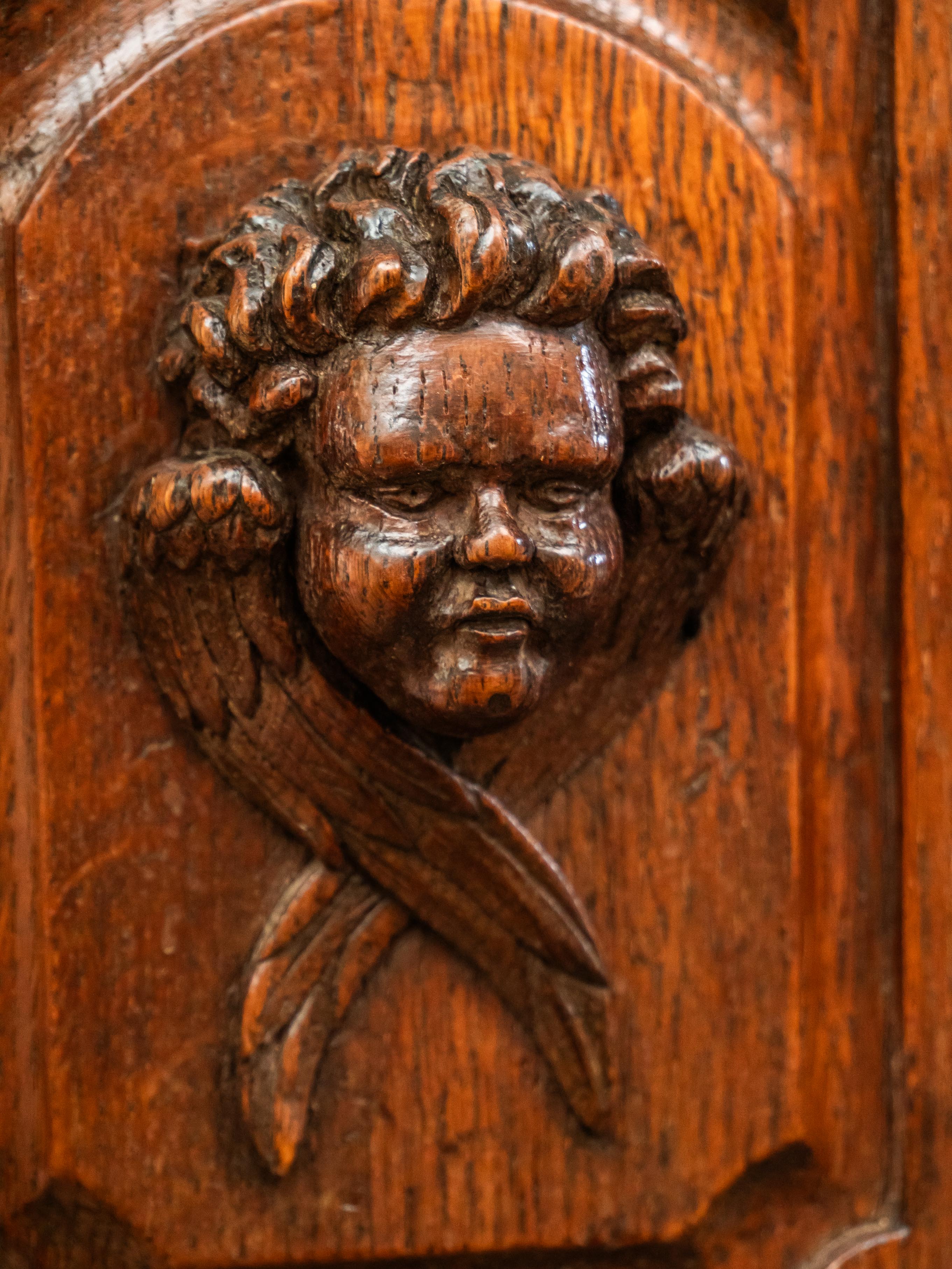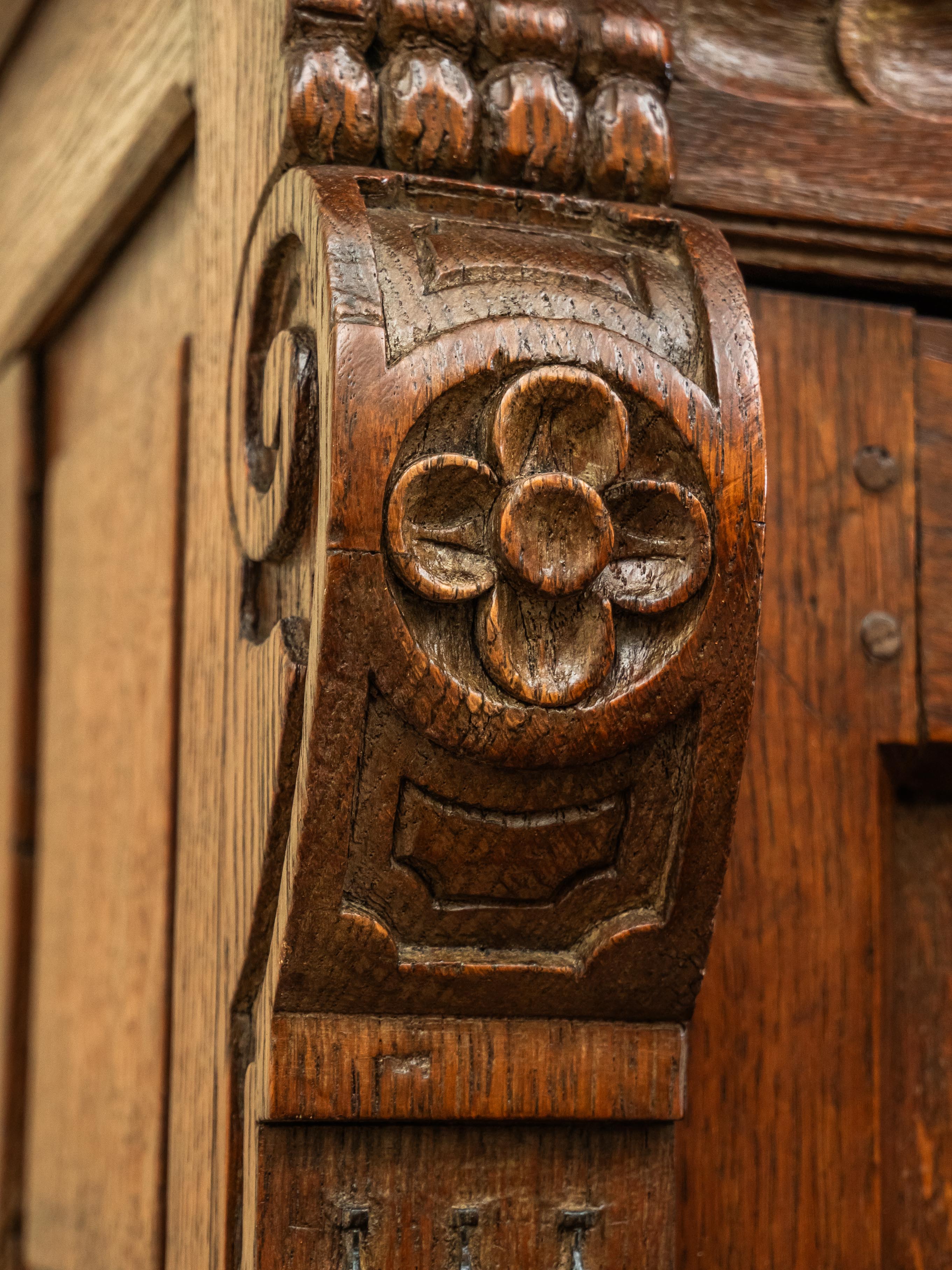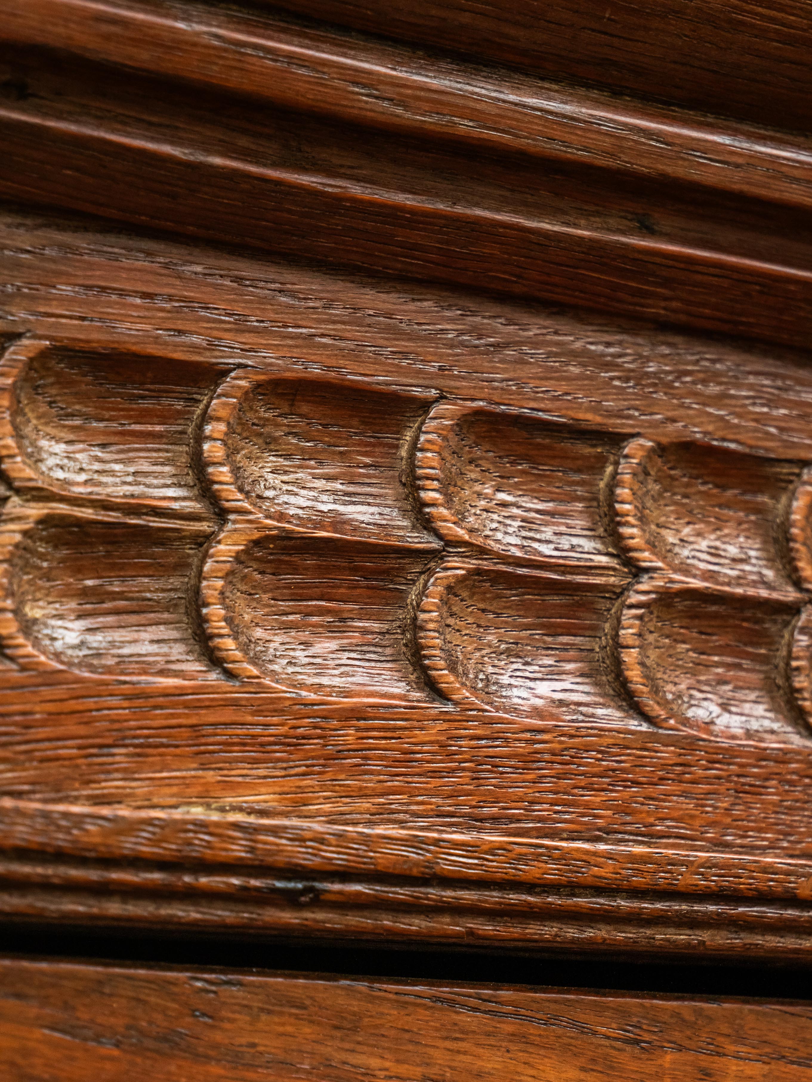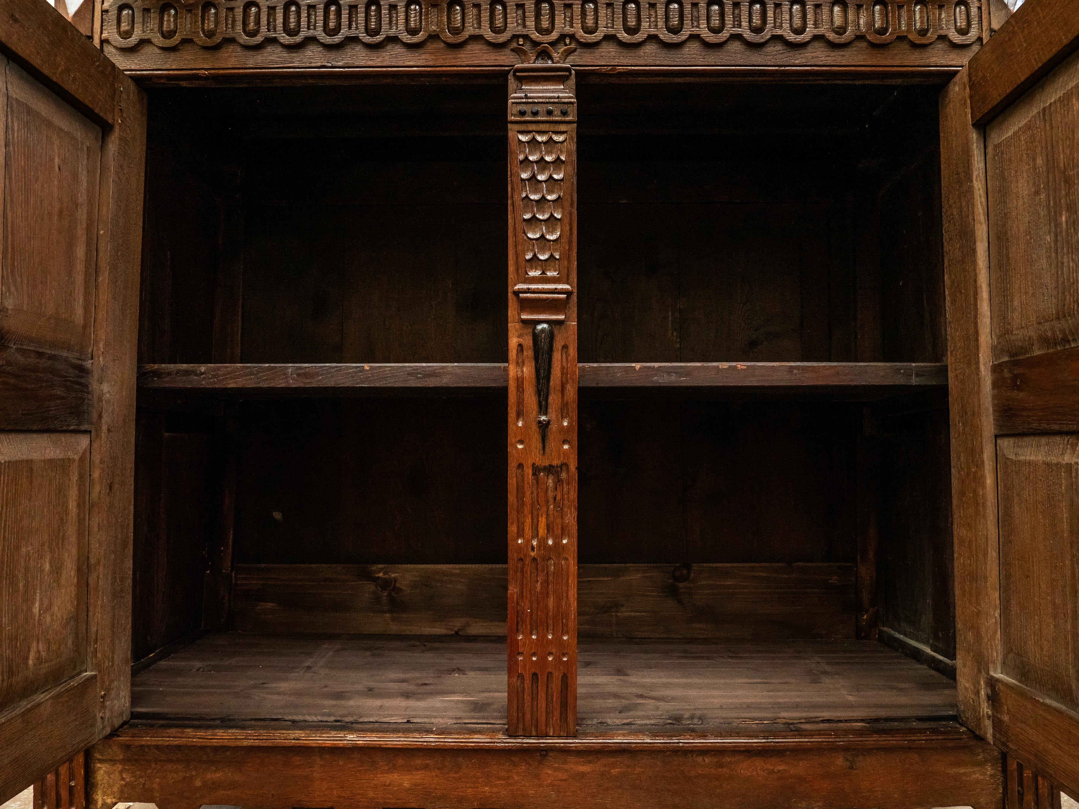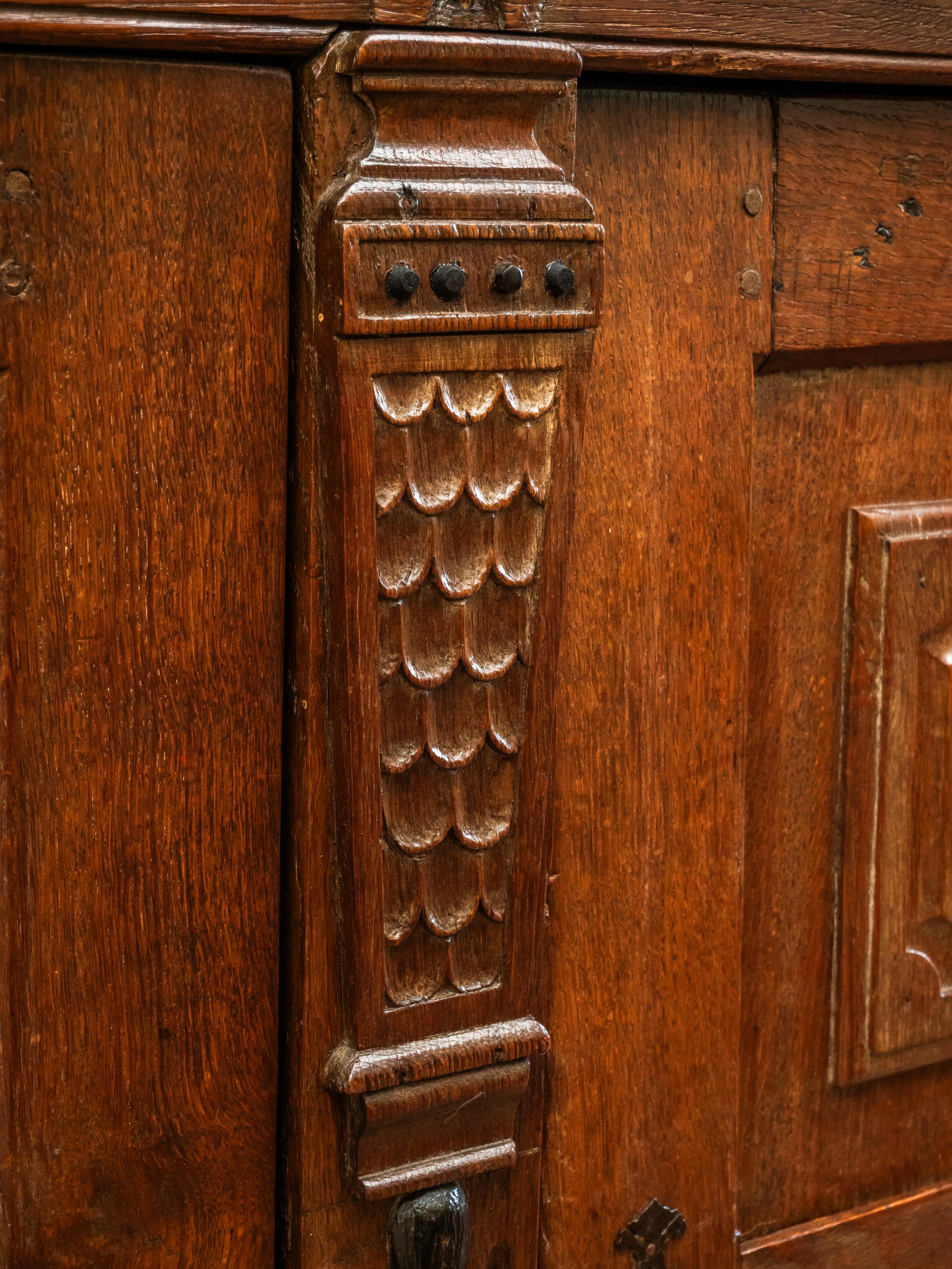 Originál z období vlámské renesance – první polovina 17. století. Skříň je vyrobena z masivního dubu s řezbářskou výzdobou ve vysoké kvalitě. Vše je spojované na drážku + čep + kolíčky. Tato skříň byla ozdobou panského domu v kuchyni. Stav: velmi dobrý, bez červotoče. Zámky jsou funkční – nejsou původní, klíče jsou nově dodělané. Provenience: Vlámsko – Antverpy.