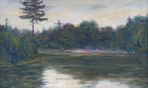 Olej na kartonu 27 cm x 43 cm. Signováno vpravo dole. Autor: Vlastimil Kačírek (1895-1970). Pohled za rozbřesku na zákoutí vodní plochy se zalesněnými břehy jimž korunuje ztepilá borovice. První sluneční paprsky prosvětlují hladinu. Stříbrný patinovaný rám. Československo 1920 – 1935. Celkový rozměr s rámem 35,5 cm x 51,5 cm.