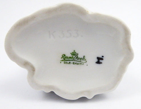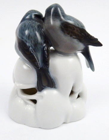 Bílý a ručně barevně malovaný porcelán. Autor návrhu modelu: Wunderlich. Název modelu: Spatzenpaar. Design modelu: rok 1914. Dvojice společně si cvrlikajících vrabčáků sedících na kupolovitém podstavci stylizovaném do podoby hnízda. Značeno zespodu: značka Rosenthal platná pro dané období, vtlačená čísla a značka malíře. Německo, Rosenthal, kolem roku 1923. Výška 7,5 cm, rozměr podstavce 5,5 cm x 4 cm.