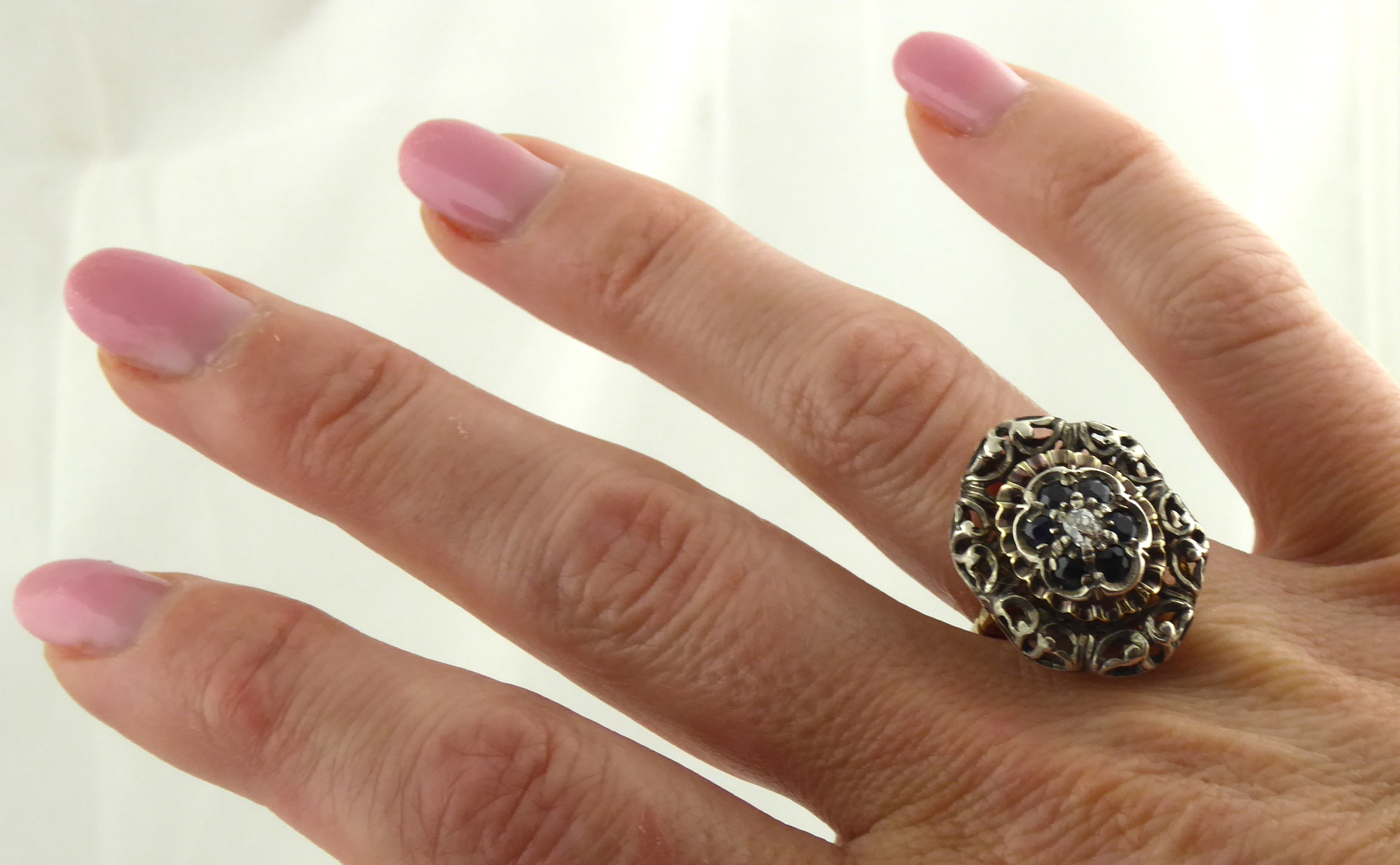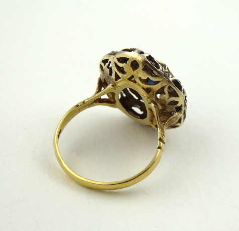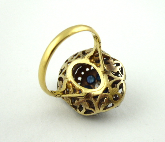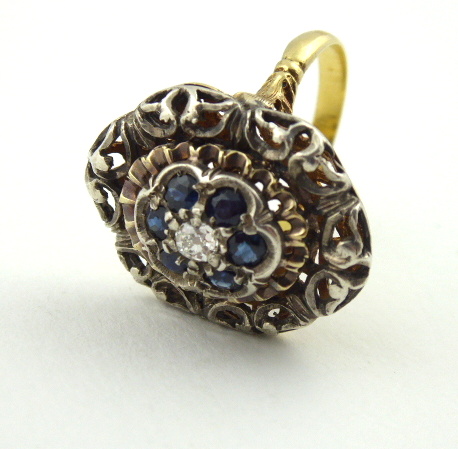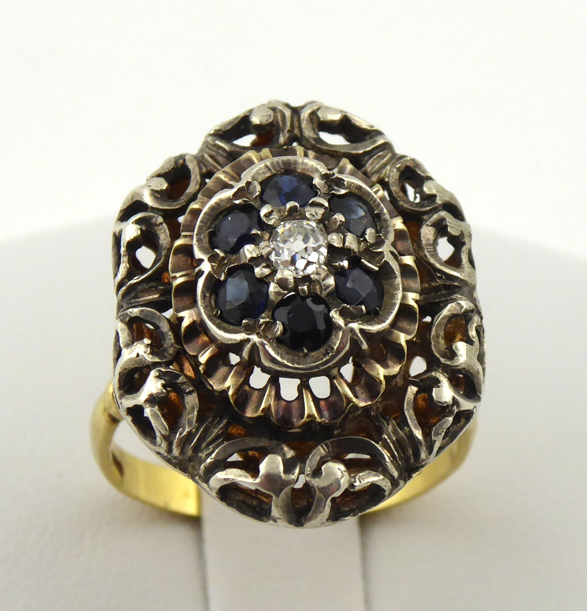Osmnáctikarátové žluté zlato, stříbro, přírodní diamant o váze 0,15 ct, šest přírodních safírů. Období a styl: historismus. Ryzost Au 750/1000, celková hmotnost 7,0 g. Krásný zlatý prsten z období historismu s výraznou hlavou ze stříbra s prořezávaným ornamentem. Ve florálním lůžku hlavy prstenu je centrálně zasazen větší přírodní diamant starého briliantového brusu o váze 0,15 ct, barva G, čistota SI, jehož doplňuje ve formě květu šest přírodních ručně broušených modrých safírů. Originální luxusní ozdoba ruky. Značeno: československý punc kohout a zajíc, mistrovská značka. Evropa 1880 – 1910. Velikost prstenu 55-56, rozměr hlavy prstenu 25 mm x 20 mm.
