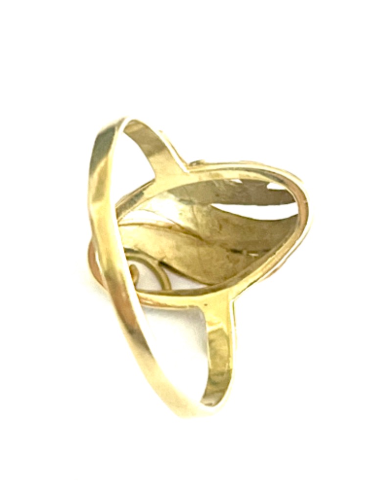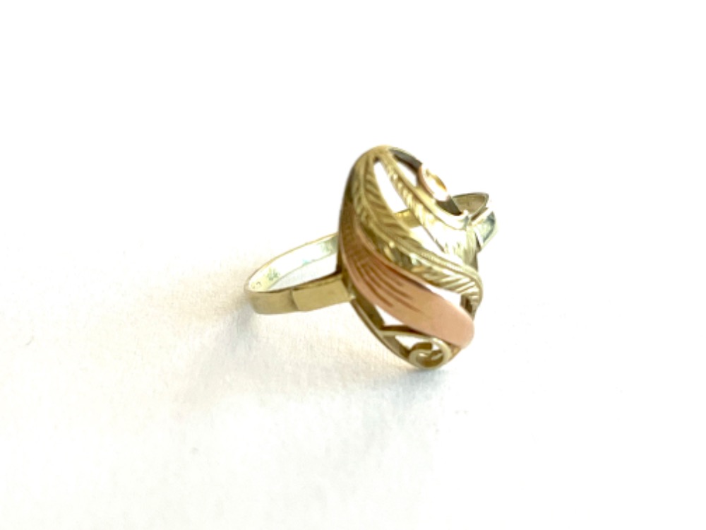 Zlatý prsten ze 14 karátového zlata v odstínu žlutého a růžového zlata v ryzosti AU585/1000. Prsten ručně zdobený gravírováním. Velikost prstýnku 61. Váha prstenu 2,74 gramů