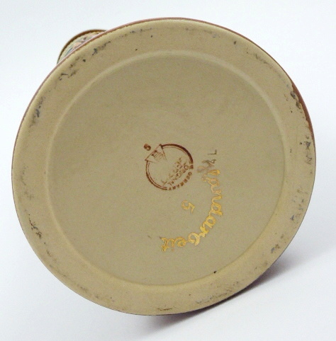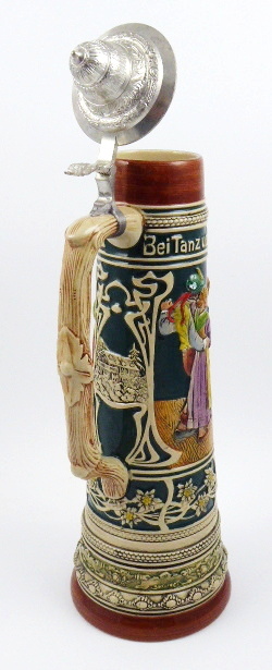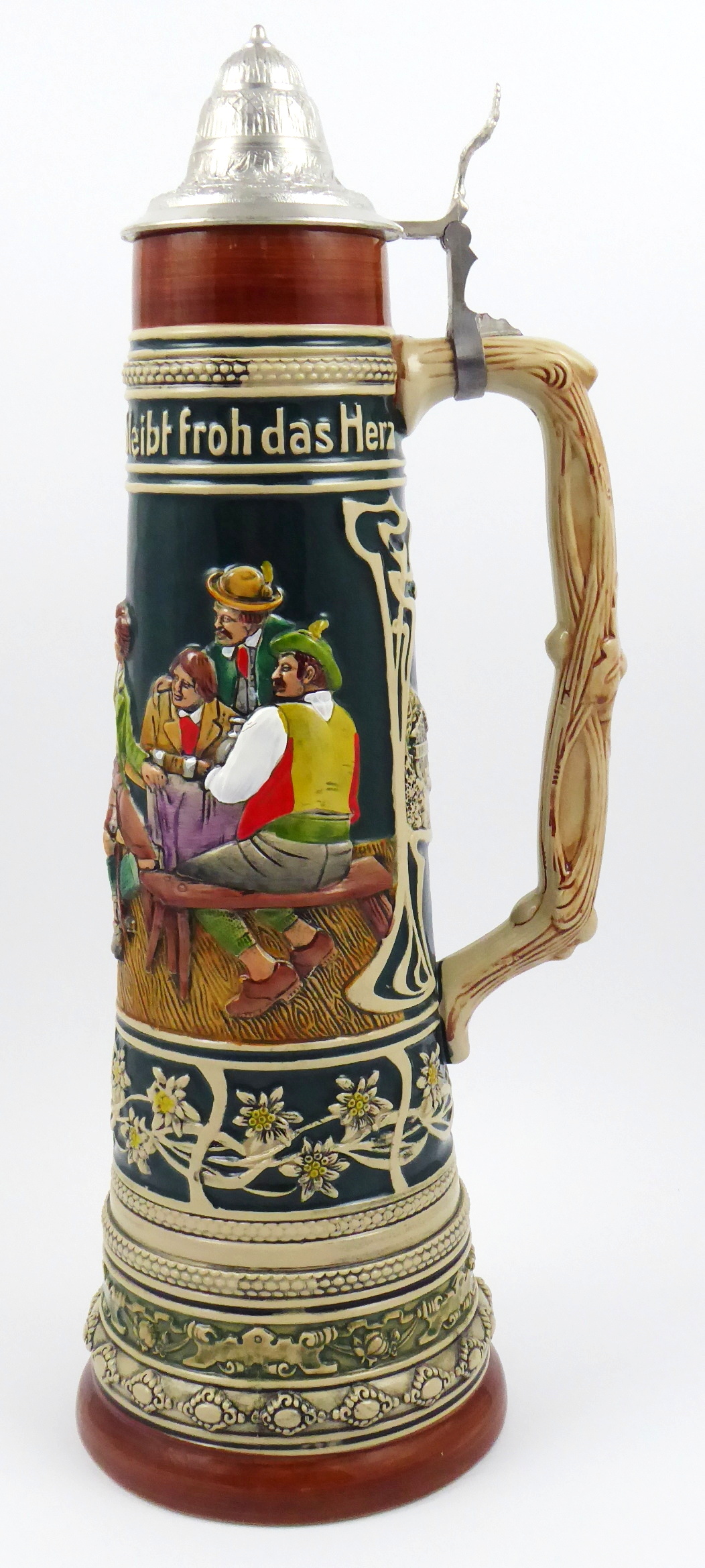 Barevná ručně malovaná keramika, cín. Manufaktura Simon Petr Gerz, Höhr-Grenzhausen, založená roku 1857. Velmi vysoký pivní korbel z ručně malované a barevně glazované keramiky zobrazující reliéfní postavy hospodských štamgastů tančících v dobovém oblečení. Dekor majestátního korbelu doplňují reliéfní ornamenty stylizovaných květů alpské protěže s listy a úponky. Pod víkem kolem celého těla korbelu reliéfní nápis v němčině na sytě zeleném poli: Bei Tang und Scherz bleibt froh das. (Při tanci a žertování zůstává srdce veselé). Zajímavě zdobený reliéfní úchyt a stylově dekorovaný cínový úchyt s okružím. Ve vynikajícím stavu. Značeno zespodu: W. GERMANY (Západní Německo), ORIGINAL GERZ, HANDARBEIT. Německo, Porýní-Falcko, Höhr-Grenzhausen 1960 – 1990. Výška 53 cm.