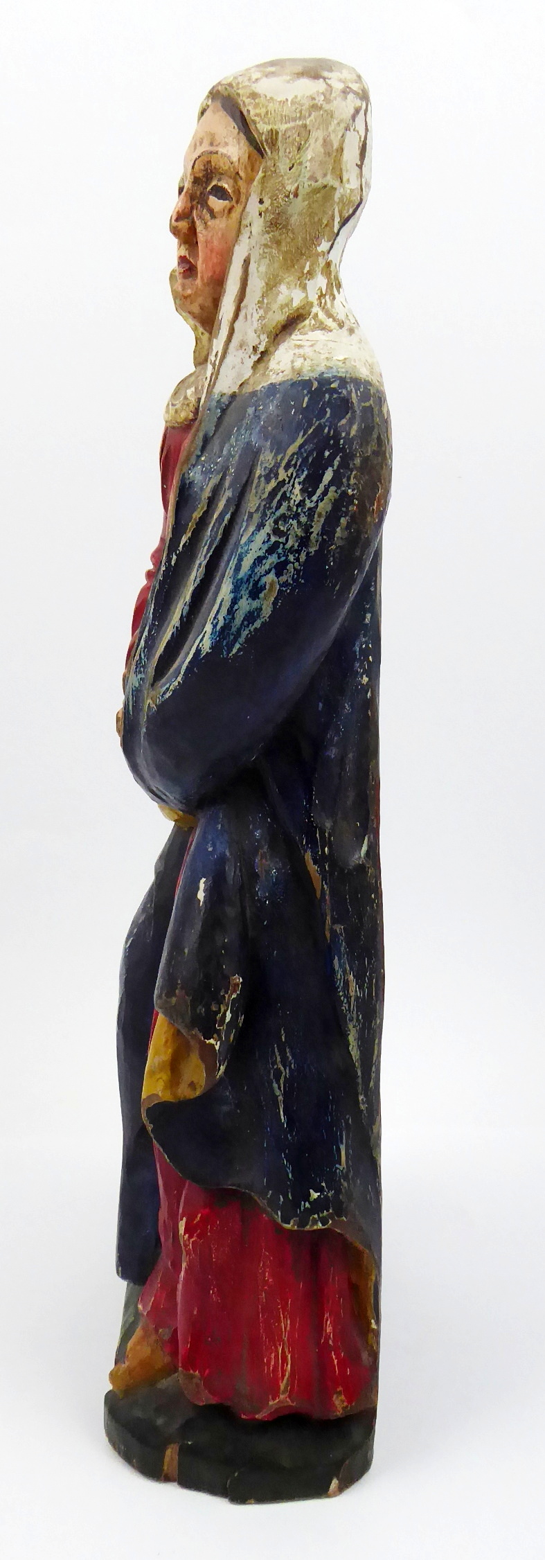 Dřevořezba, polychromie. Přiloženo osvědčení Národního památkového ústavu České republiky. Rustikálně pojatá dřevěná socha Panny Marie Bolestné, jež byla dříve zřejmě součástí Kalvárie. Panna Maria je vyřezána v čelním pohledu s rukama svěšenýma a sepjatýma. Hlava s bílým závojem mírně pozvednuta. Oděná je ve splývavý červený šat, přes něhož je přehozen modrý plášť se žlutou podšívkou. Zadní strana plně opracována. Na nízkém zeleném podstavci. Střední Evropa, 20. století. Výška 40 cm.
