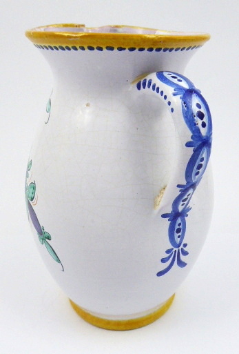 Ručně malovaná majolika. Vyšší, tzv. pyskatý, džbán z dílny Oldřicha Úředníčka. Džbán z ručně barevně malované majoliky v tradičním duchu slováckého lidového umění s velkými stylizovanými květy. S žlutými linkami na patce i hrdle doplněnými modrým punktováním. Ucho džbánu dekorováno ornamenty v barevnosti kobaltové modři. Na malé části hrdla vada glazury. Značeno zespodu: vtlačená značka výrobce UTO, vtlačené číslo a ručně černě psaná značka malíře. Slovácko, Tupesy, minulé století. Slovácko, Tupesy, minulé století. Výška 25 cm.