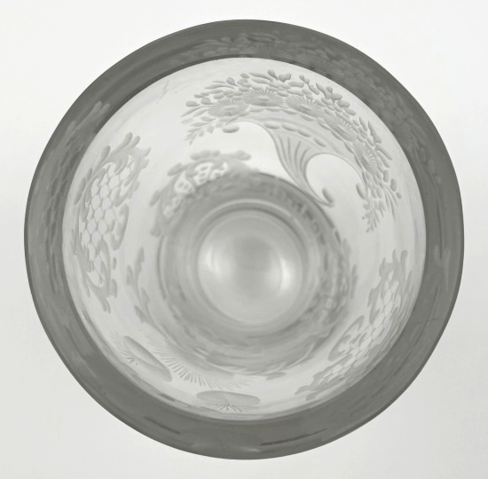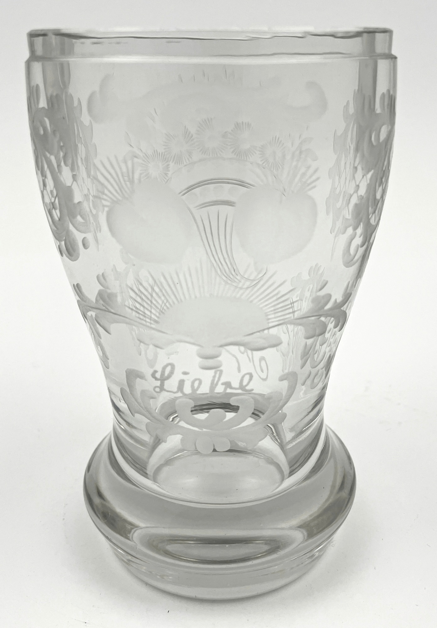 Bezbarvé ručně broušené sklo. Vyšší sklenice ze silnostěnného skla s nápisy v němčině – Liebe, Glück (Láska, Štěstí). Sklenice dekorovaná ručně broušeným rohem hojnosti, kartušemi s mřížkou, planoucími srdci i vycházejícím sluncem. Střední Evropa, minulé století. Výška 15 cm.