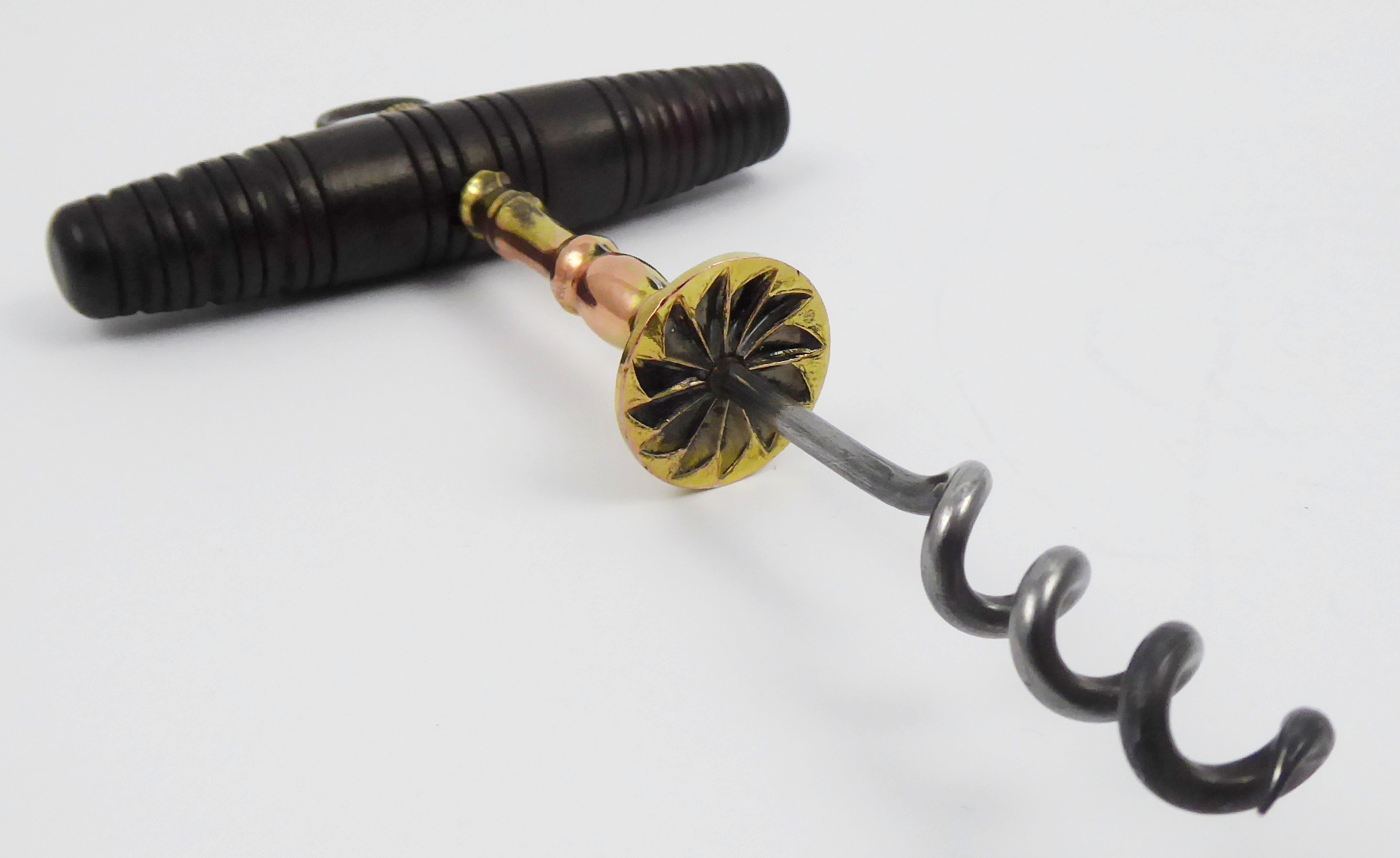 Ocel, leštěná mosaz, dřevo. Klasická vývrtka z oceli se zdobnou částí z reliéfně tvarované leštěné mosazi a dřevěným držadlem s dekorem drážek. Na horní části držadla kovové očko na případné zavěšení. Střední Evropa, první polovina minulého století. Výška bez očka na závěs 13,5 cm, výška s očkem na závěs 15,5 cm, šířka 9 cm.