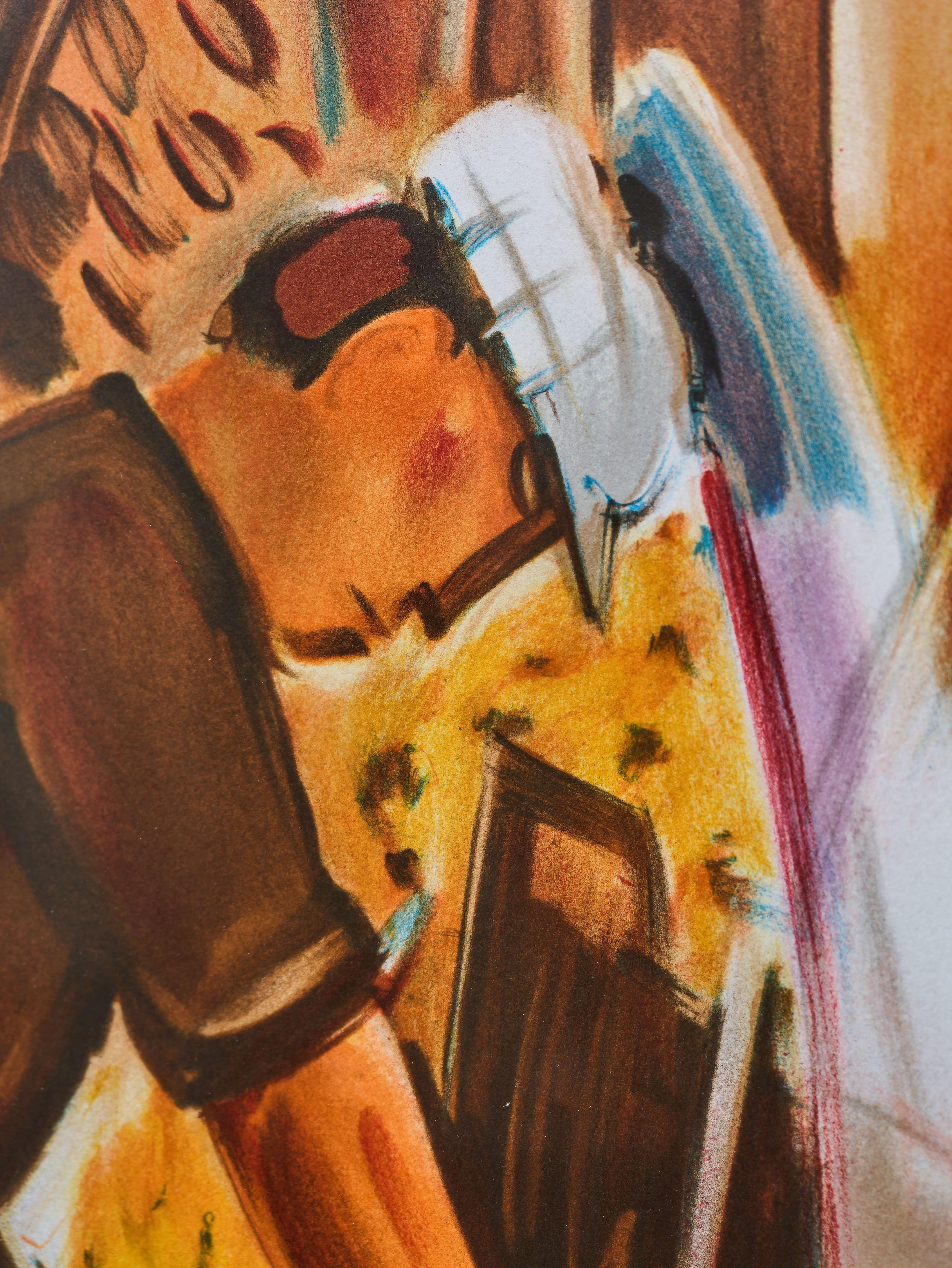 Barevná litografie belgického malíře Warda Lernouta, signovaná vpravo dole tužkou a označená zkušebním tiskem EA (Épreuve d’Artiste). Typicky expresivní figurální kompozice s venkovským námětem, charakteristická pro Lernoutovu tvorbu – teplé tóny, dynamické tahy a stylizované postavy. Ward Lernout (*1931, † 21.12.2019 Belgie) byl významný belgický malíř a grafik, jehož tvorba se vyznačuje expresivním rukopisem, teplou barevností a silným emocionálním výrazem. Patřil mezi uznávané představitele současného vlámského výtvarného umění.