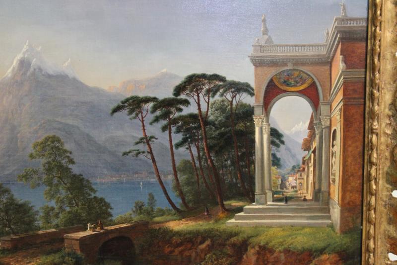 Velký, krásný a idylický obraz významného britského malíře Williama Henryho Pyna z let 1769–1843 malebné krajiny s jezerem v severní Itálii. Olej na plátně, rámováno v zdobeném rámu ze zlaceného dřeva. Signováno.