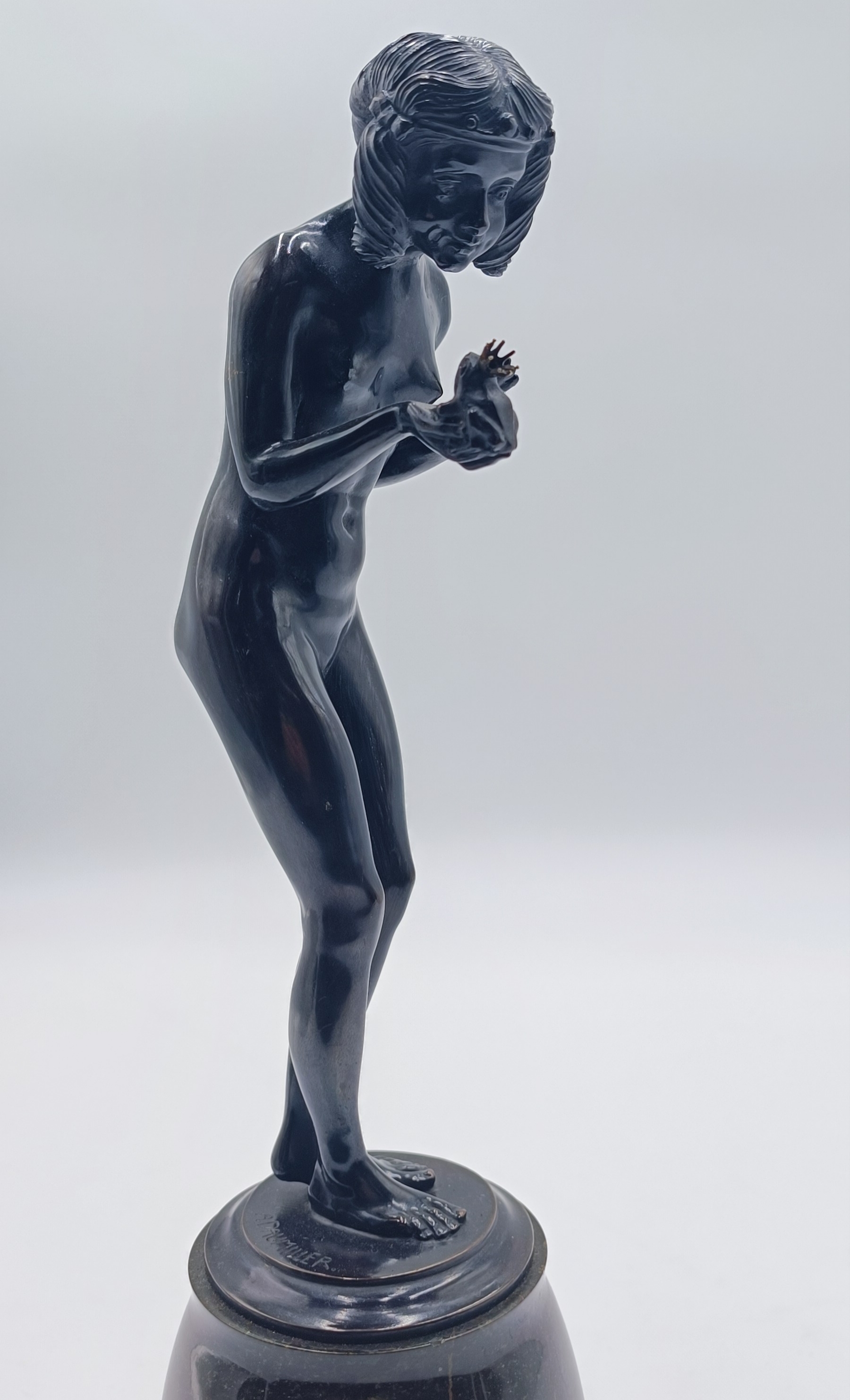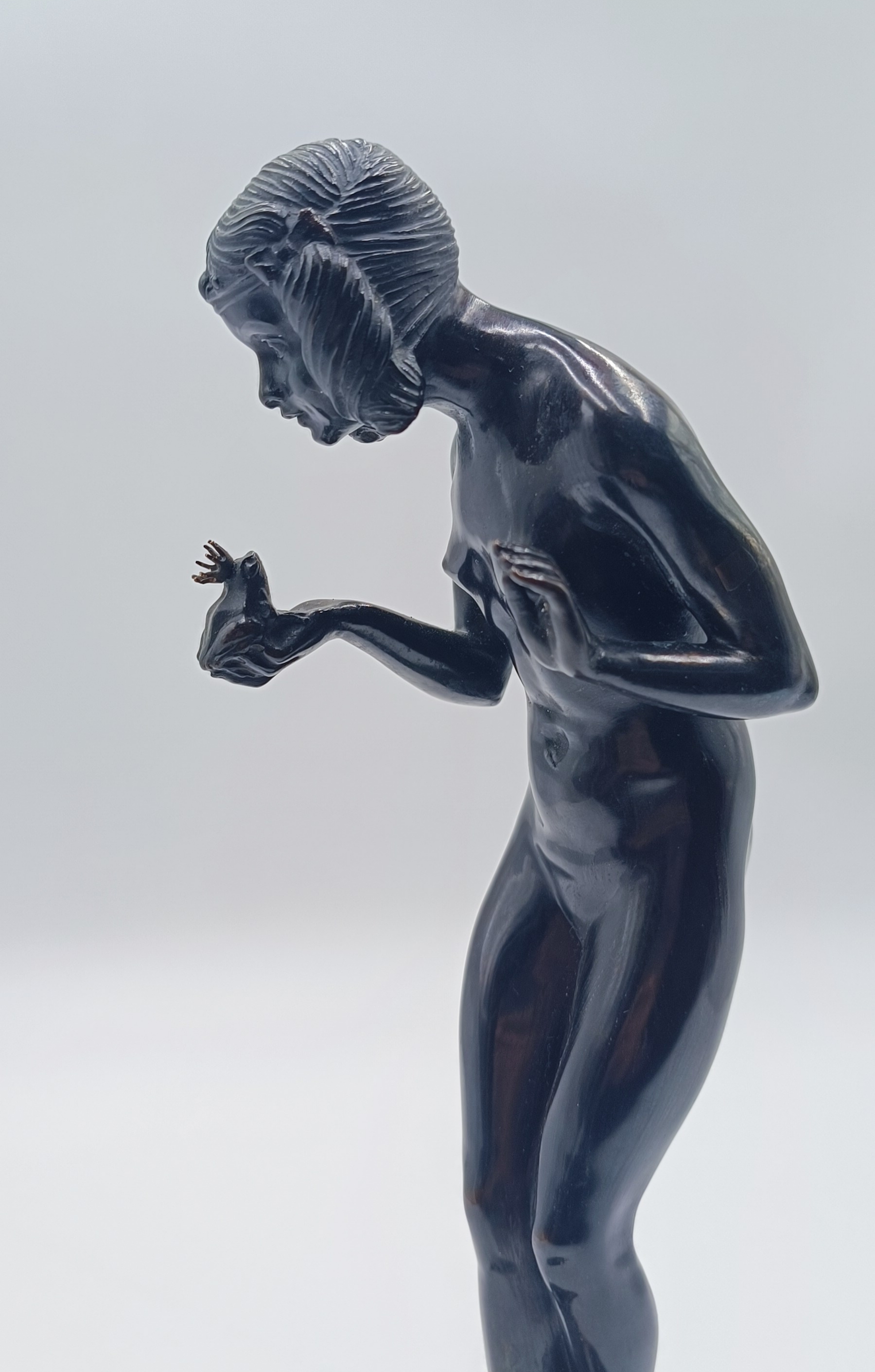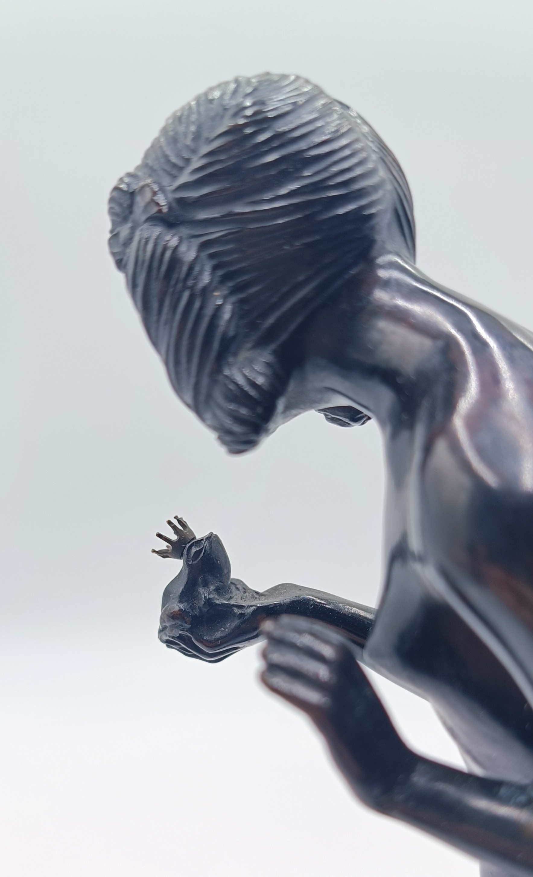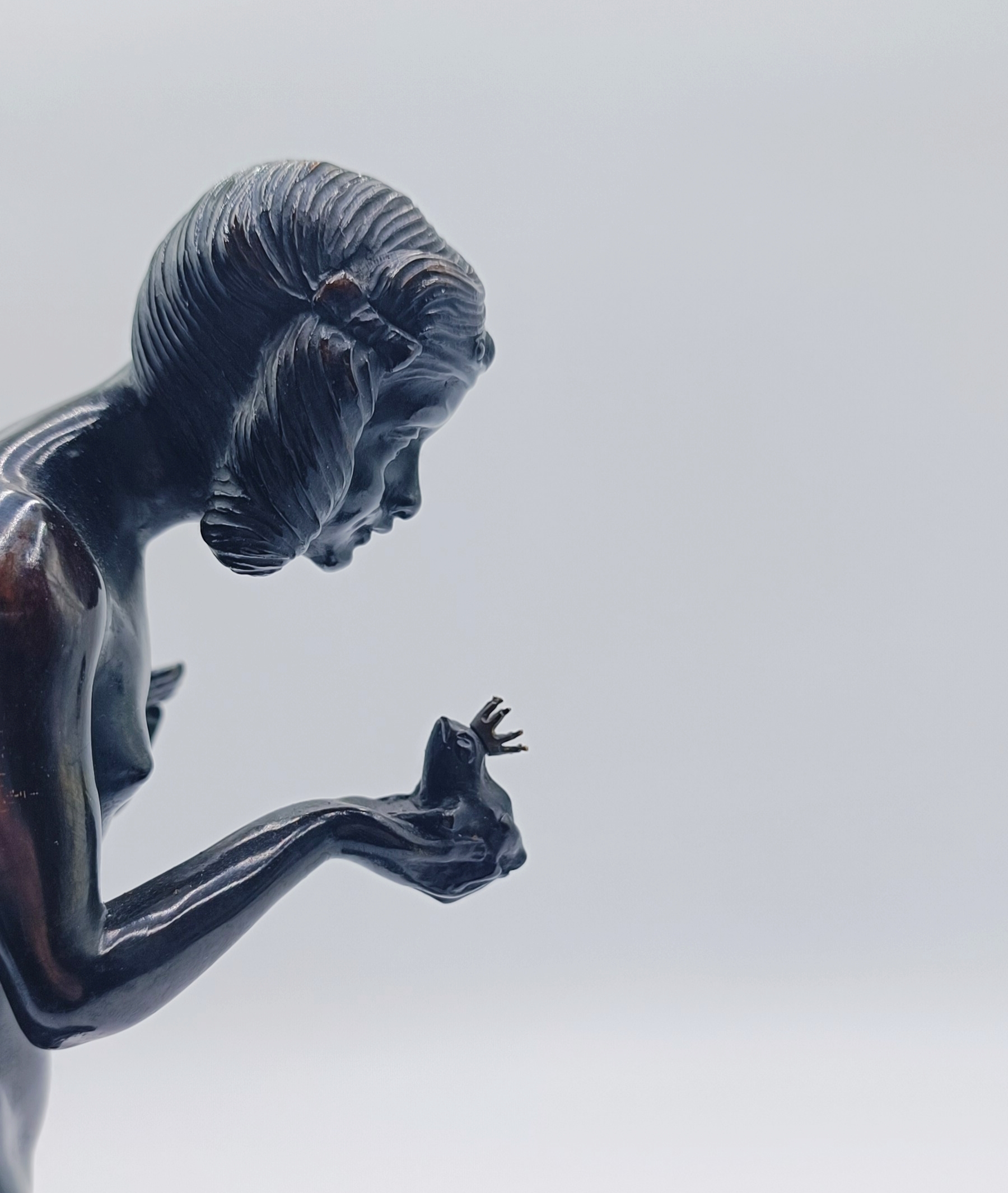 Secesní bronzová socha nahé ženy s žabím princem na dlani, detailně propracovaná socha, na serpentinovém podstavci. Autor Gustav Adolf Daumiller (1878-1962), Německo, kolem roku 1900; celková výška 34 cm, samotná socha 22,5 cm
