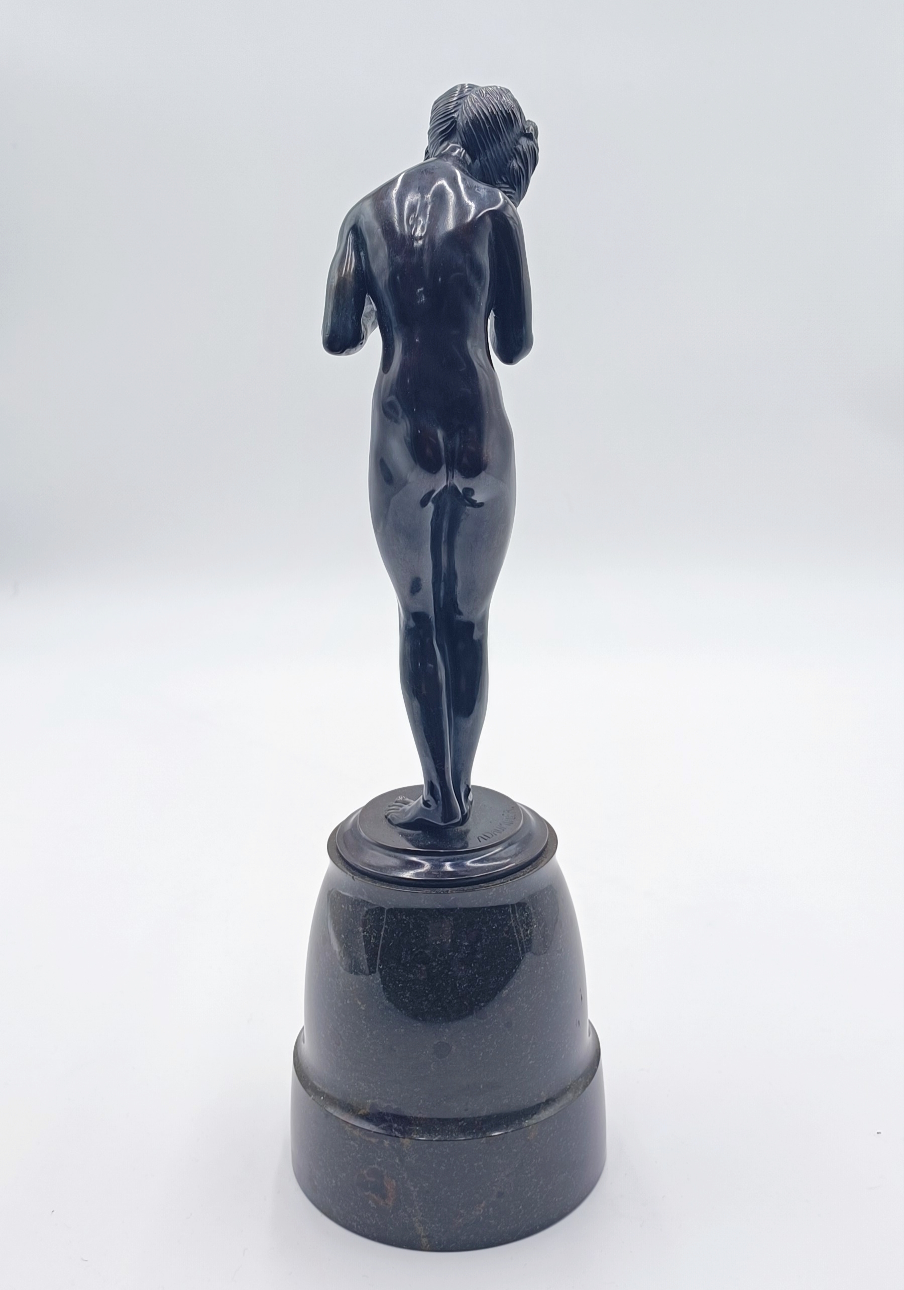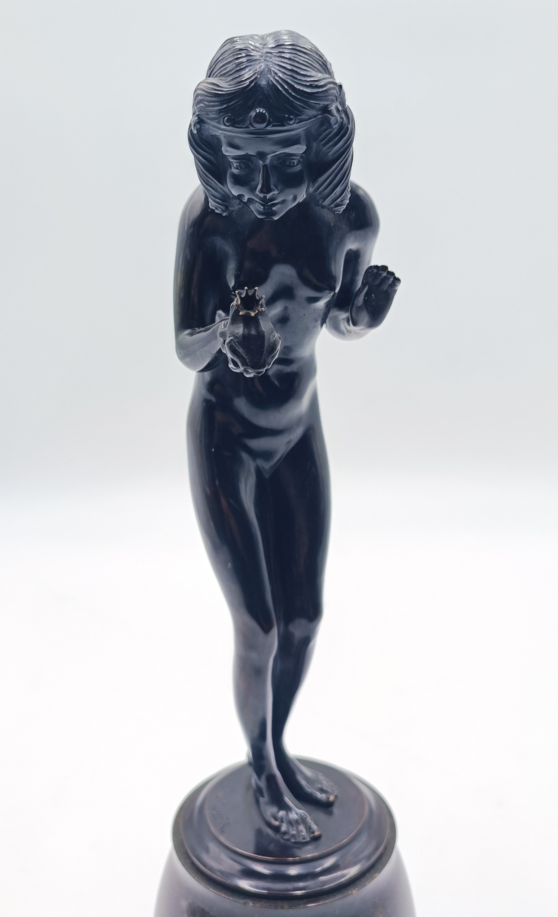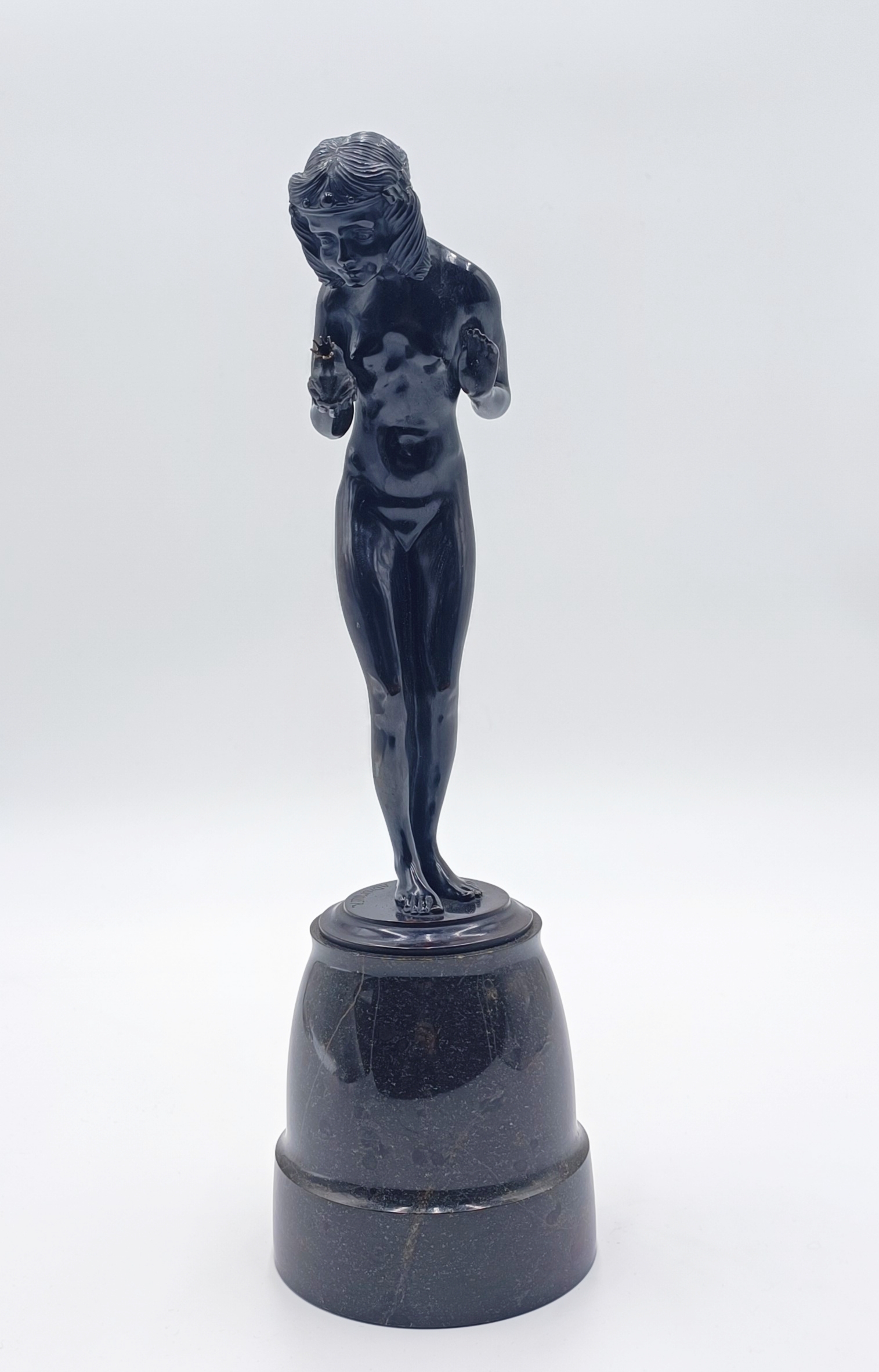 Secesní bronzová socha nahé ženy s žabím princem na dlani, detailně propracovaná socha, na serpentinovém podstavci. Autor Gustav Adolf Daumiller (1878-1962), Německo, kolem roku 1900; celková výška 34 cm, samotná socha 22,5 cm