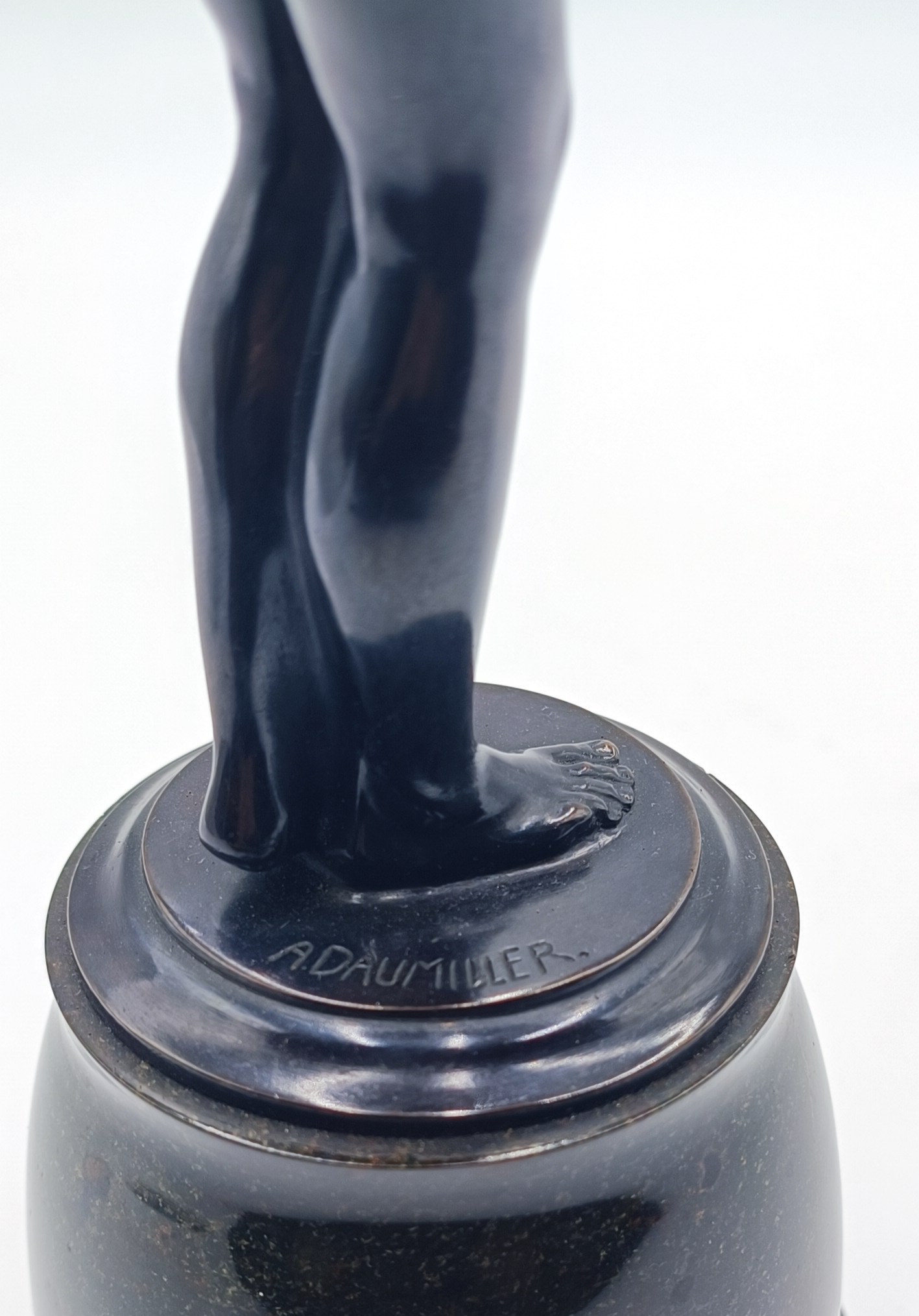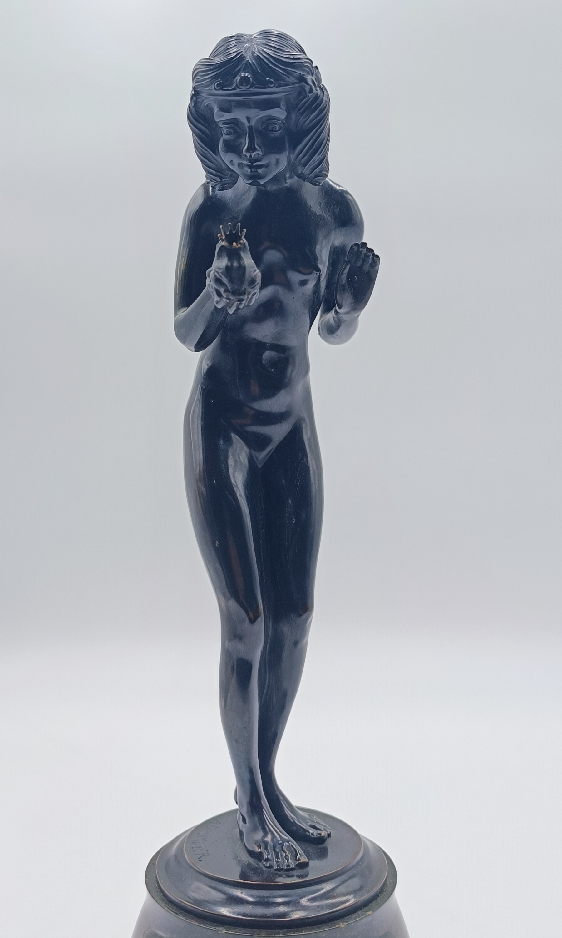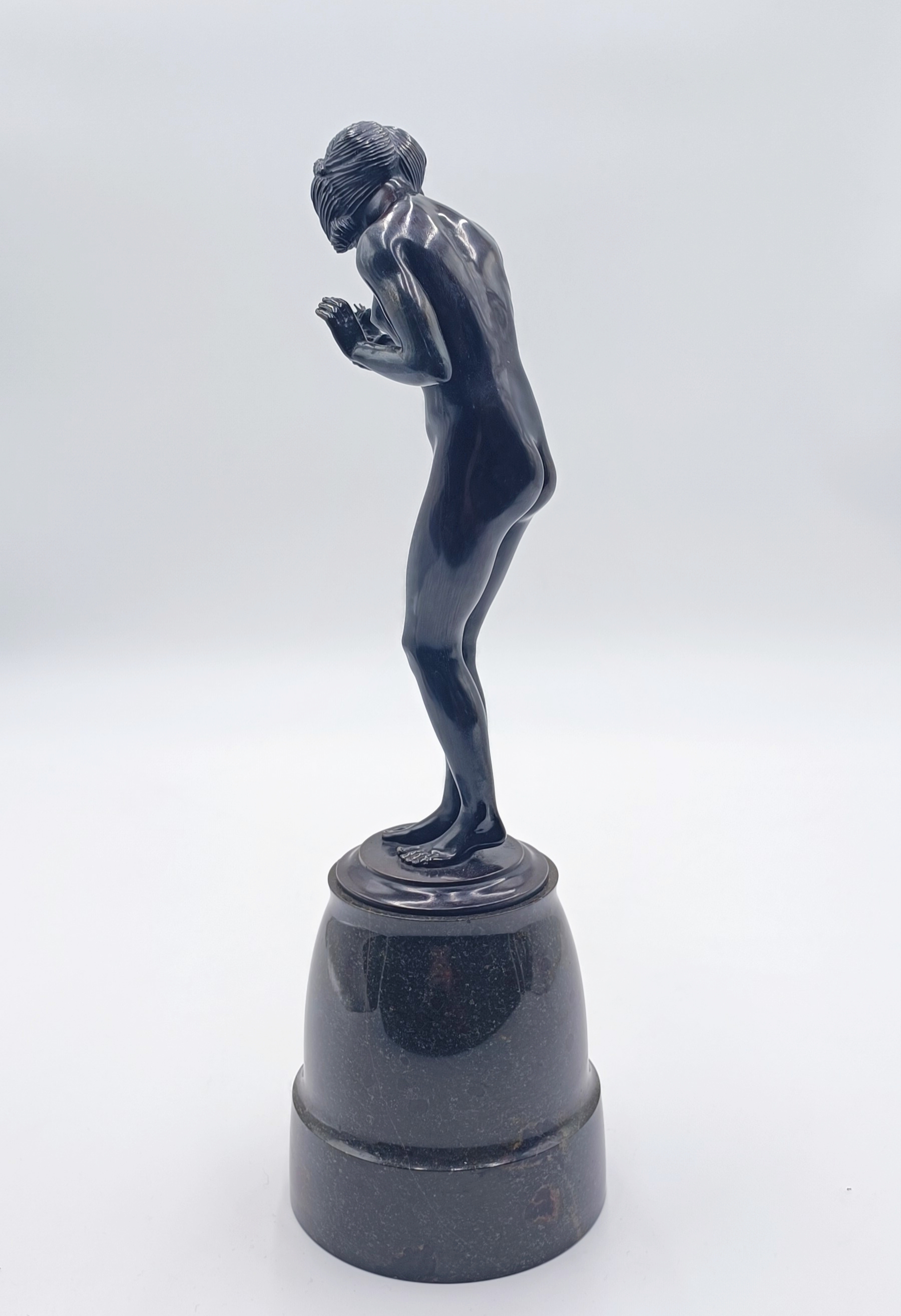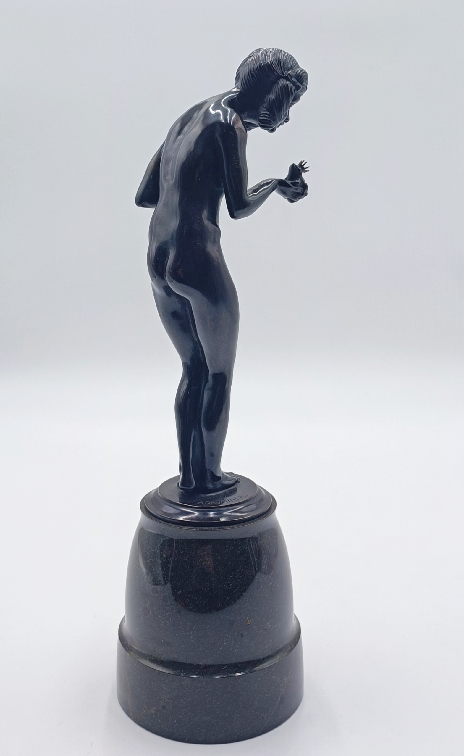 Secesní bronzová socha nahé ženy s žabím princem na dlani, detailně propracovaná socha, na serpentinovém podstavci. Autor Gustav Adolf Daumiller (1878-1962), Německo, kolem roku 1900; celková výška 34 cm, samotná socha 22,5 cm
