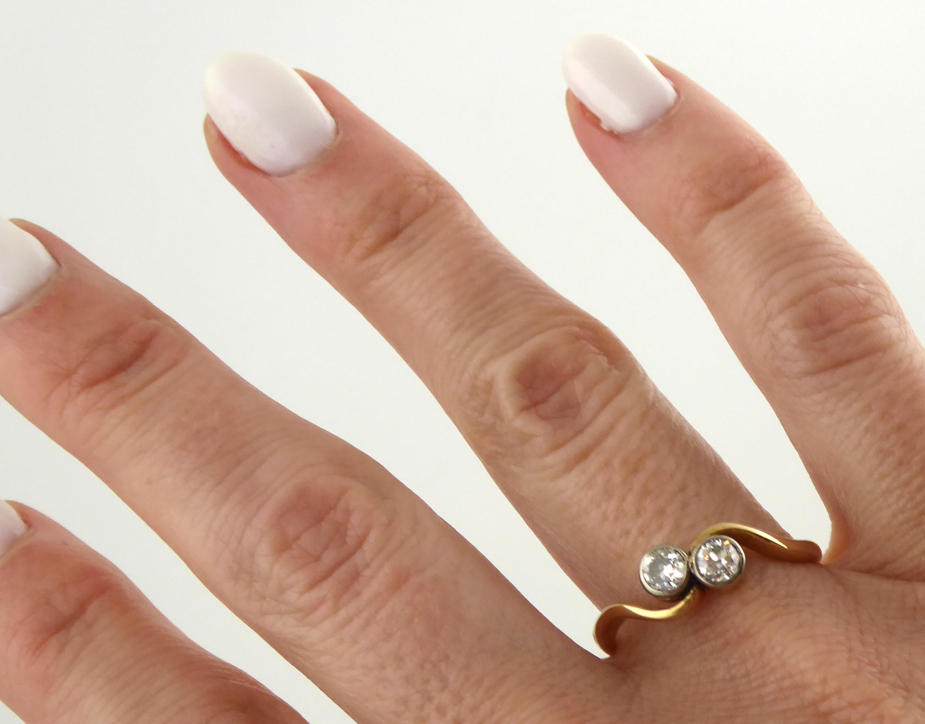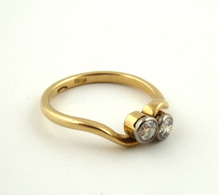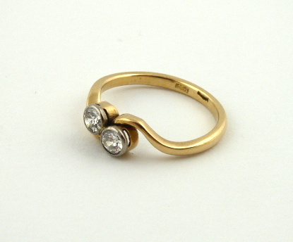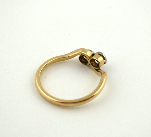 Sedmnáctikarátové žluté zlato, přírodní diamanty. Ryzost Au 710/1000, celková hmotnost 3,65 g. Dva přírodní diamanty starého briliantového brusu o váze 0,50 ct, barva G, čistota P3. Přiloženo osvědčení Puncovního úřadu České republiky. Zlatý prsten s elegantním designem motivu vlnovky kolem korunek osázených párovými přírodními diamanty o hmotnosti 0,50 ct. Evropa, první polovina minulého století. Velikost prstenu 60.