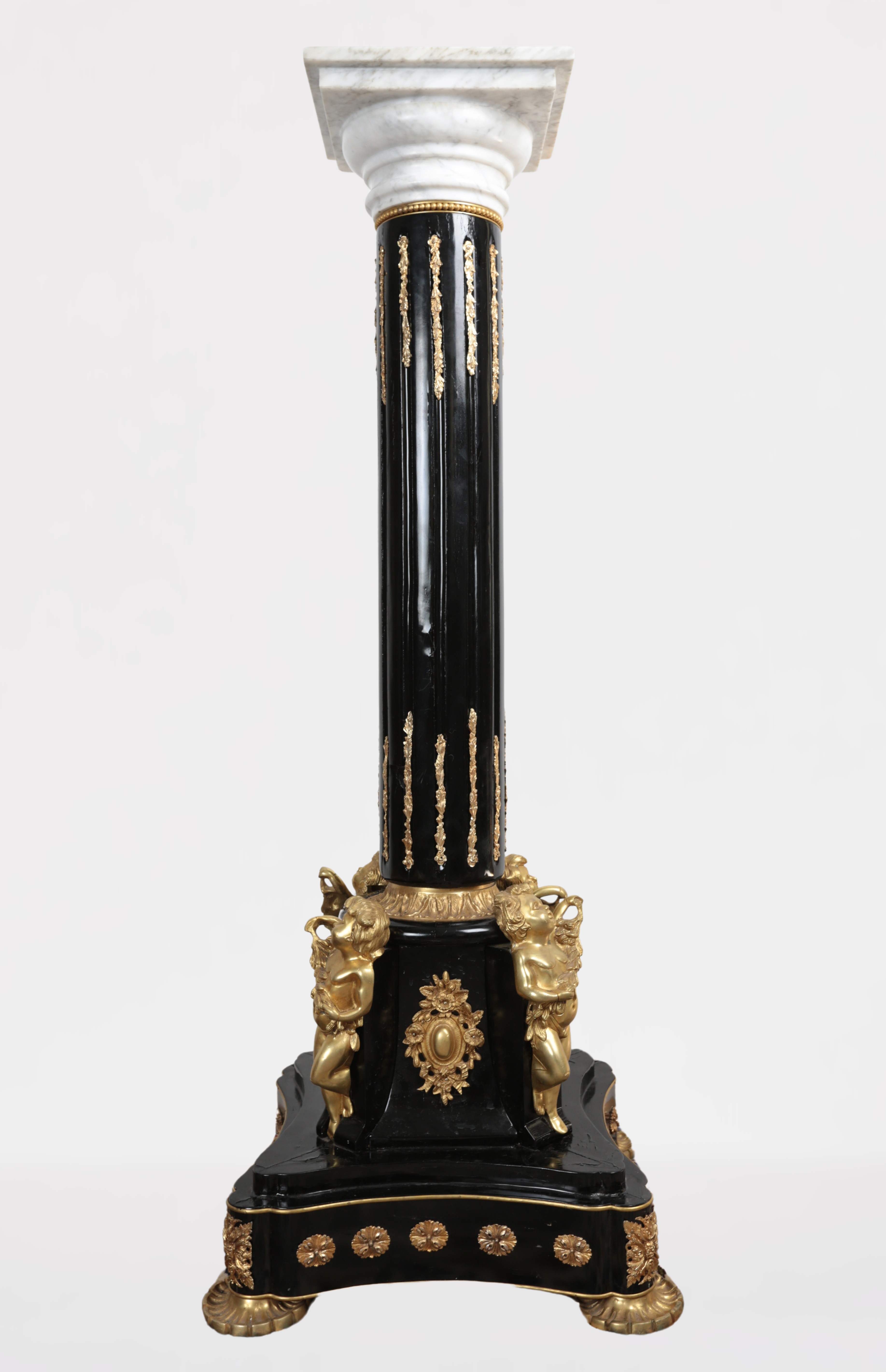 Velký a těžký podstavec z masivního lakovaného dřeva s vrchní hlavicí z kararského mramoru a litými figurálními ozdobami ze zlaceného bronzu. Stav: podstavec je pevný, bez červotoče. Datace: 20. století.