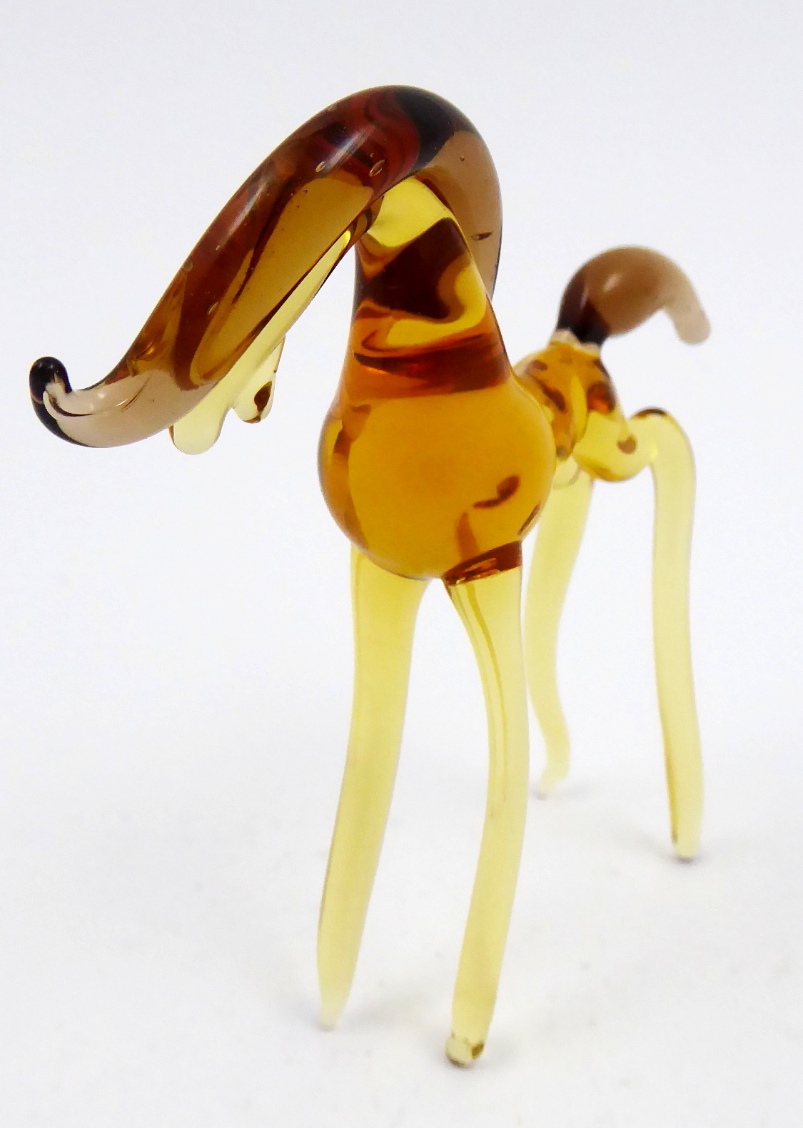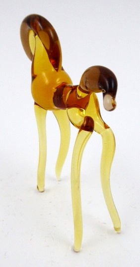 Vinuté a tažené jantarové sklo. Tehdejší národní podnik Železnobrodské sklo. Figurka koníka s vlající hřívou z jantarového vinutého a taženého skla. V perfektním stavu. Československo, Železný Brod, 60. léta minulého století. Výška 7,3 cm.