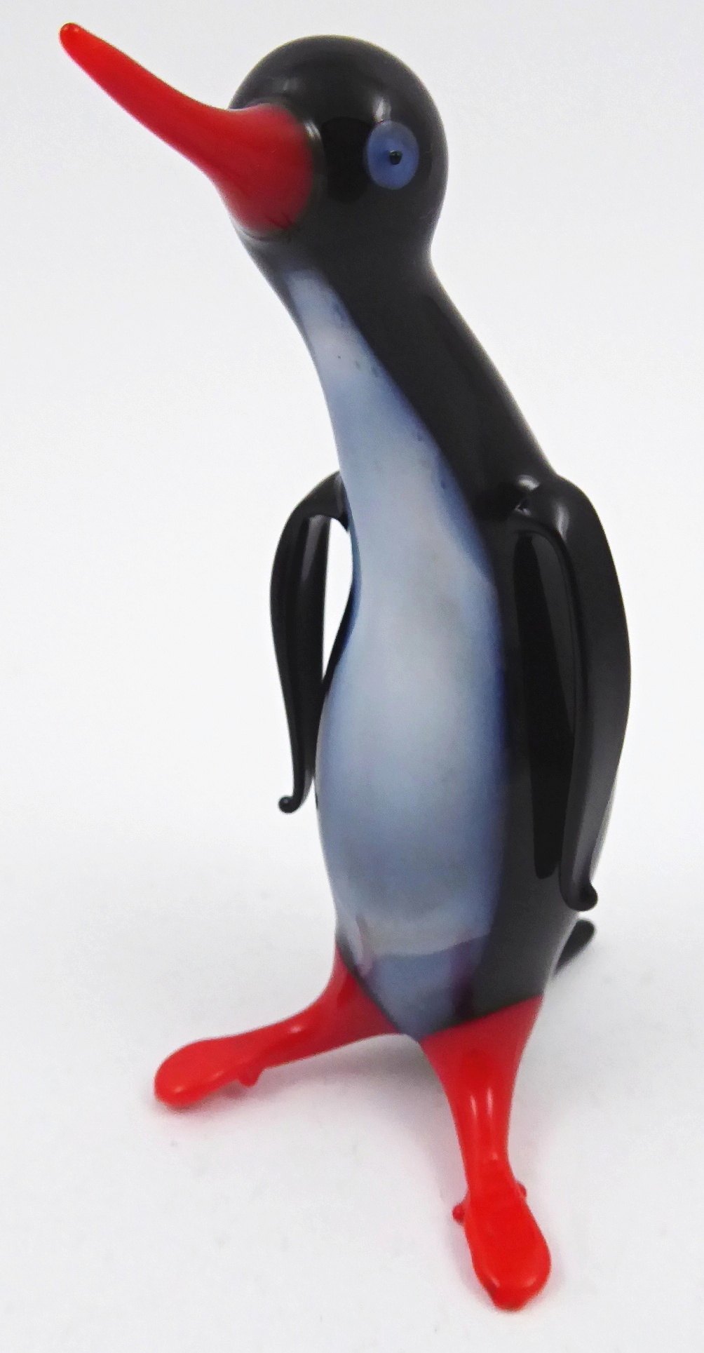 Ručně barevně malované a ručně foukané sklo tvarované nad kahanem. Tehdejší národní podnik Železnobrodské sklo. Figurka tučňáka v pozoru na hlídce z ručně barevně malovaného a ručně foukaného skla tvarovaného nad kahanem. V perfektním stavu. Československo, Železný Brod, 60. až 80. léta minulého století. Výška 9 cm.