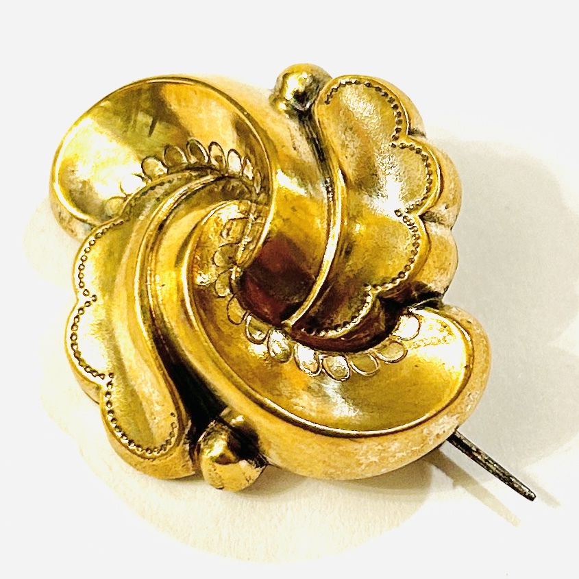 Starožitná brož z období biedermeieru v podobě stylizovaného uzlu, jednotlivé plastické části inspirované florální estetikou, zdobeno rytím. Kvalitní středoevropská zlatnická práce z poloviny 19. století. Vyrobeno technikou dutého kovu.